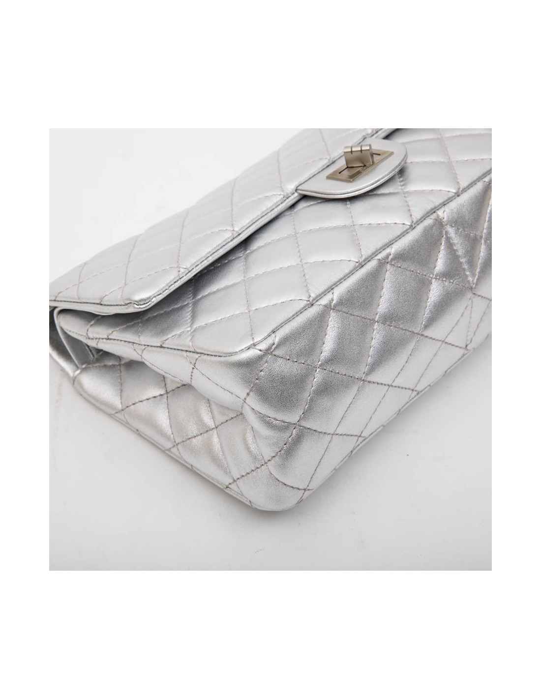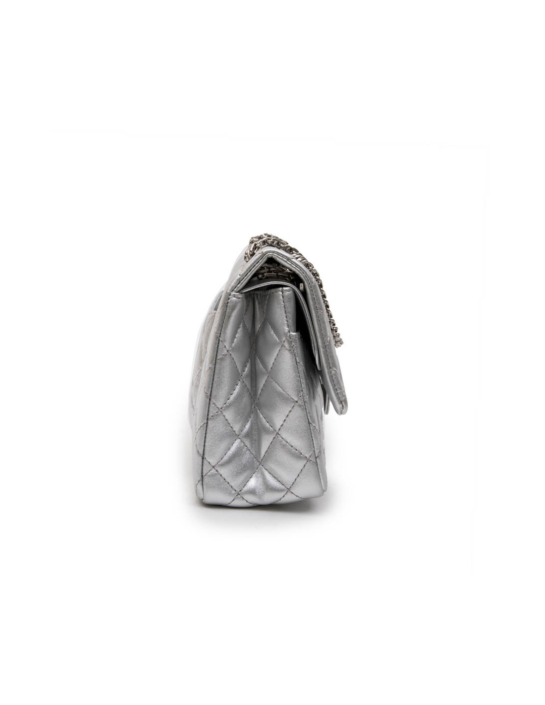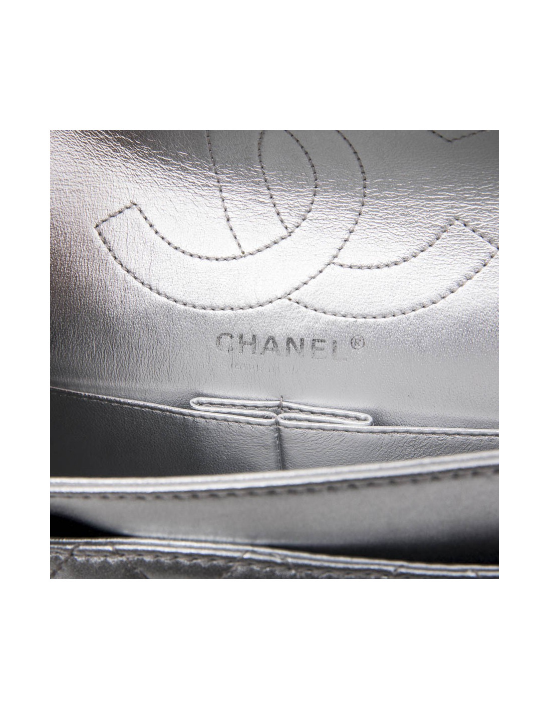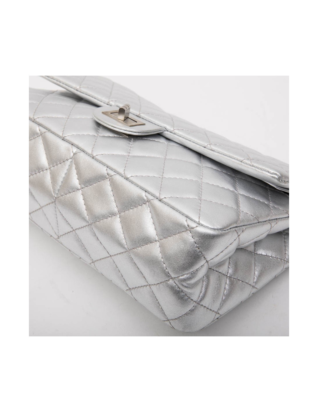Sac 'Timeless' Chanel en cuir matelassé argenté. Fermoir 2.55. Bijouterie argentée mate. Double rabat. L'intérieur est entièrement doublé en cuir argent. Made in France.