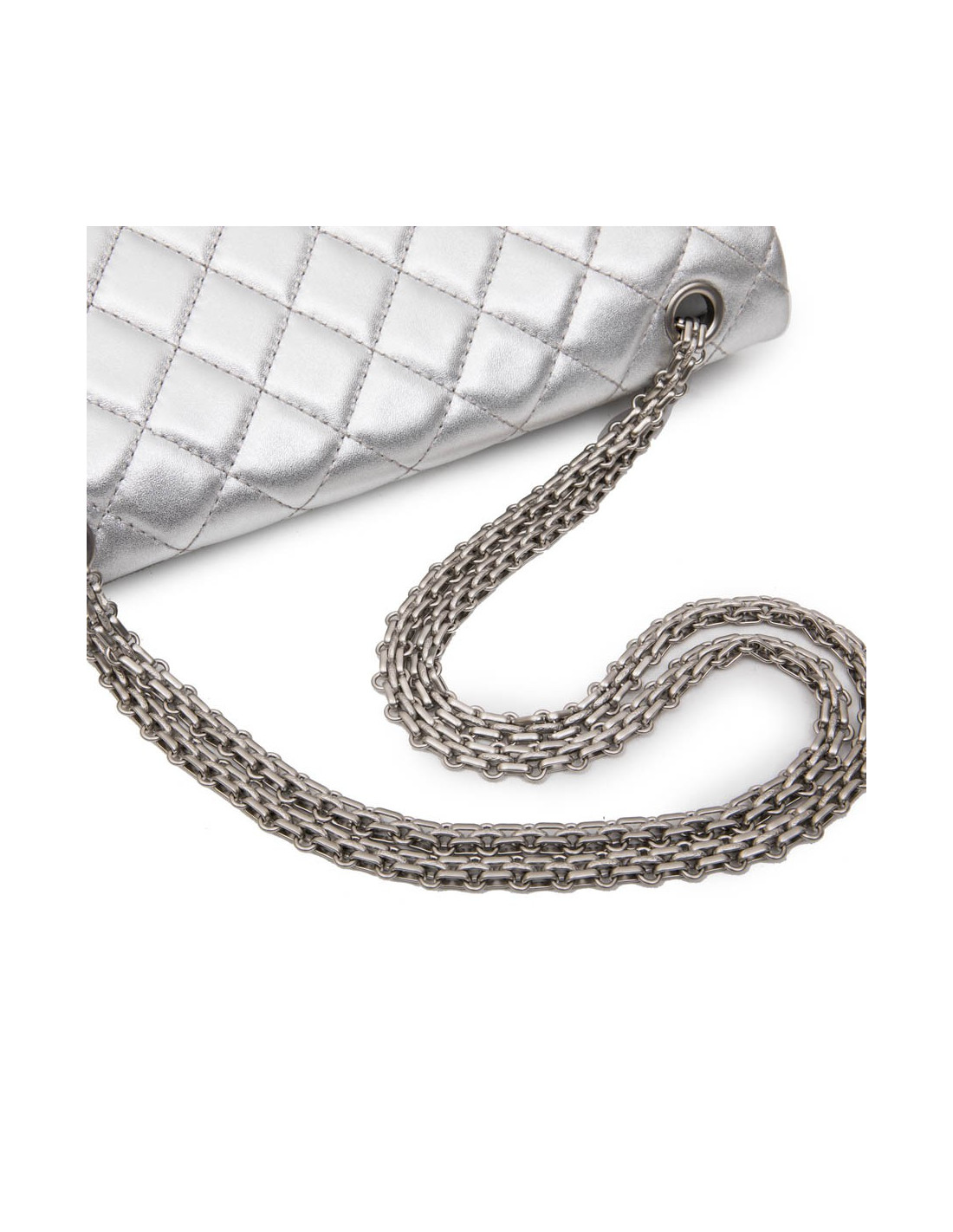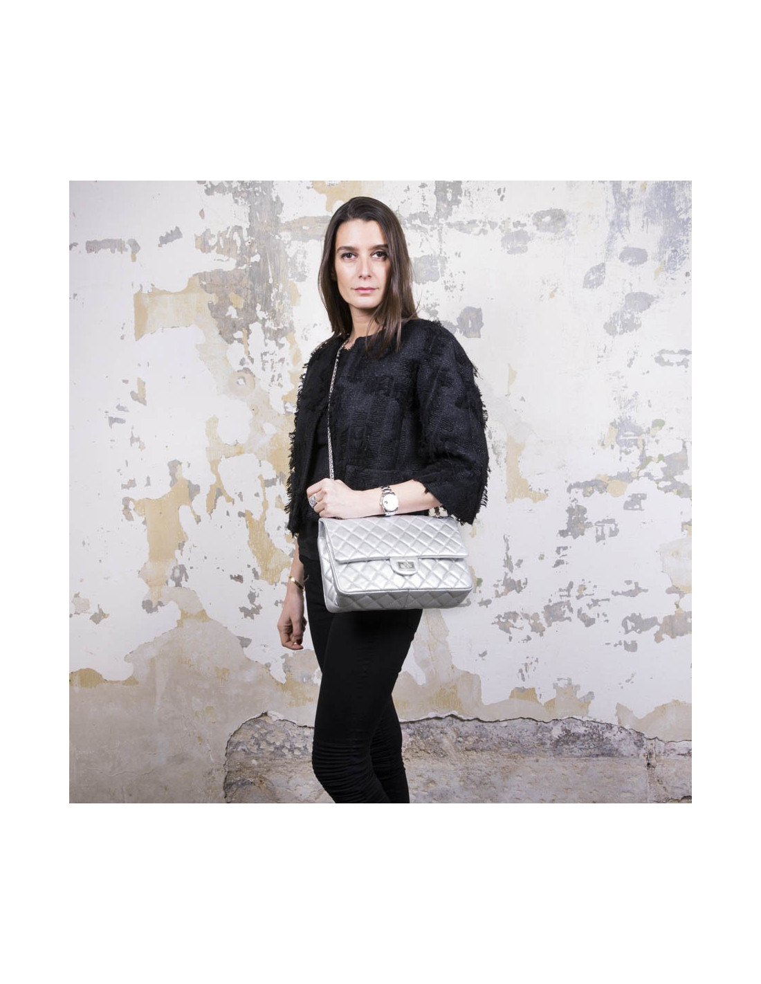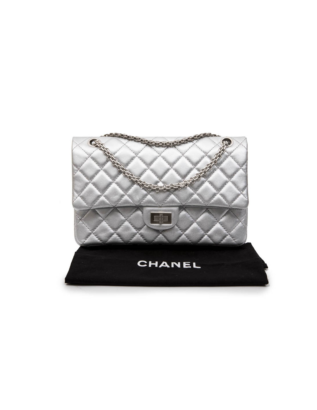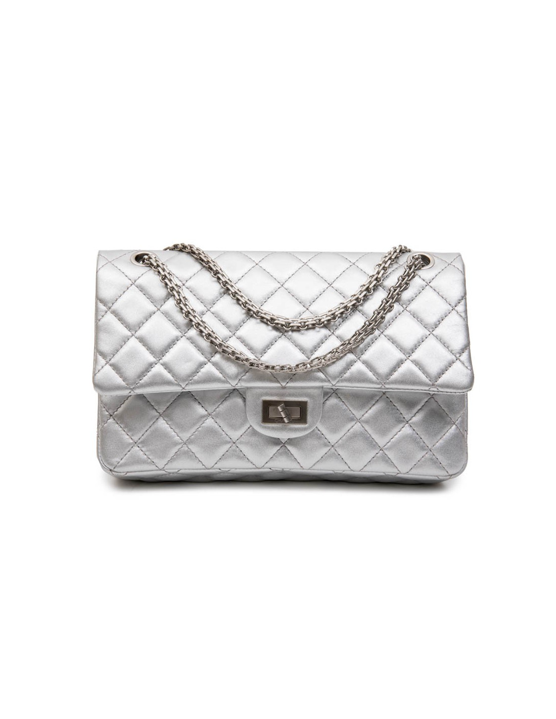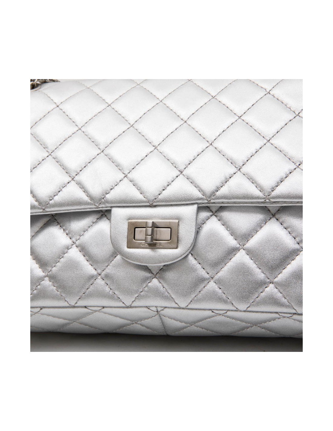 Sac 'Timeless' Chanel en cuir matelassé argenté. Fermoir 2.55. Bijouterie argentée mate. Double rabat. L'intérieur est entièrement doublé en cuir argent. Made in France.