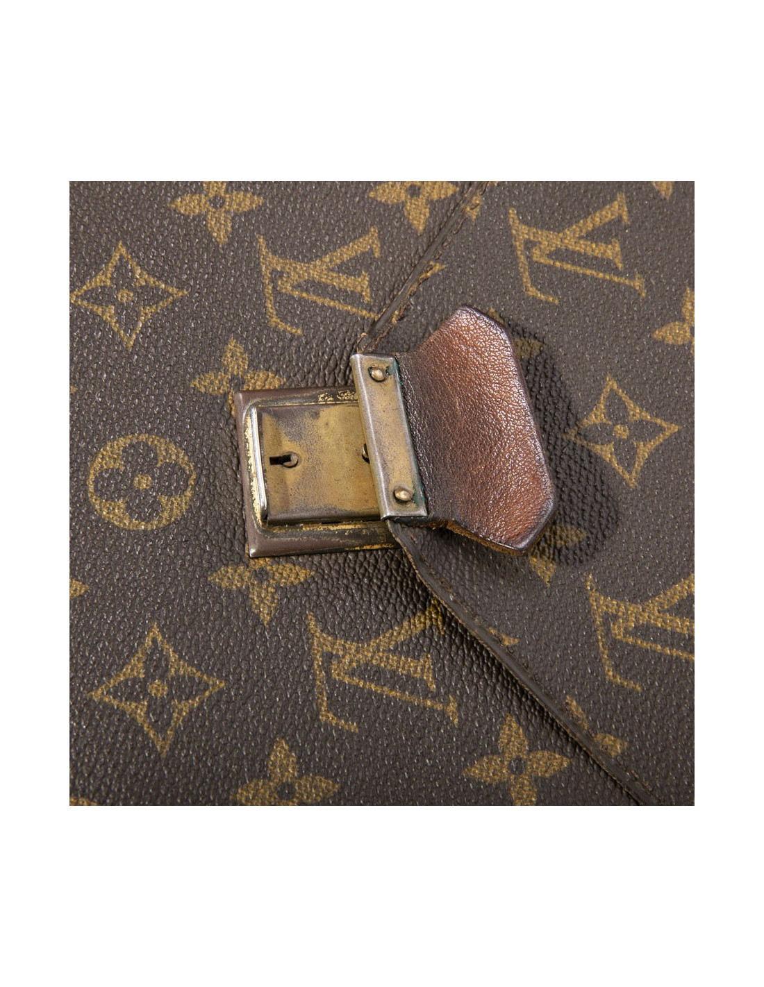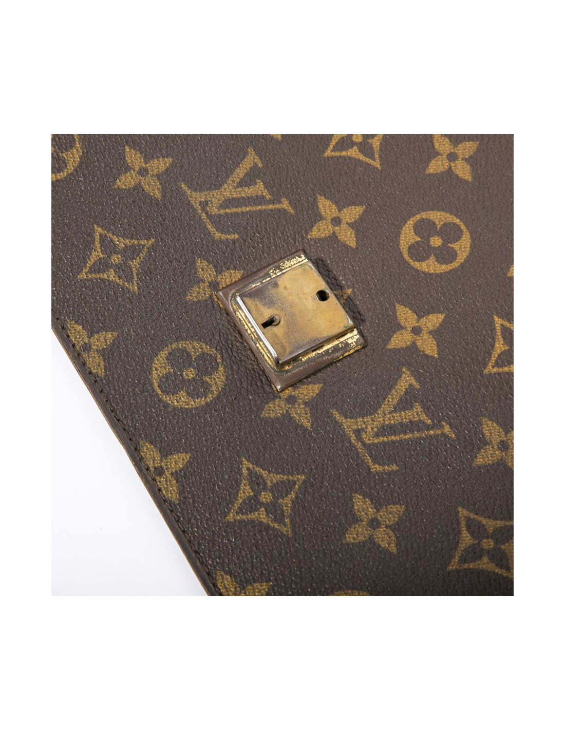 Pochette Louis Vuitton en toile Monogram enduite marron vintage. Fermeture serrure (plus de clés). Bijouterie dorée patinée. Doublure intérieure en cuir