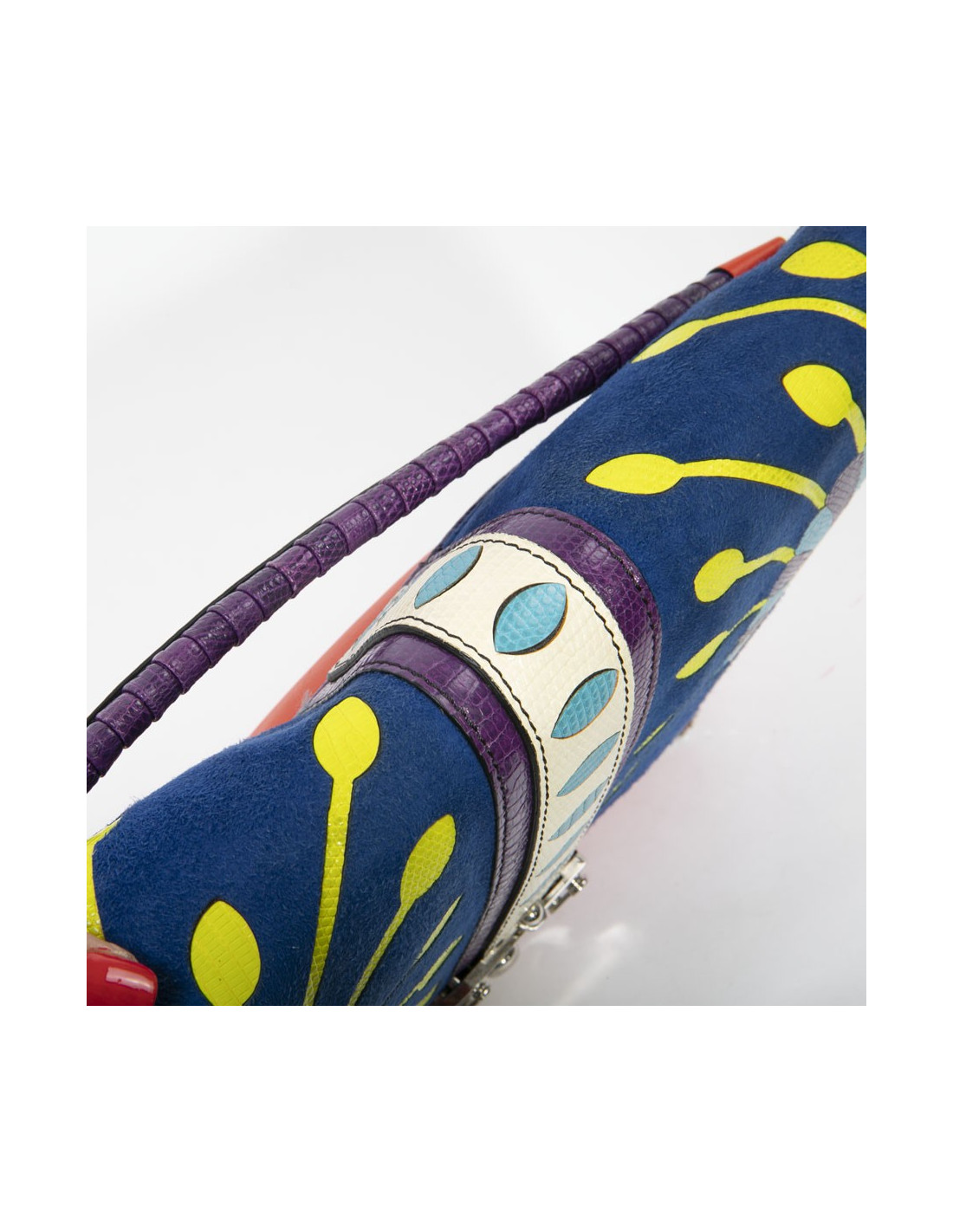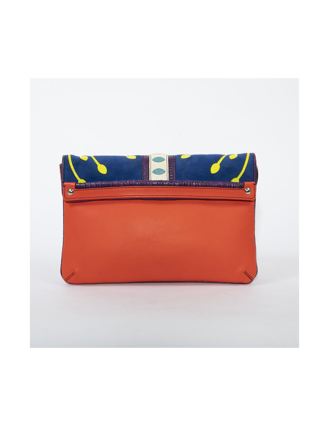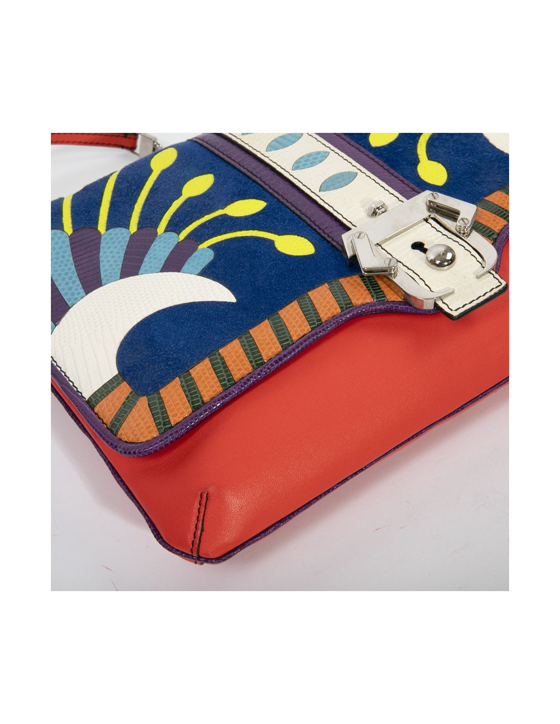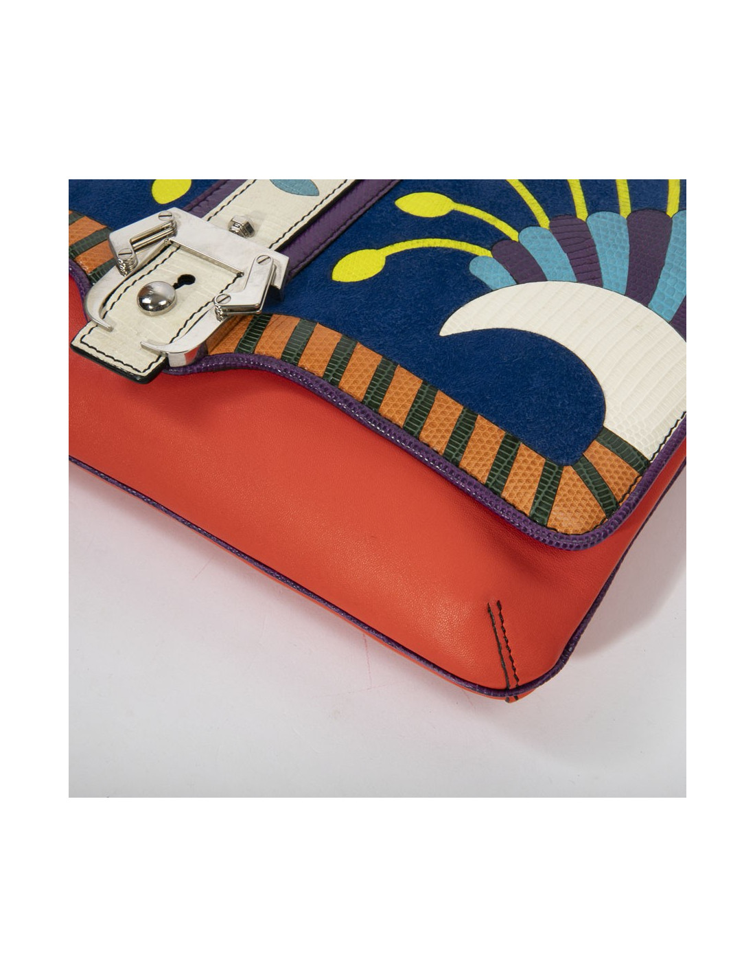 Sac en cuir multicolore et veau velours, lezard. La doublure est en cuir rouge avec 3 poches dont une zippée. Bijouterie argent. Il se porte comme une pochette avec une anse à l'arrière ou avec une bandoulière amovible. Made in Italy. Fermeture du rabat par bouton pression.