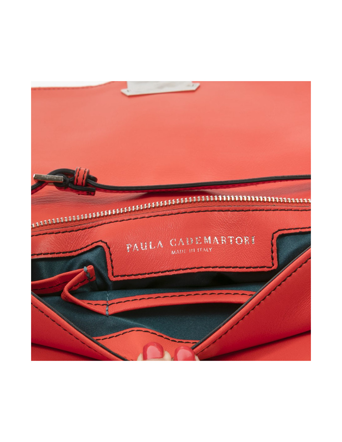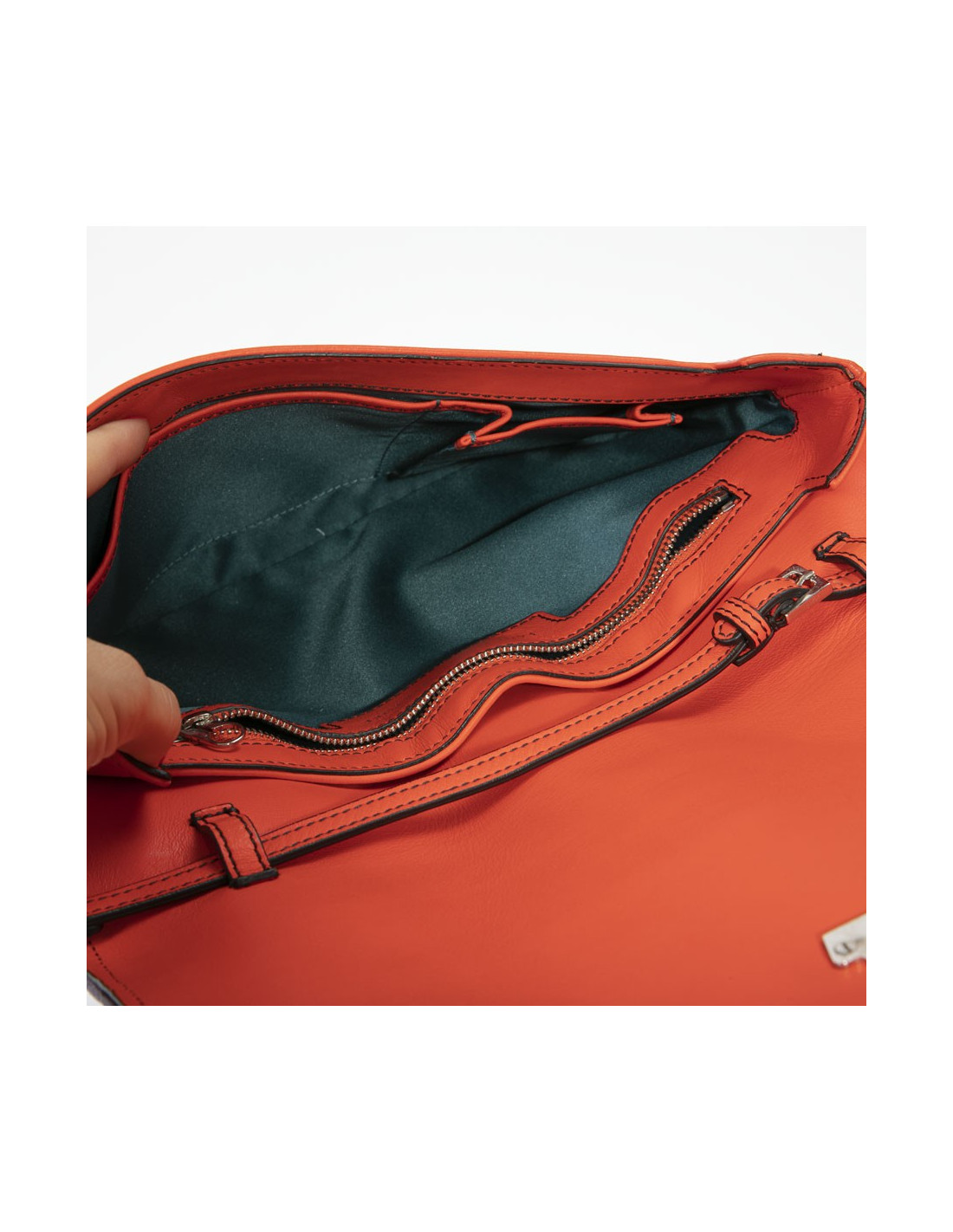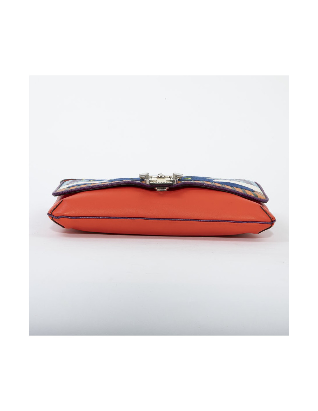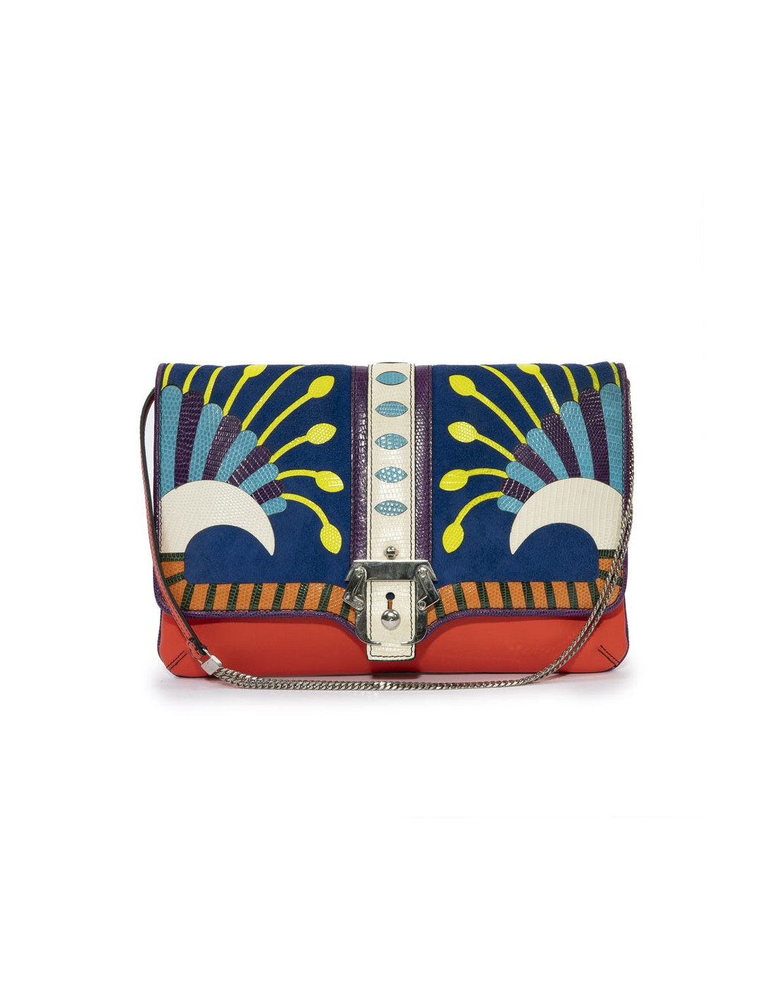 Sac en cuir multicolore et veau velours, lezard. La doublure est en cuir rouge avec 3 poches dont une zippée. Bijouterie argent. Il se porte comme une pochette avec une anse à l'arrière ou avec une bandoulière amovible. Made in Italy. Fermeture du rabat par bouton pression.