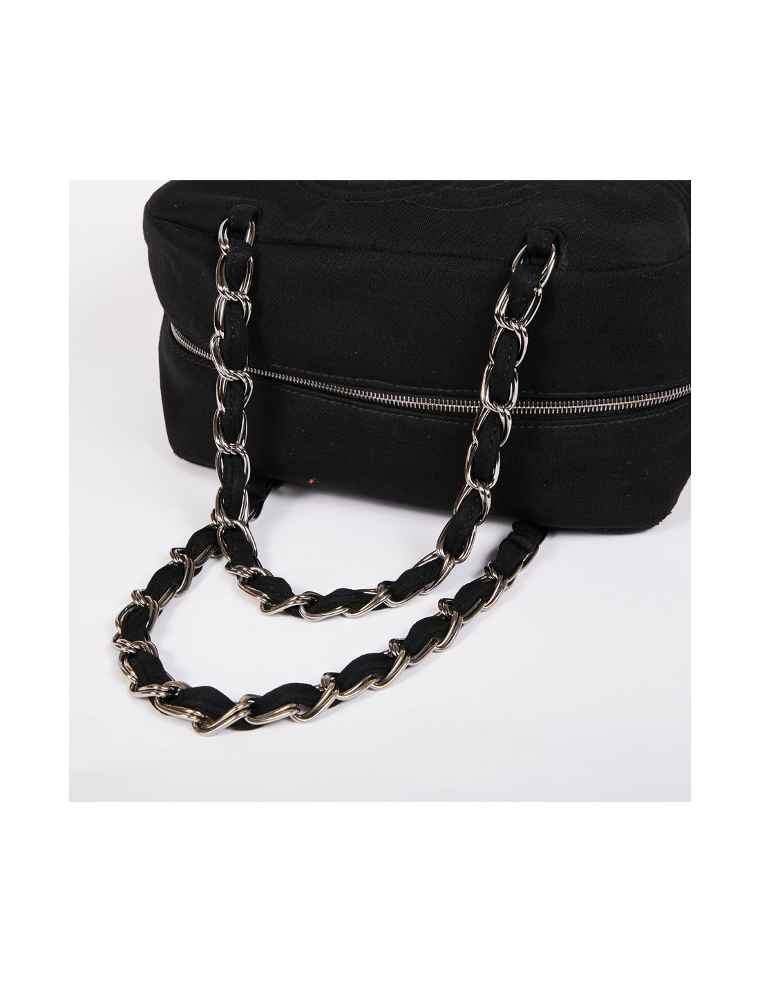 Ce sac CHANEL, modèle bowling avec l'accastillage en métal argent palladié. Fermeture à glissière. La tirette est en cuir. La doublure intérieure est en tissu noir siglé, avec une poche plate zippée. L'anse est en métal entrelacé de tissu jersey. Sur une des faces extérieure un " CC" (dans la matière du sac) est dessiné. Le sac est en bon état (les 2 coins à l'avant ont un petit trou).