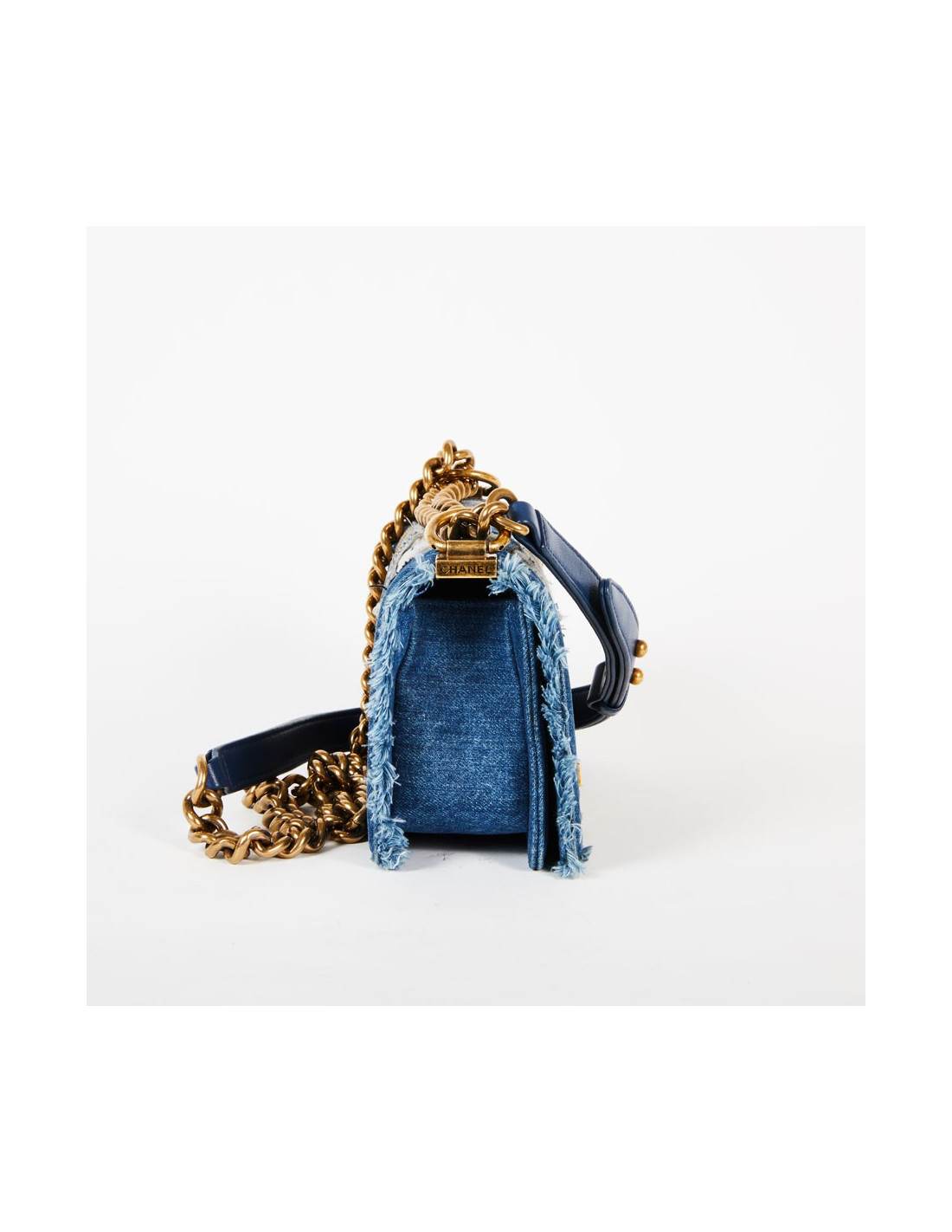 Encore un best seller chez Valois Vintage Paris avec ce sac Boy petit modèle de la Maison Chanel, un patchwork de denim. Il est en parfait état. L'intérieur est en tissu bleu marine avec une petite poche plate. L'accastillage est de couleur dorée vieilli. Le fermoir "BOY" est siglé "CC".
