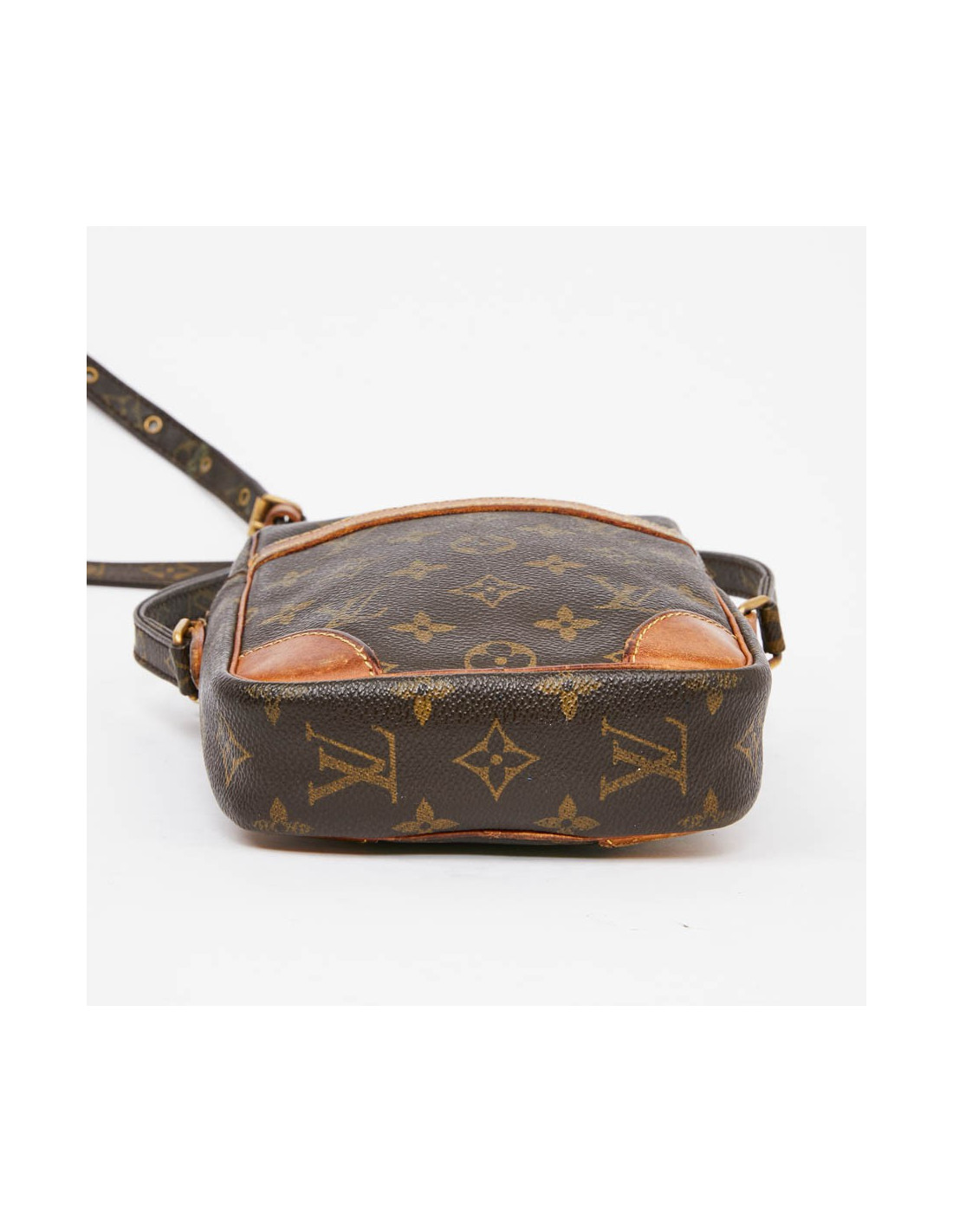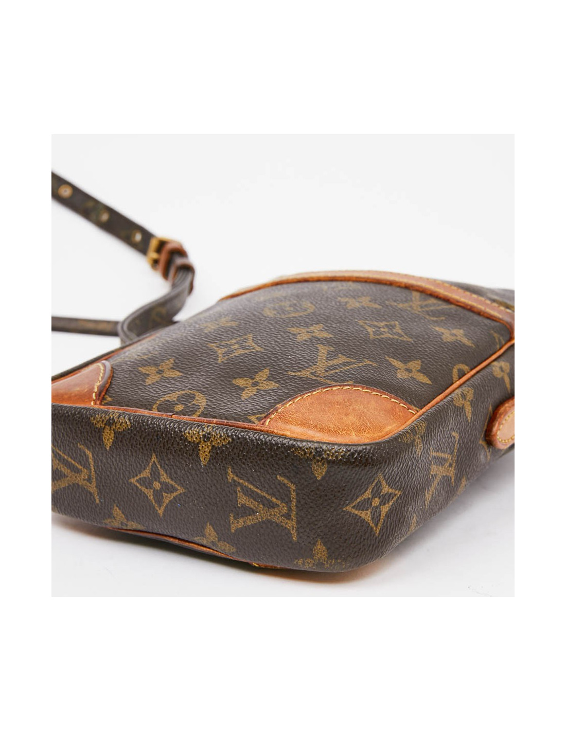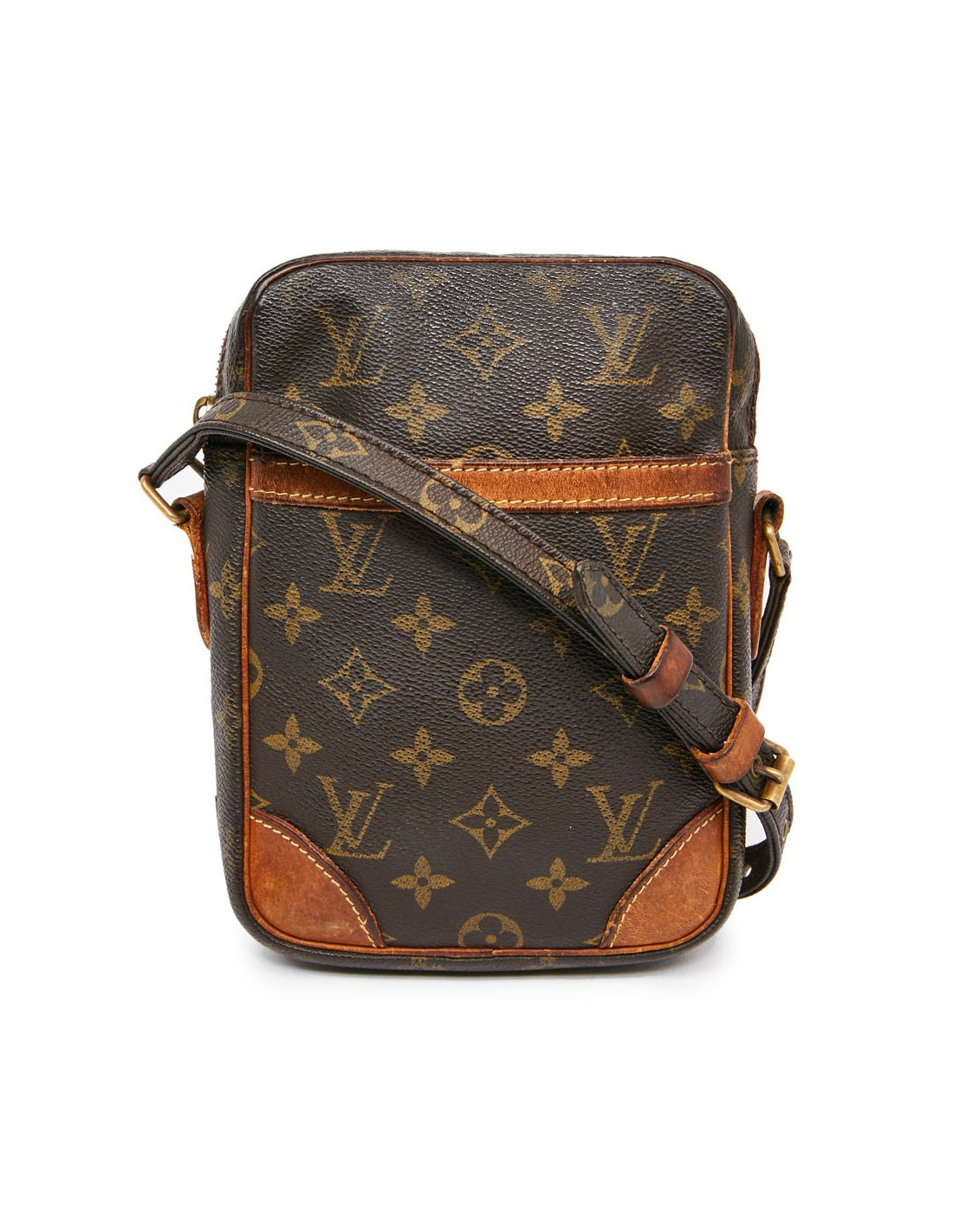 Ce sac bandoulière d'occasion bandoulière LOUIS VUITTON est vintage. Il est en toile enduite Monogram marron. Sur les 4 coins les garnitures en cuir de vache naturel se sont patinés avec le temps. L'accastillage est en laiton doré vieilli. Des traces d'usure sont visibles. La bandoulière est ajustable sur 7 trous déjà présents avec un système anti-dérapant. L'intérieur du sac est marron avec des traces visibles.