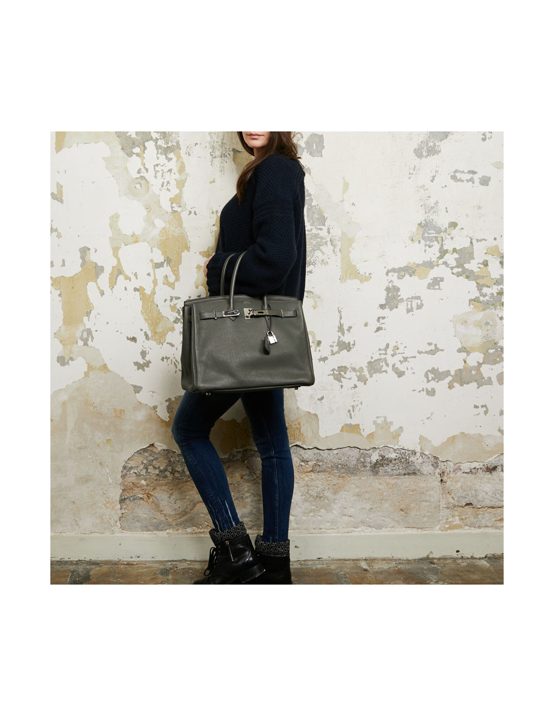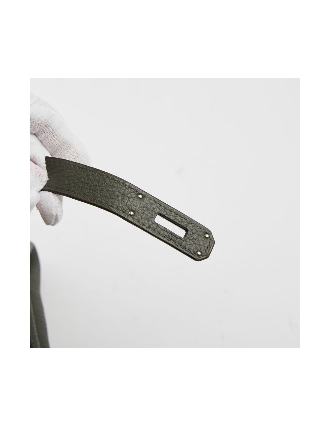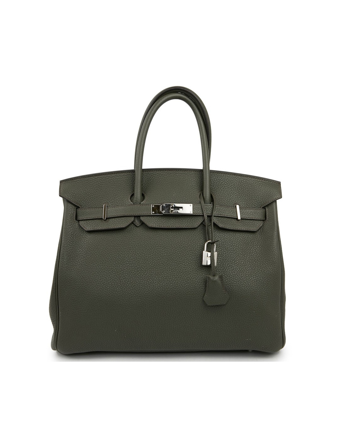Ce magnifique sac Birkin 35 d'occasion de la maison HERMES est en cuir togo vert olive. La surpiqûre est marron. Il a sa tirette, clochette, cadenas et clés. L'accastillage est de couleur argent palladié. Le bout de la languette droite (à l'extérieur) est siglé HERMES PARIS. A l'intérieur on trouve un O dans un carré signification de l'année 2011. L'intérieur du sac est en cuir vert. On compte deux poches (une poche zippée et une poche plaquée). Aucune trace d'usure. Il est en très bon état comme s'l n'avait jamais été porté.