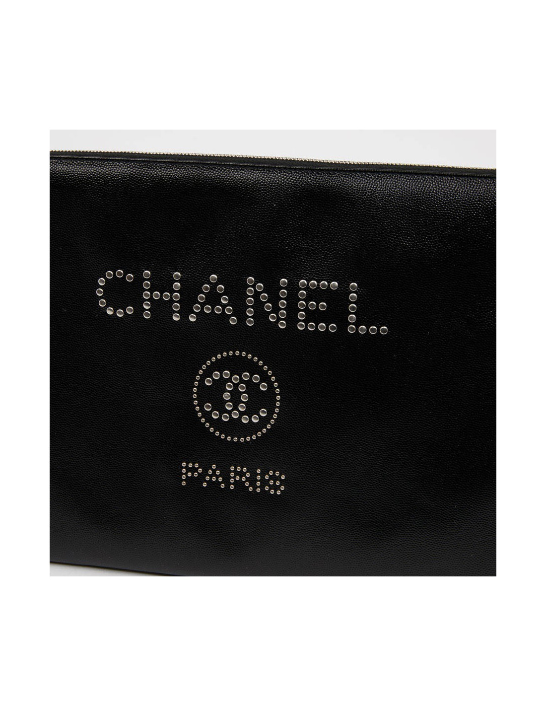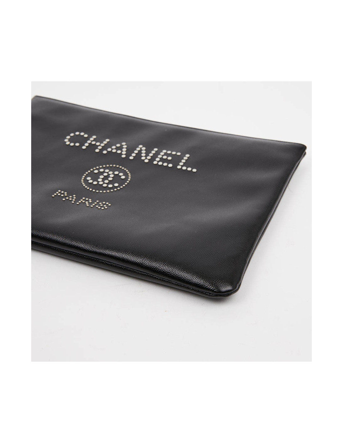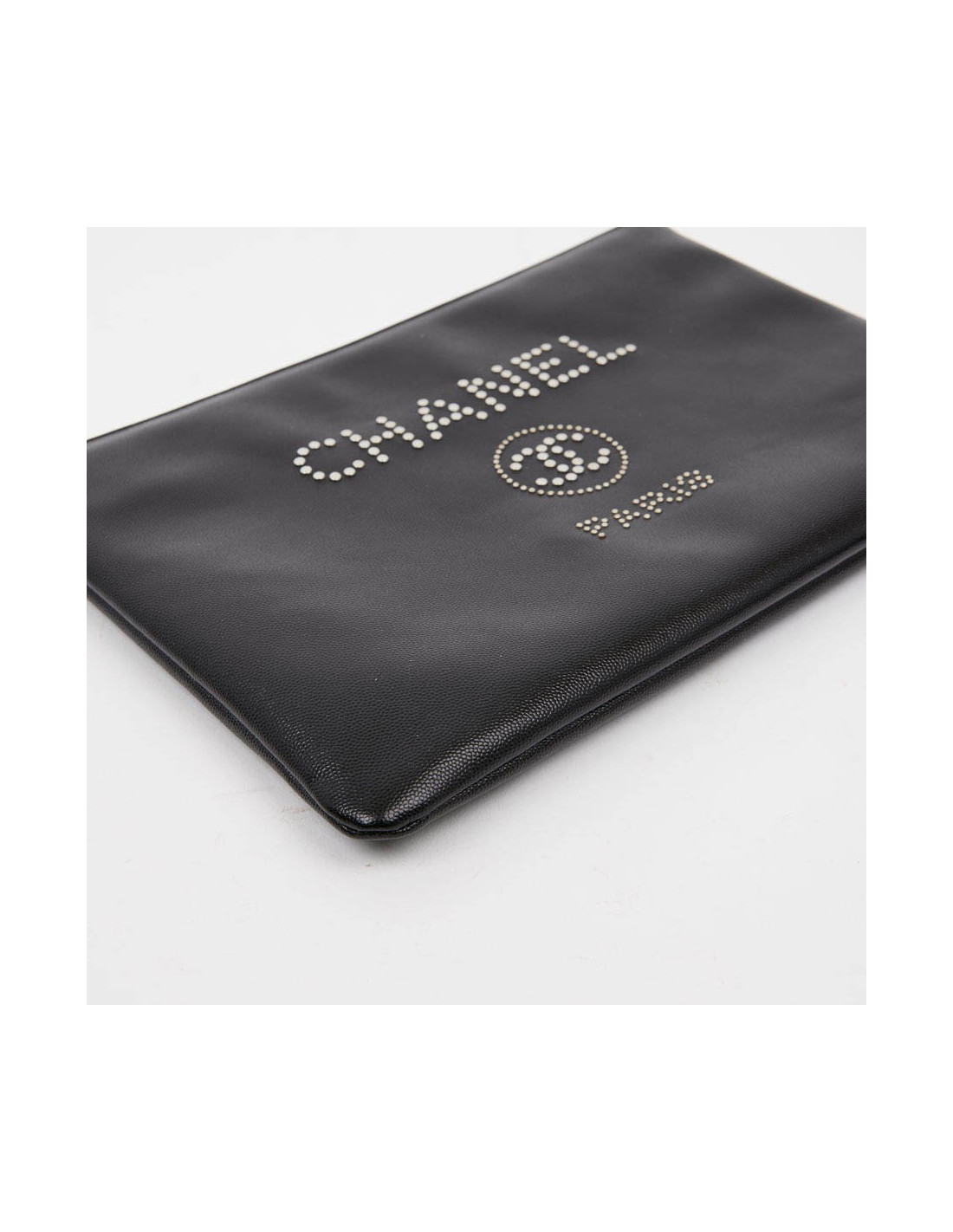 Cette pochette d'occasion CHANEL est en cuir caviar noir. La bijouterie est en métal argent. Sur l'avant de celle-ci le nom "CHANEL" ainsi que le Logo "CC" et "PARIS" sont incrustés par des clous en métal argent. L'intérieur est doublé en toile parachute matelassé noir. Elle peut servir en tant que pochette du soir ou pour votre ordinateur. Elle n'a jamais servi.