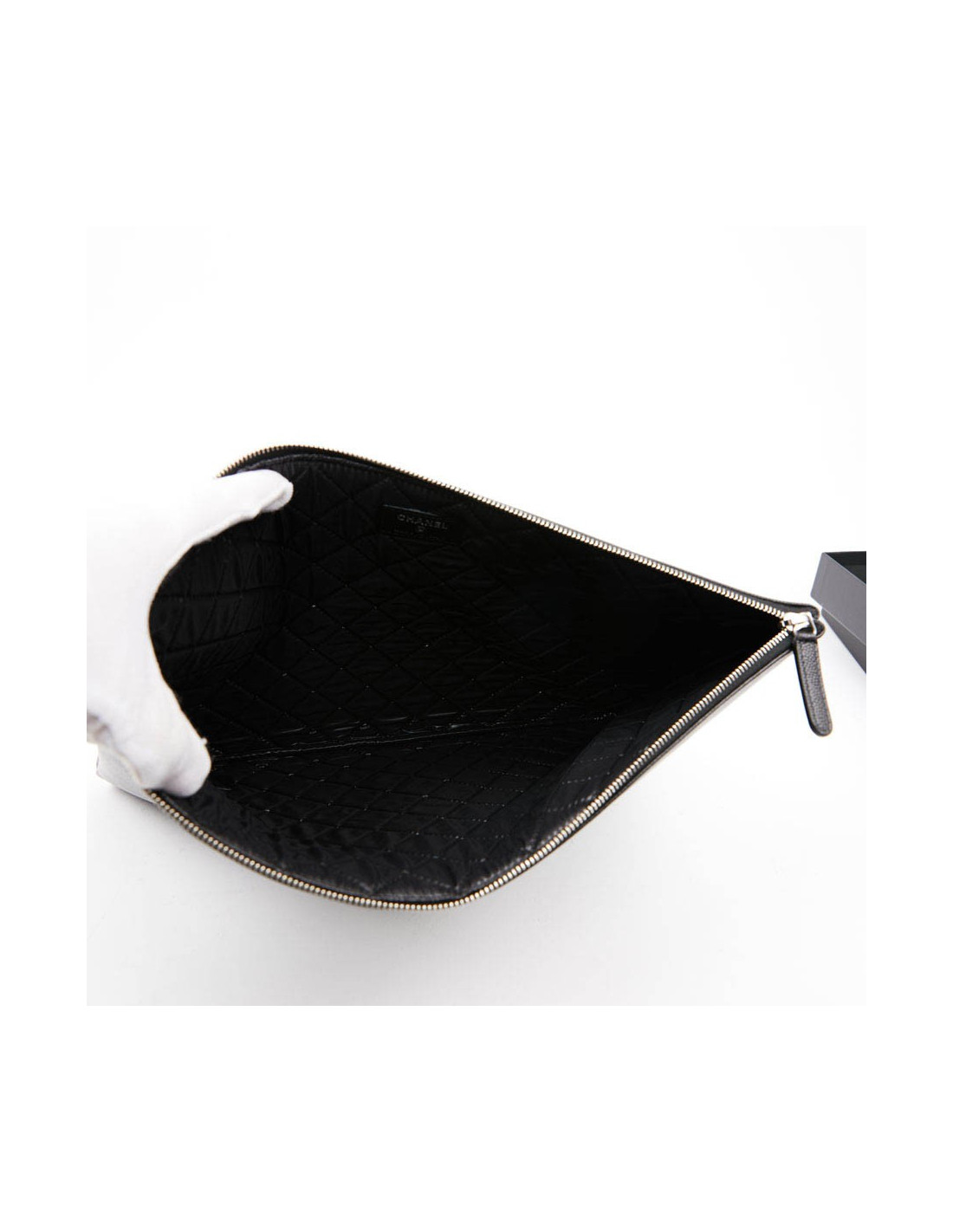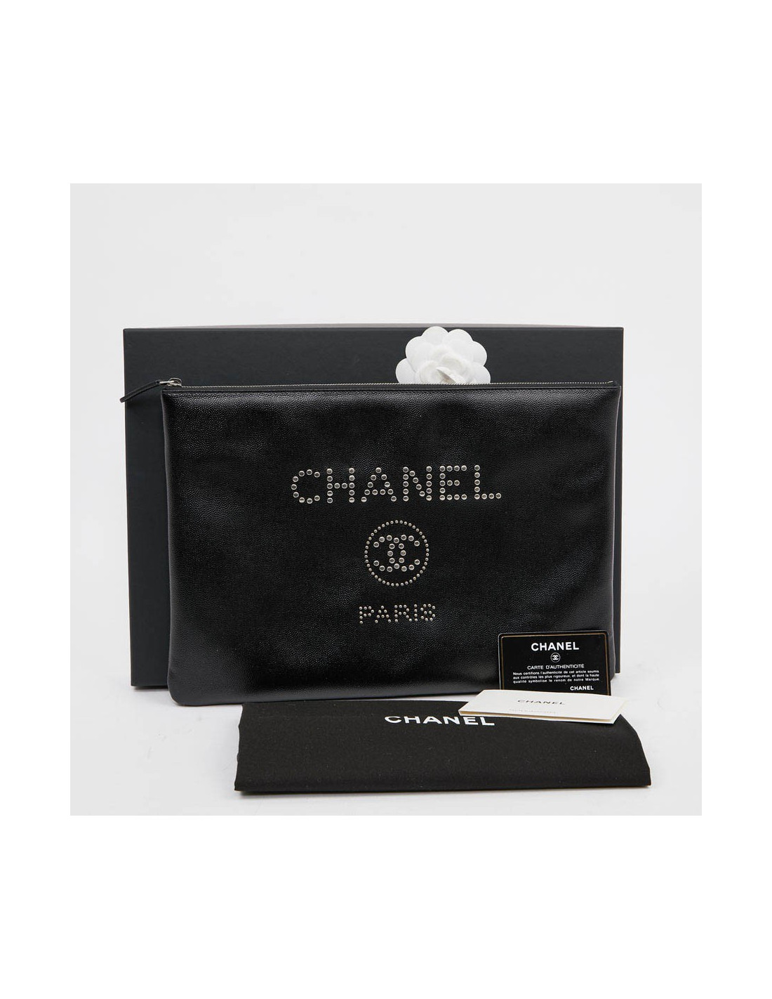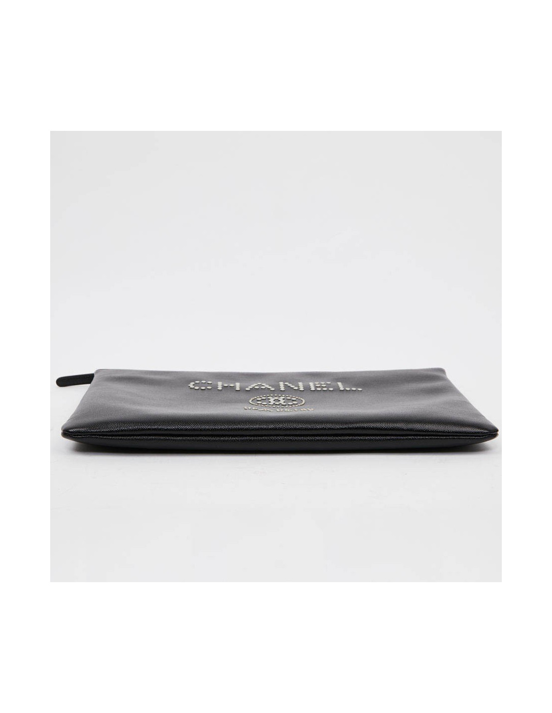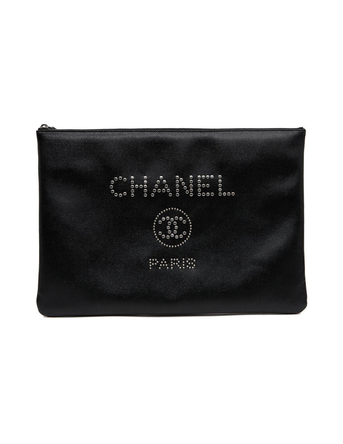Cette pochette d'occasion CHANEL est en cuir caviar noir. La bijouterie est en métal argent. Sur l'avant de celle-ci le nom "CHANEL" ainsi que le Logo "CC" et "PARIS" sont incrustés par des clous en métal argent. L'intérieur est doublé en toile parachute matelassé noir. Elle peut servir en tant que pochette du soir ou pour votre ordinateur. Elle n'a jamais servi.
