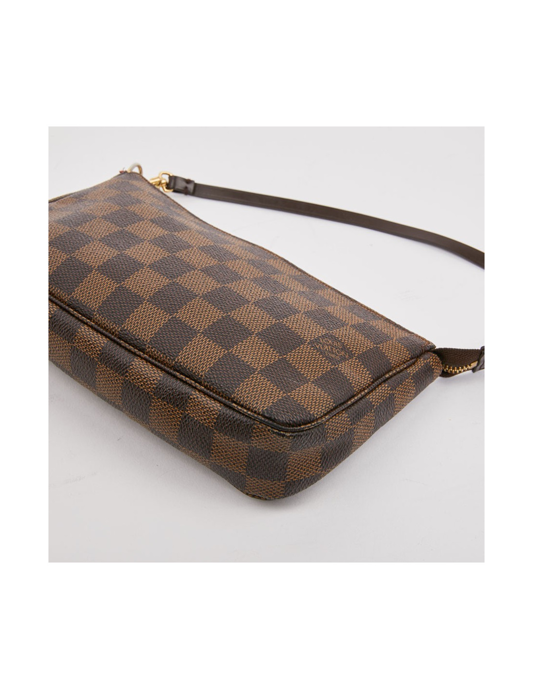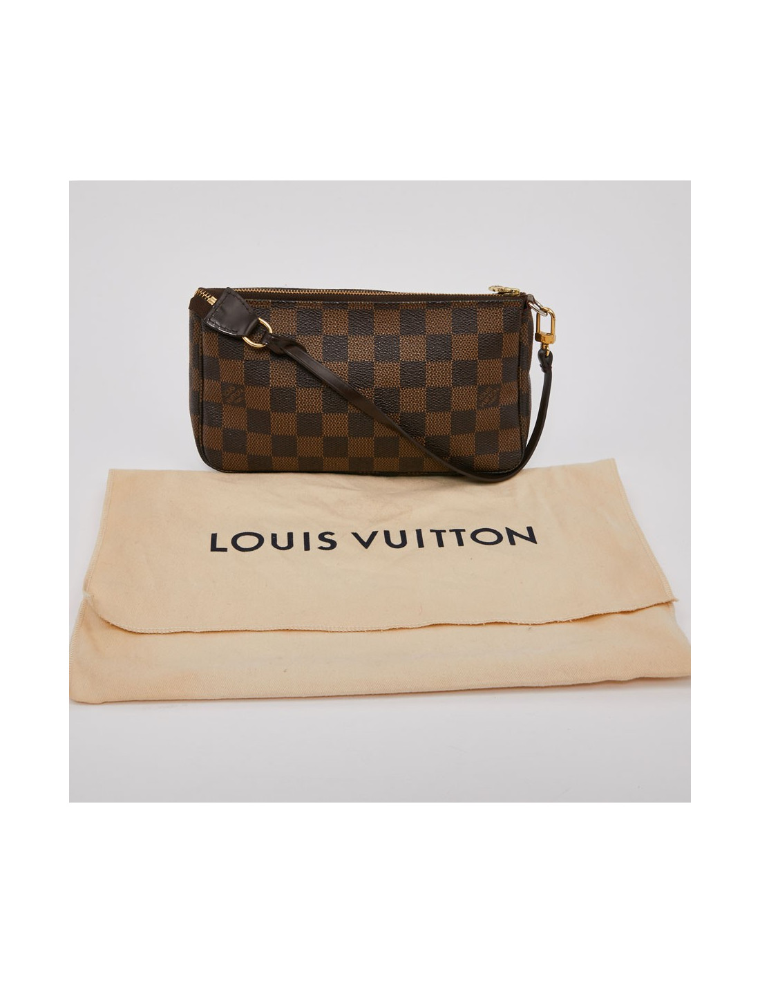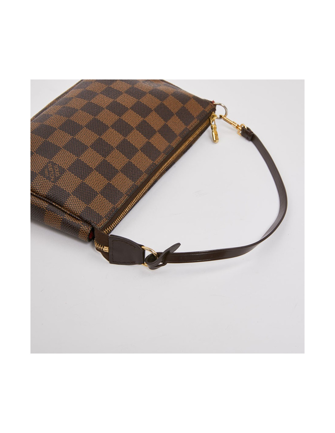Modèle iconique de la marque LOUIS VUITTON. Elle est disponible d'occasion dans la version toile damier marron. L'intérieur du sac est en toile rouge. Cette pochette est en parfait état. Les pièces métalliques sont en métal doré. Elle se porte à l'épaule grâce à sa lanière en cuir amovible.