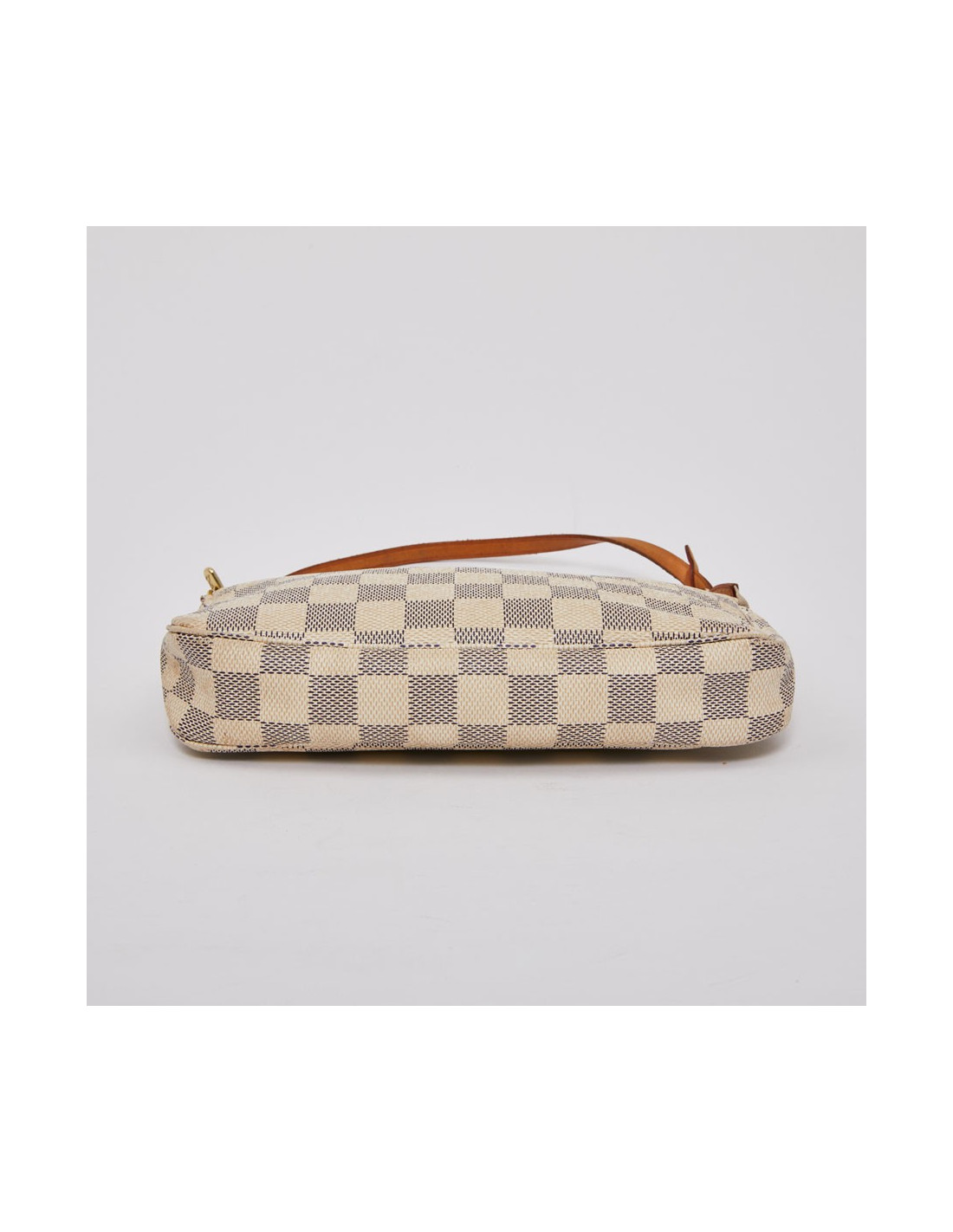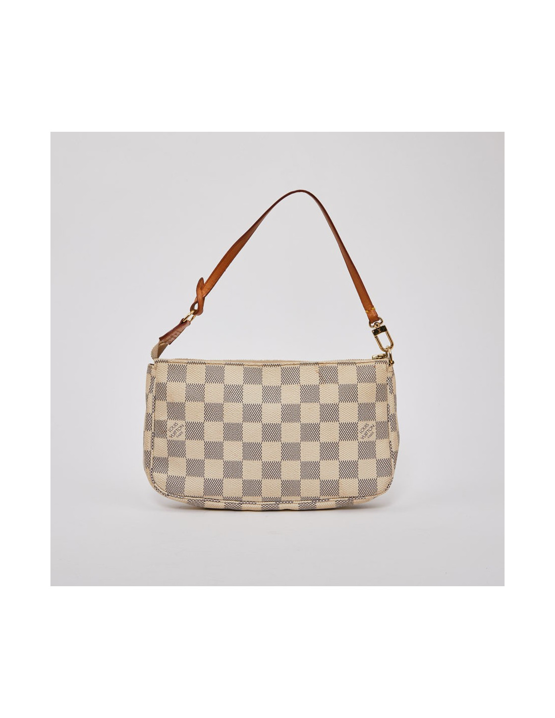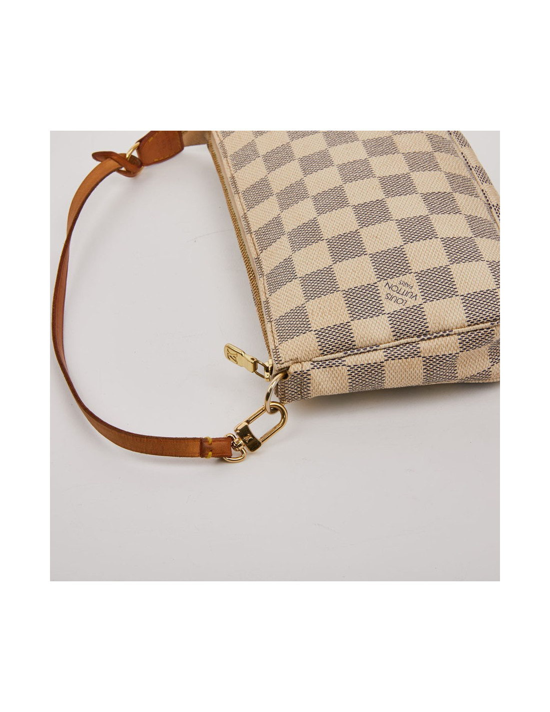 Modèle iconique de la marque LOUIS VUITTON. Elle est disponible d'occasion dans la version toile enduite damier azur. Cette pochette est en très bon état. L'accastillage est en métal doré. Les finitions sont en cuir de vache naturel. Elle se porte à l'épaule grâce à sa lanière en cuir amovible.