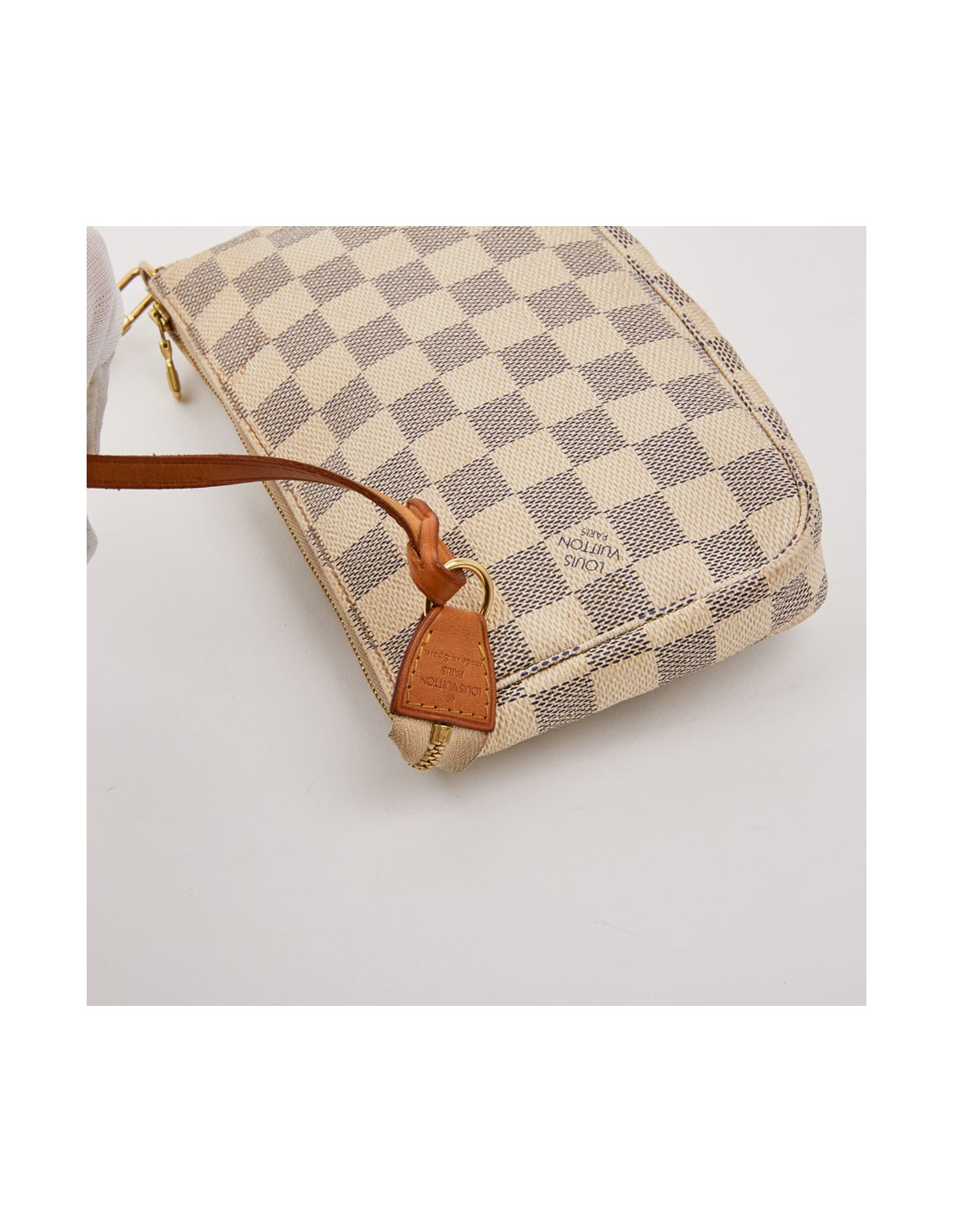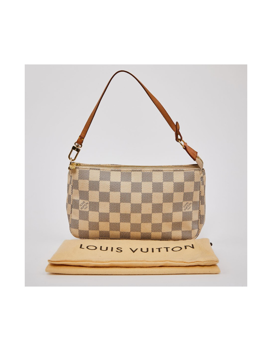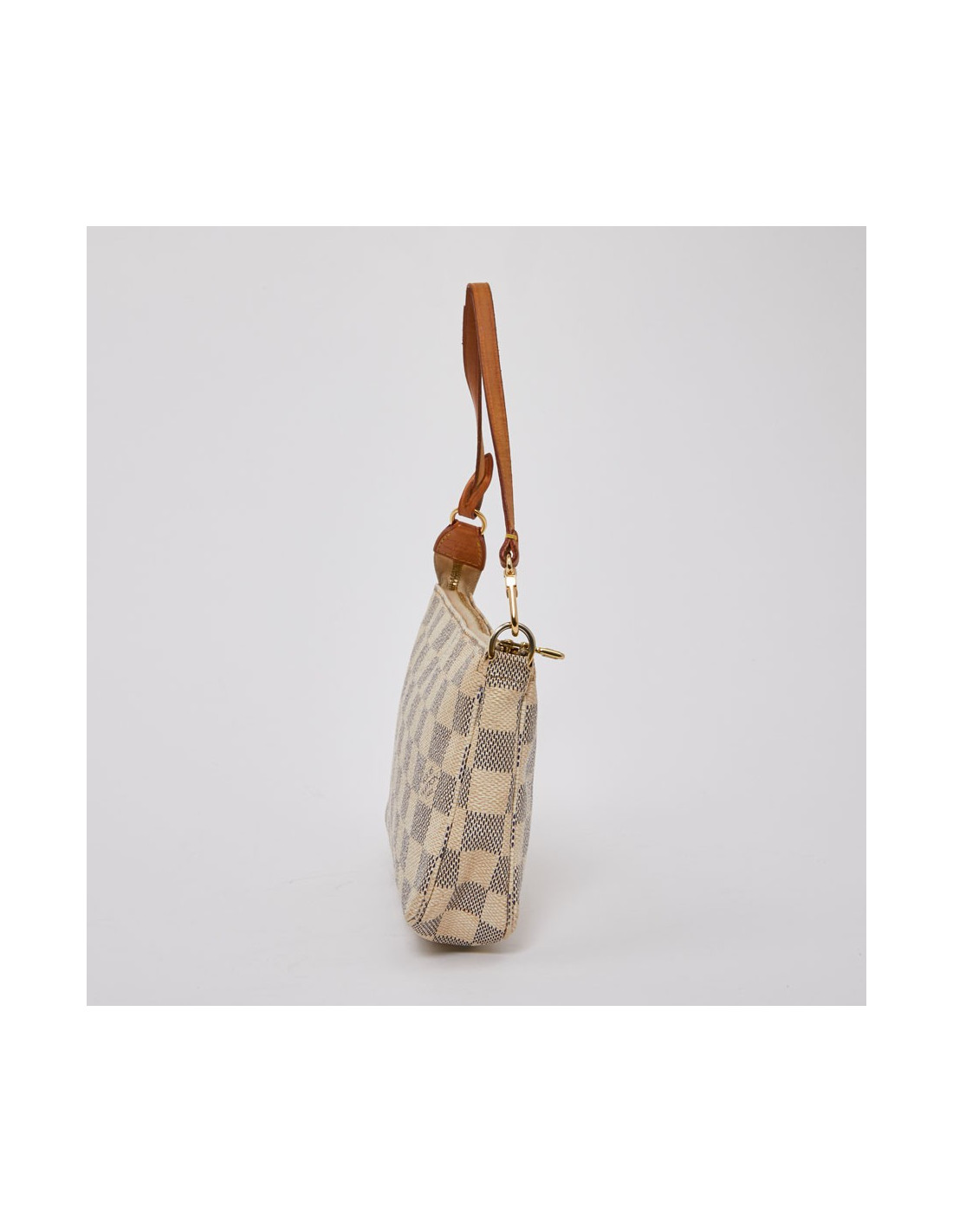 Modèle iconique de la marque LOUIS VUITTON. Elle est disponible d'occasion dans la version toile enduite damier azur. Cette pochette est en très bon état. L'accastillage est en métal doré. Les finitions sont en cuir de vache naturel. Elle se porte à l'épaule grâce à sa lanière en cuir amovible.