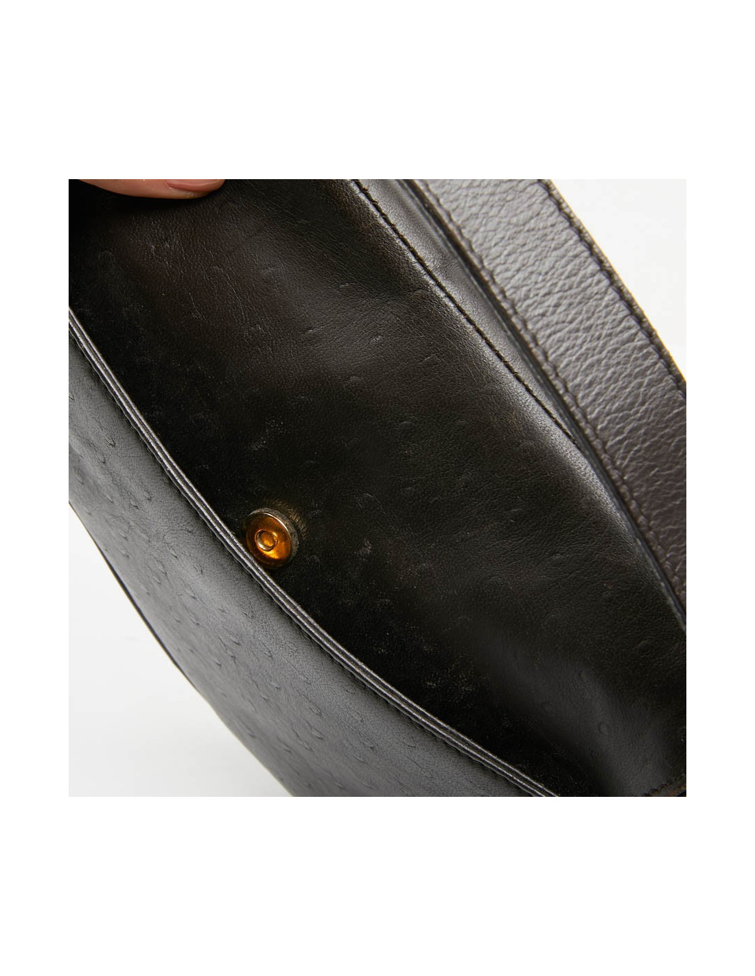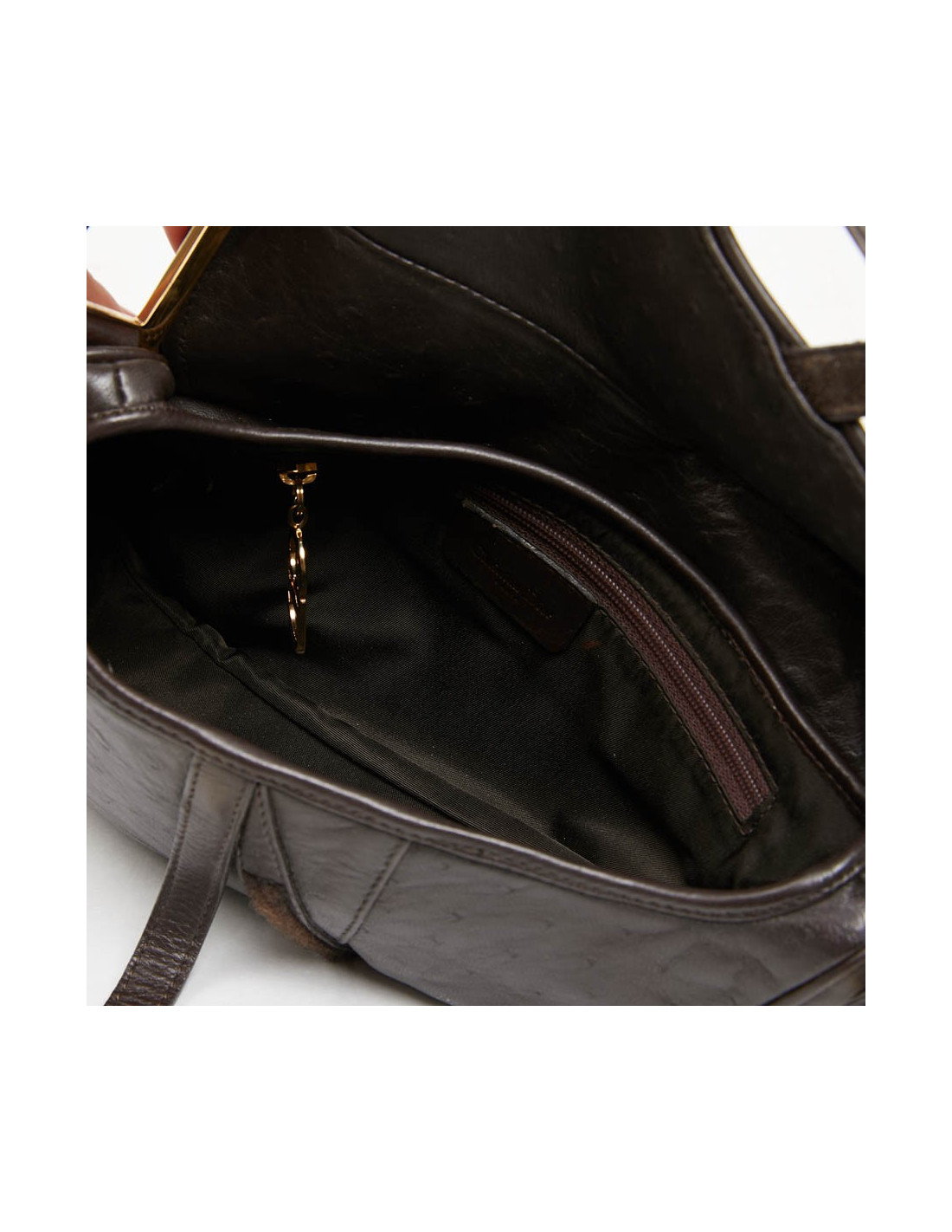 Pièce Collector. Avoir un sac Saddle Dior est un "must have". Valois Vintage Paris vous le propose d'occasion en cuir marron imitation autruche. La bijouterie est en métal doré. La doublure est en tissu marron avec une poche zippée. Il se ferme par rabat. Il est en très état d'usage, micro-rayures sur les garnitures en métal.