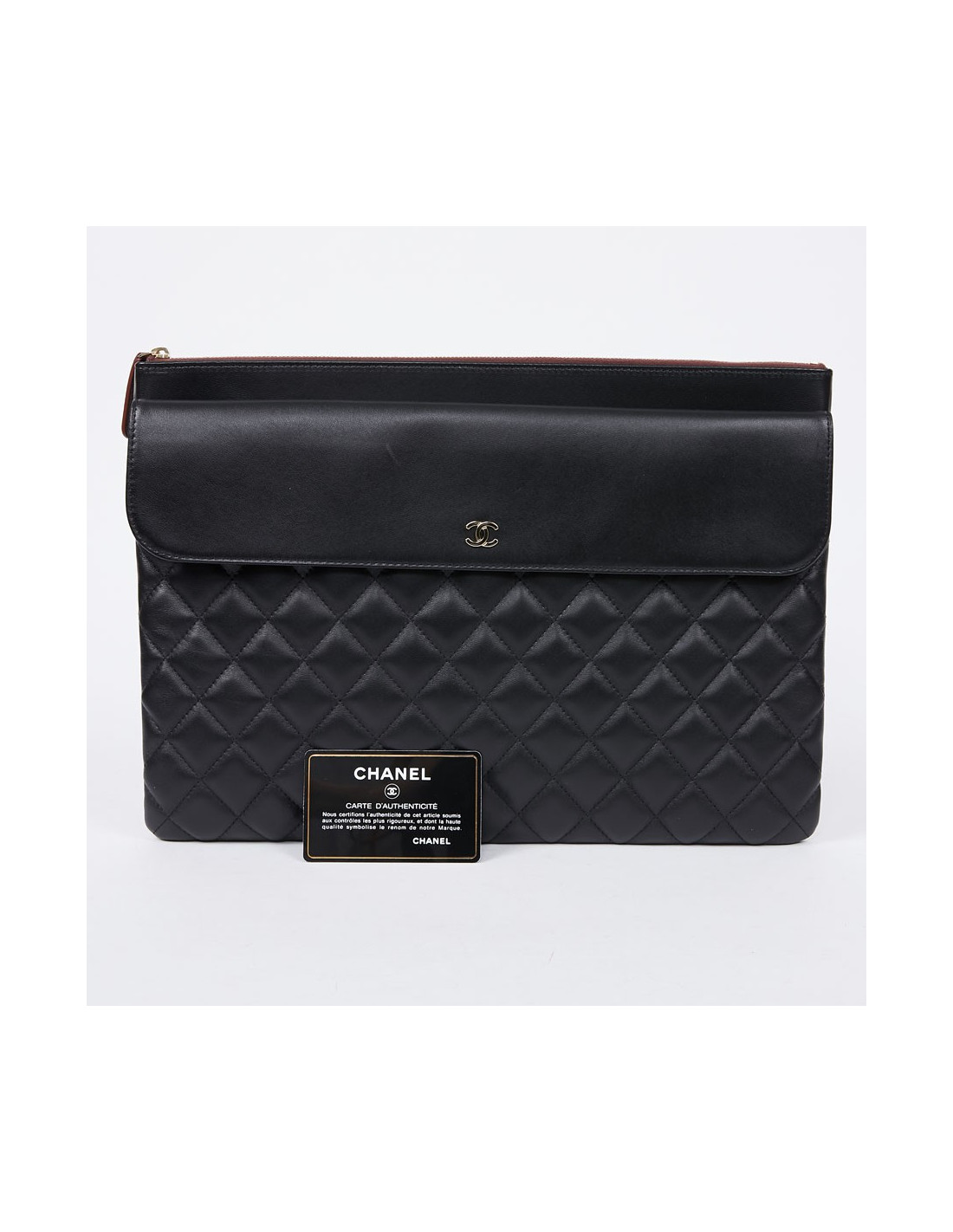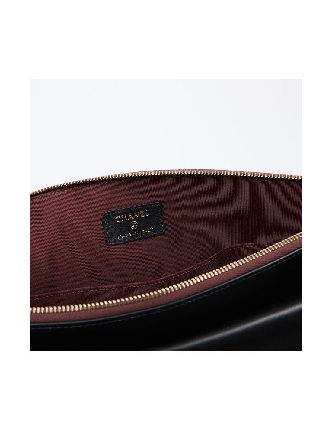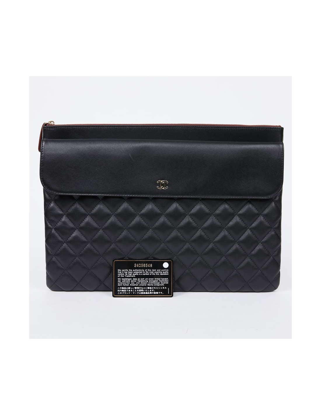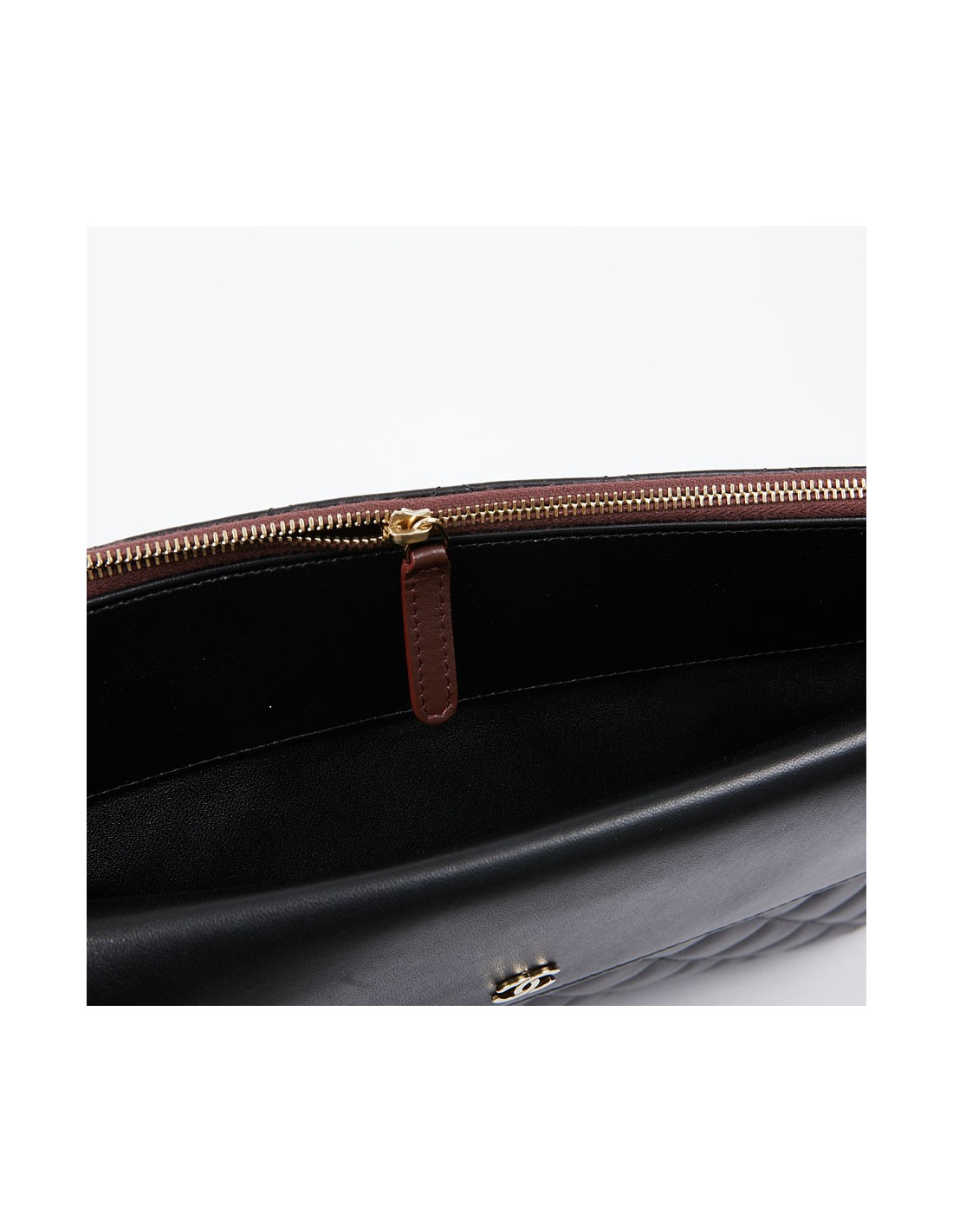 Superbe occasion ! Cette pochette CHANEL est en cuir d'agneau lisse noir. La surpiqure noire lui donne un relief matelassé. Elle est doublé en tissu bordeaux (les deux couleurs phares de la marque). La pochette a différents compartiments de rangement. La principale a une fermeture éclair et la seconde a un aimant agrémenté d'un "CC". Entre les deux une poche plaquée. La bijouterie est dorée. Elle n'a jamais été portée.