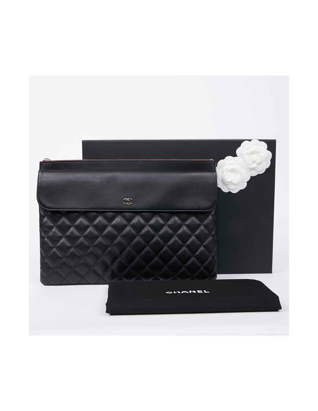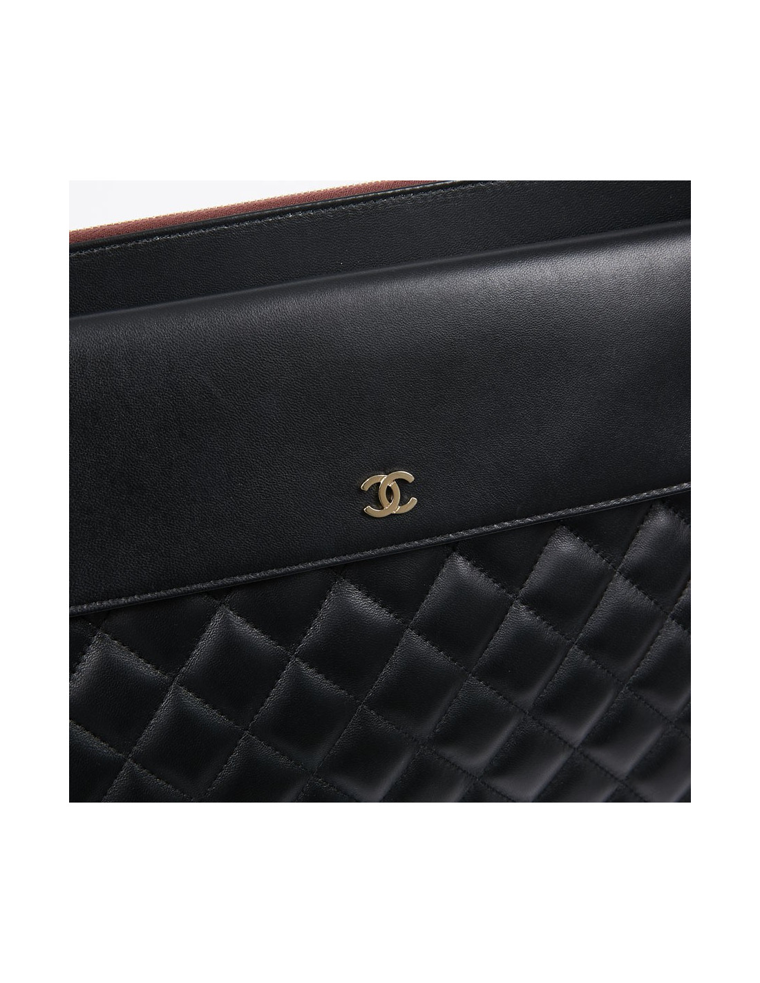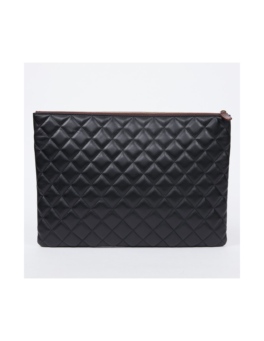 Superbe occasion ! Cette pochette CHANEL est en cuir d'agneau lisse noir. La surpiqure noire lui donne un relief matelassé. Elle est doublé en tissu bordeaux (les deux couleurs phares de la marque). La pochette a différents compartiments de rangement. La principale a une fermeture éclair et la seconde a un aimant agrémenté d'un "CC". Entre les deux une poche plaquée. La bijouterie est dorée. Elle n'a jamais été portée.