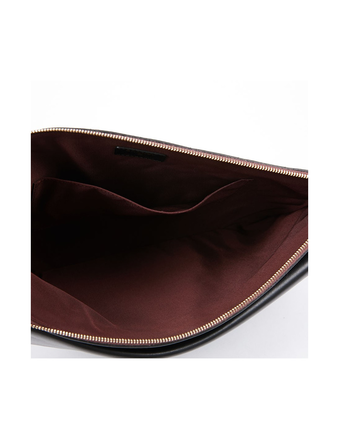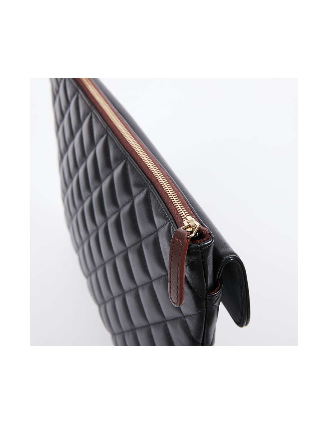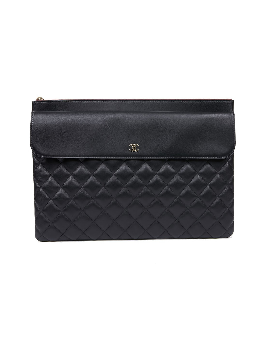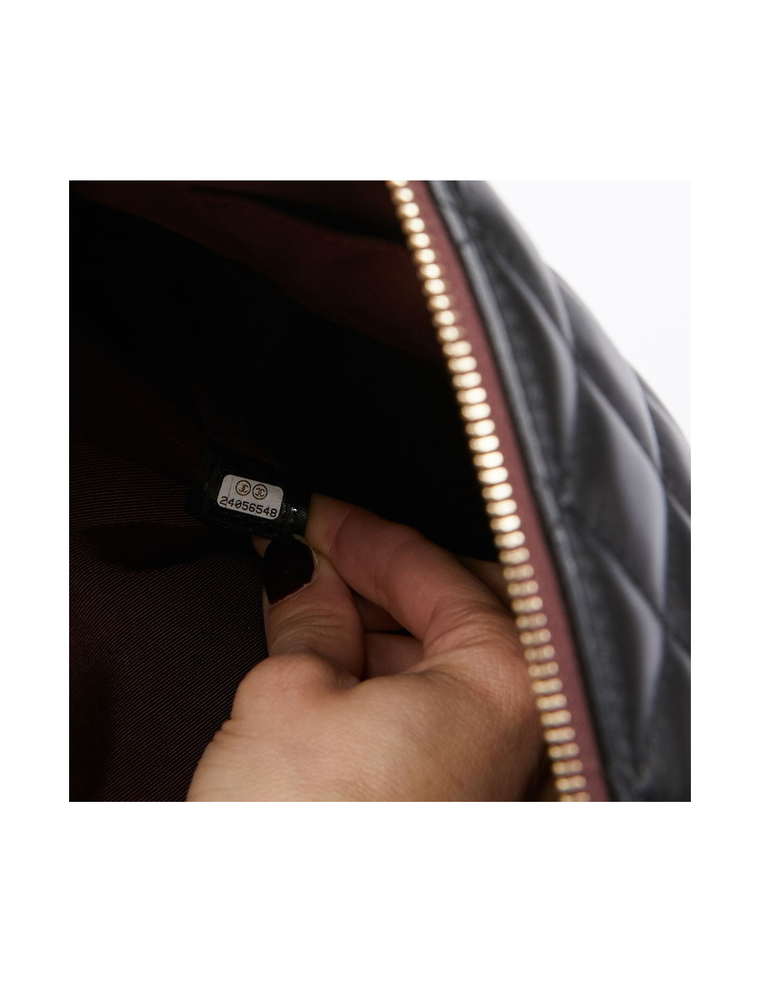 Superbe occasion ! Cette pochette CHANEL est en cuir d'agneau lisse noir. La surpiqure noire lui donne un relief matelassé. Elle est doublé en tissu bordeaux (les deux couleurs phares de la marque). La pochette a différents compartiments de rangement. La principale a une fermeture éclair et la seconde a un aimant agrémenté d'un "CC". Entre les deux une poche plaquée. La bijouterie est dorée. Elle n'a jamais été portée.