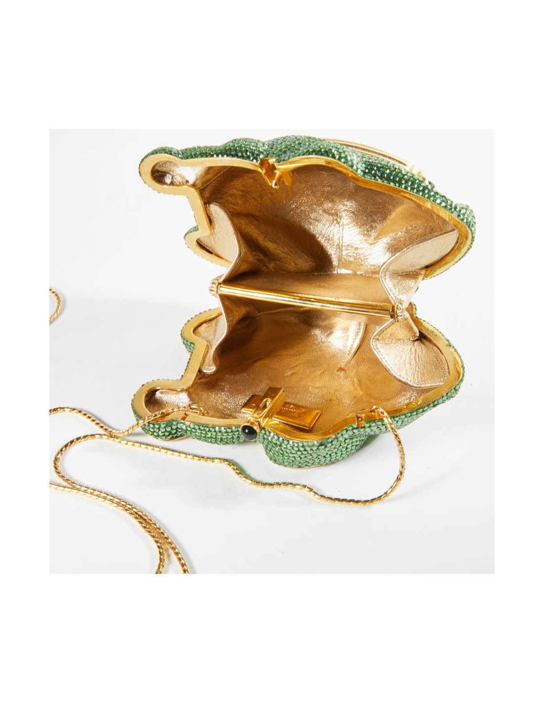 Dans ce cas précis, il s'agit d'une grenouille verte avec des yeux noirs. L'intérieur est doublé en cuir doré. Elle se porte à l'épaule ou croisée par une fine chaine dorée. Il manque deux petits strass vert à l'avant à peine perceptible, c'est pour cette raison que nous avons indiqué en bon état.