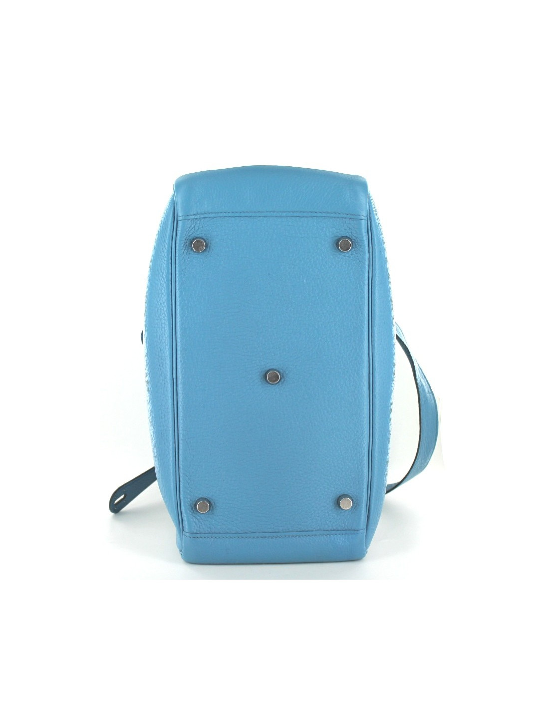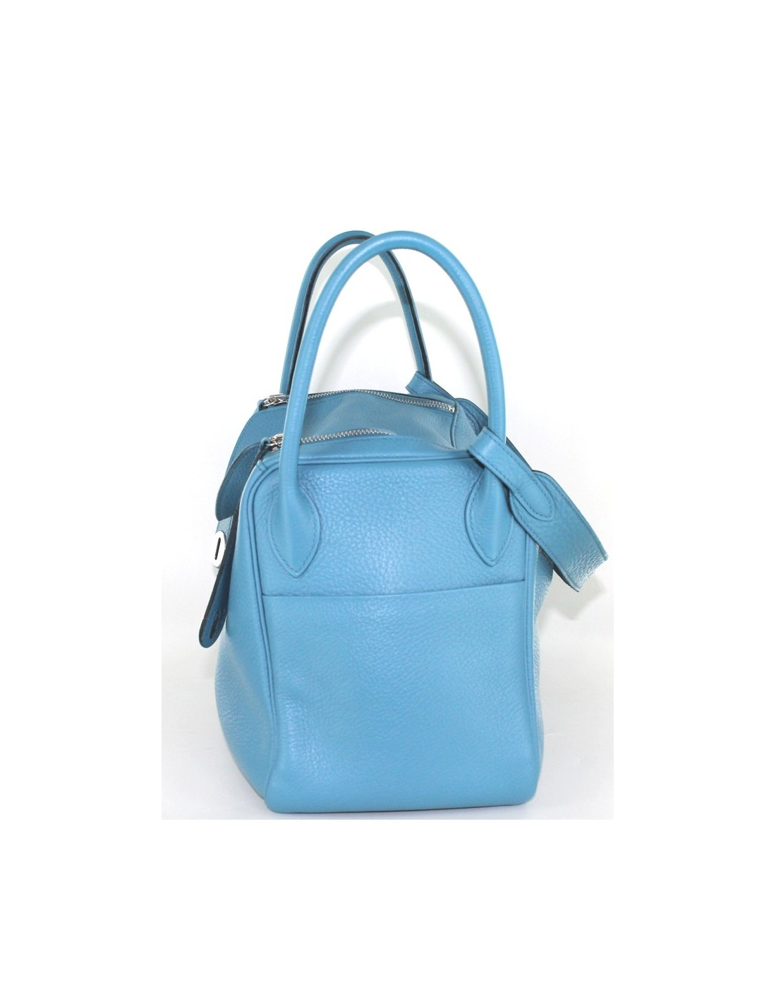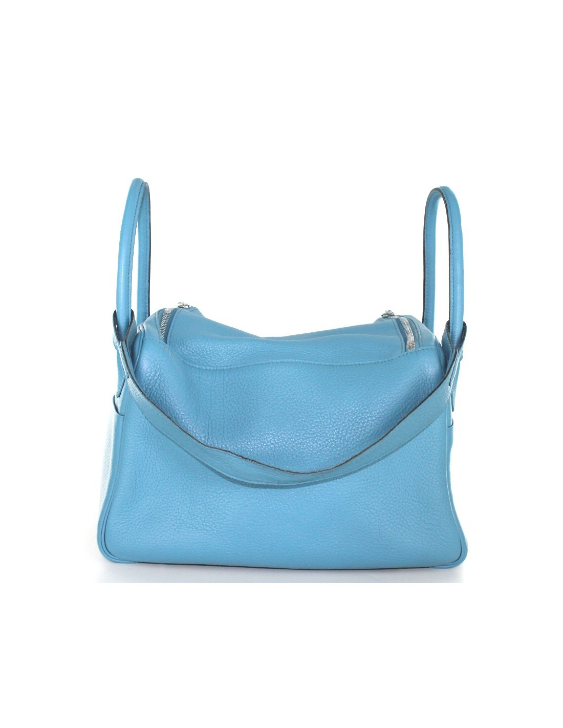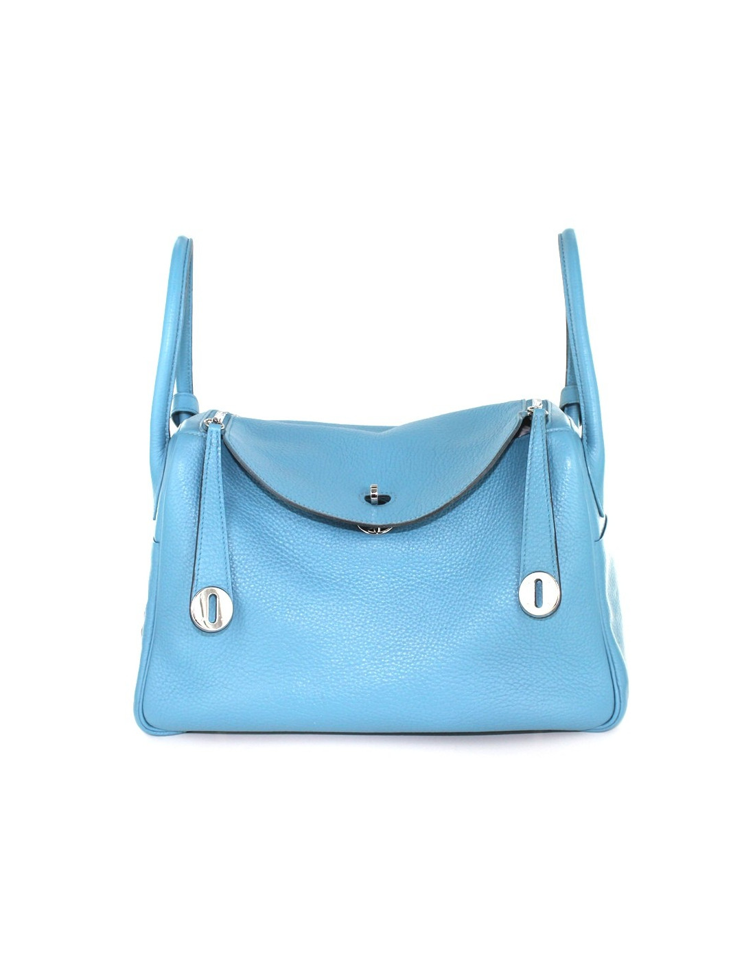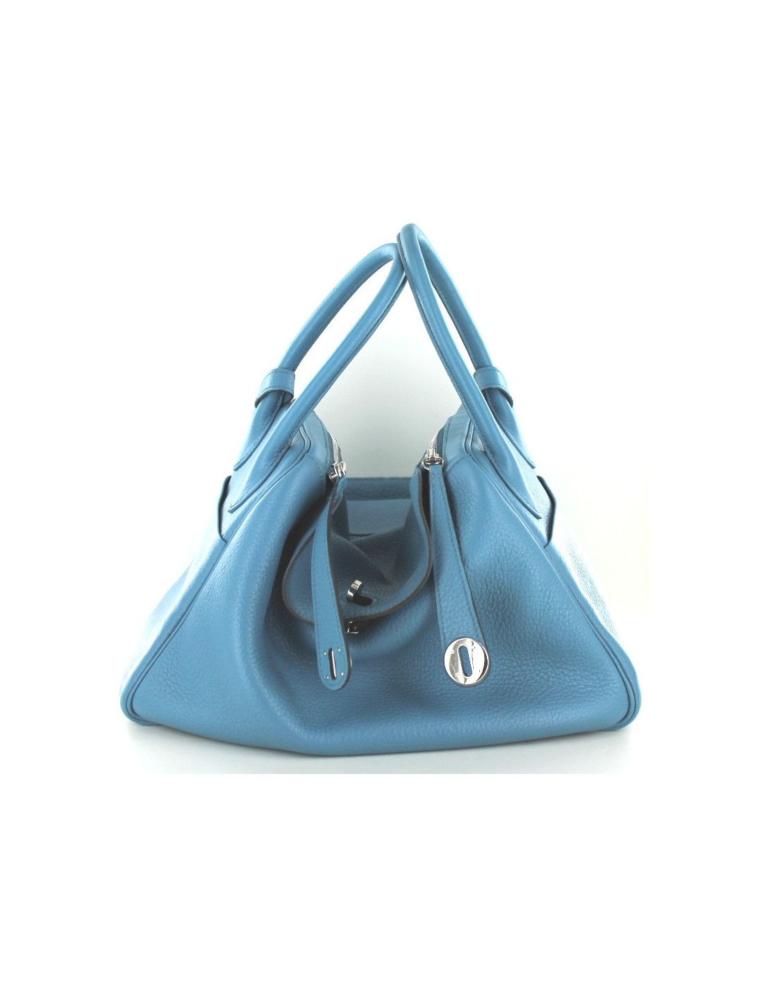 Sac HERMES LINDY en cuir taurillon clémence bleu jean, bijouterie palladium. Double fermeture sur glissière. Demi-bandoulière et double poignée. Deux poches plaquées de chaque côté du sac. Le fermoir est siglé "HERMES PARIS". A l'intérieur ce sac mythique dispose de deux poches plates. Ce sac a subit un traitement de rénovation complet du cuir. Il est donc en très bon état. Sur le fond du sac, quatre picots de protection. Inscriptions "HERMES PARIS" légèrement effacées par la rénovation. Made in France.