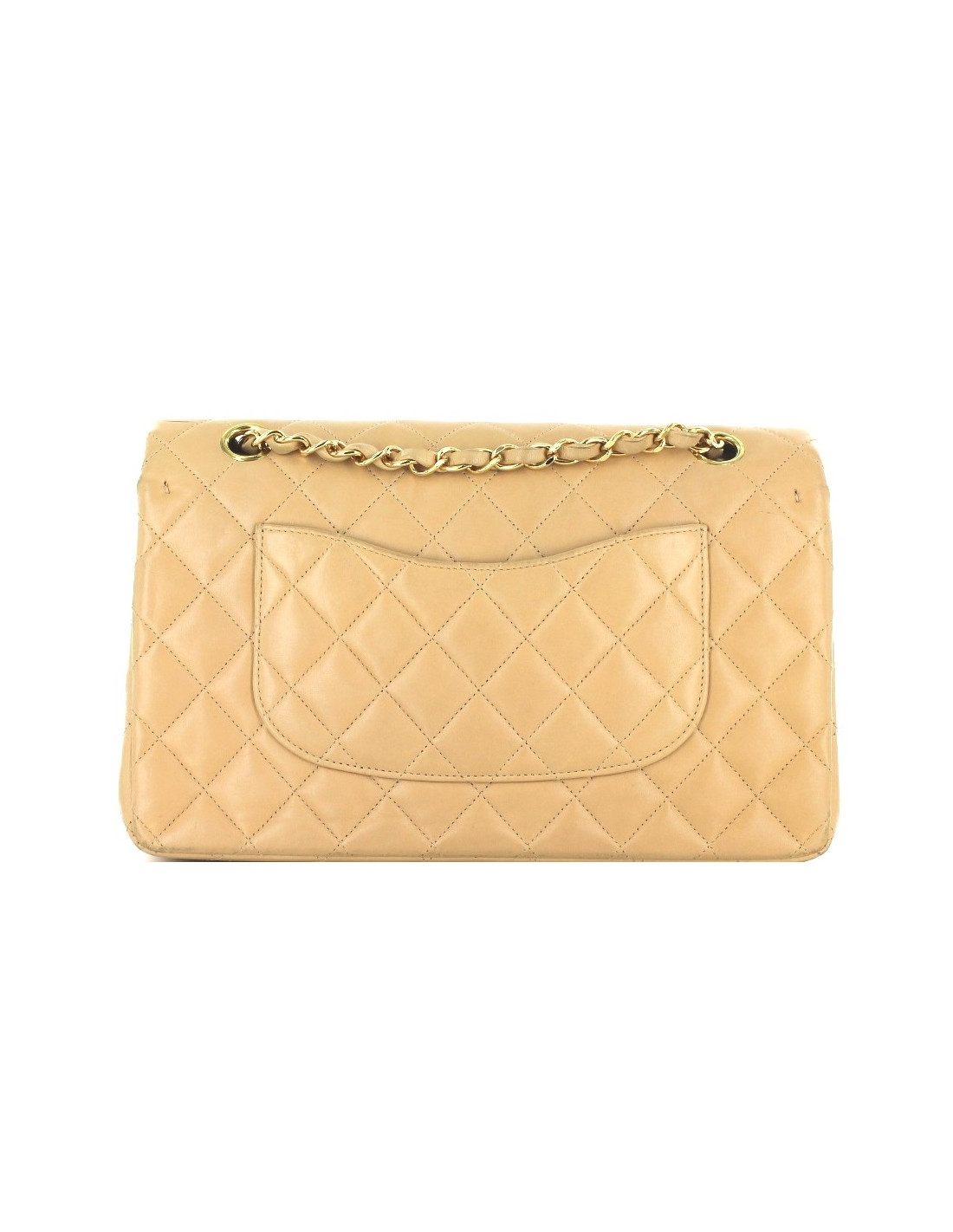 Sac Timeless CHANEL double-rabat en cuir d'agneau beige et bijouterie dorée. Fermoir CC en métal doré. Quelques légères marques et traces d'usure (voir photos). Poche plate extérieure sur l'arrière du sac. A l'intérieur, une grande poche plate et deux petites pour téléphones portables. Très bon état général. Hologramme 51..., année 2000. Made in France. Vendu avec son dustbag.