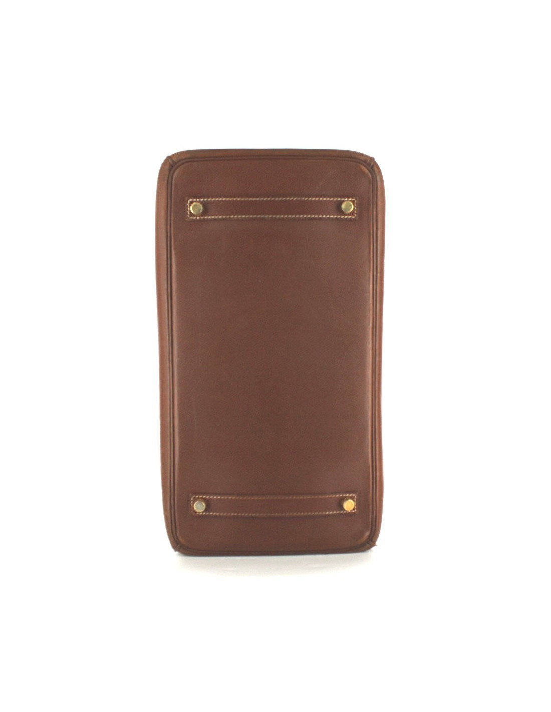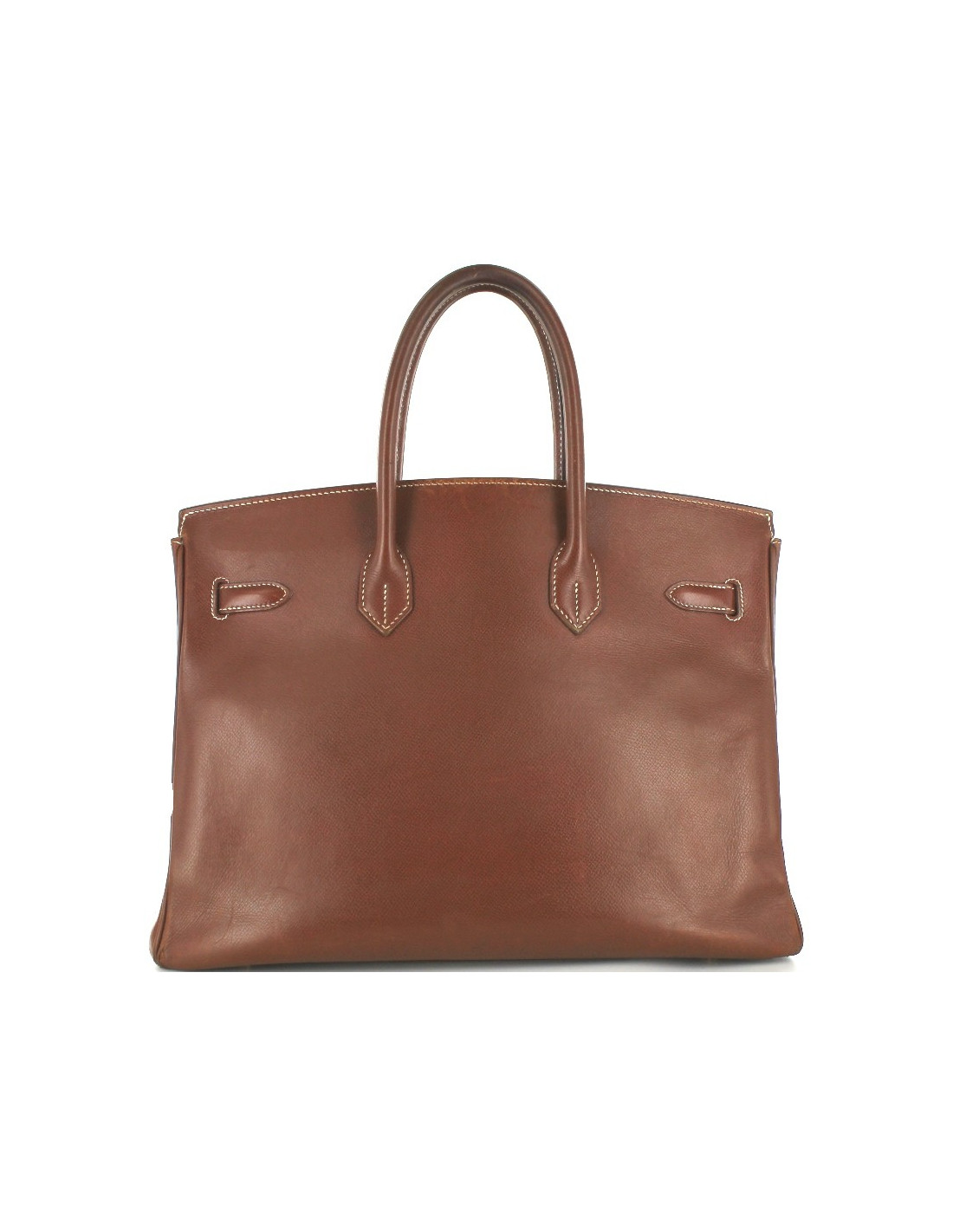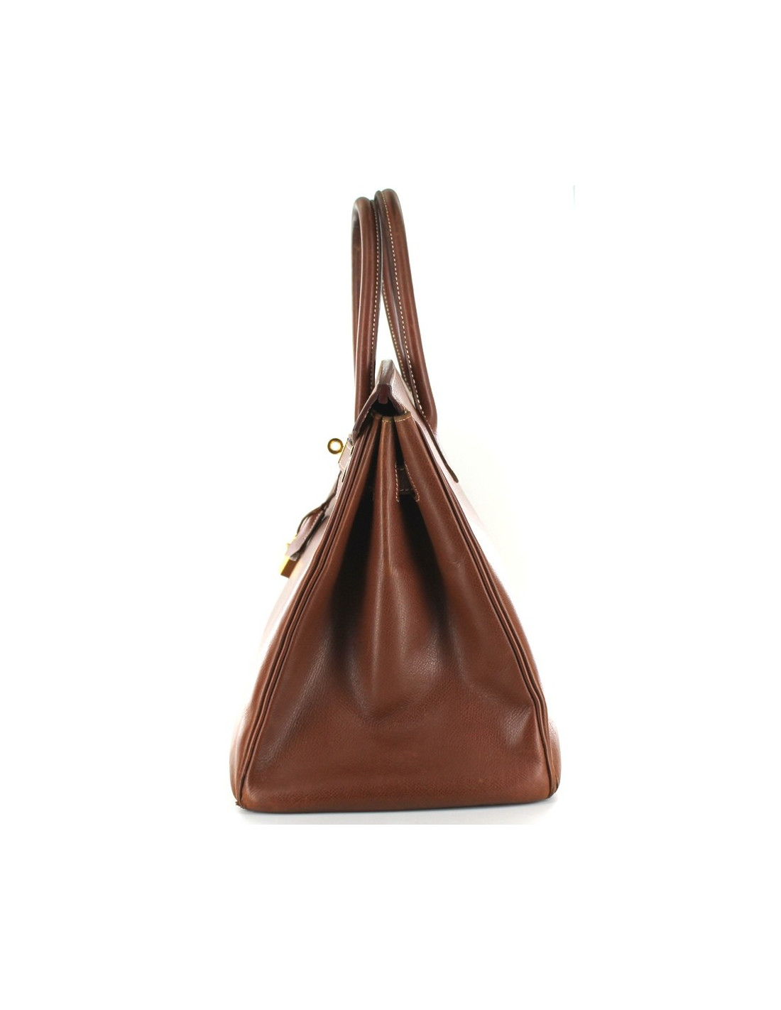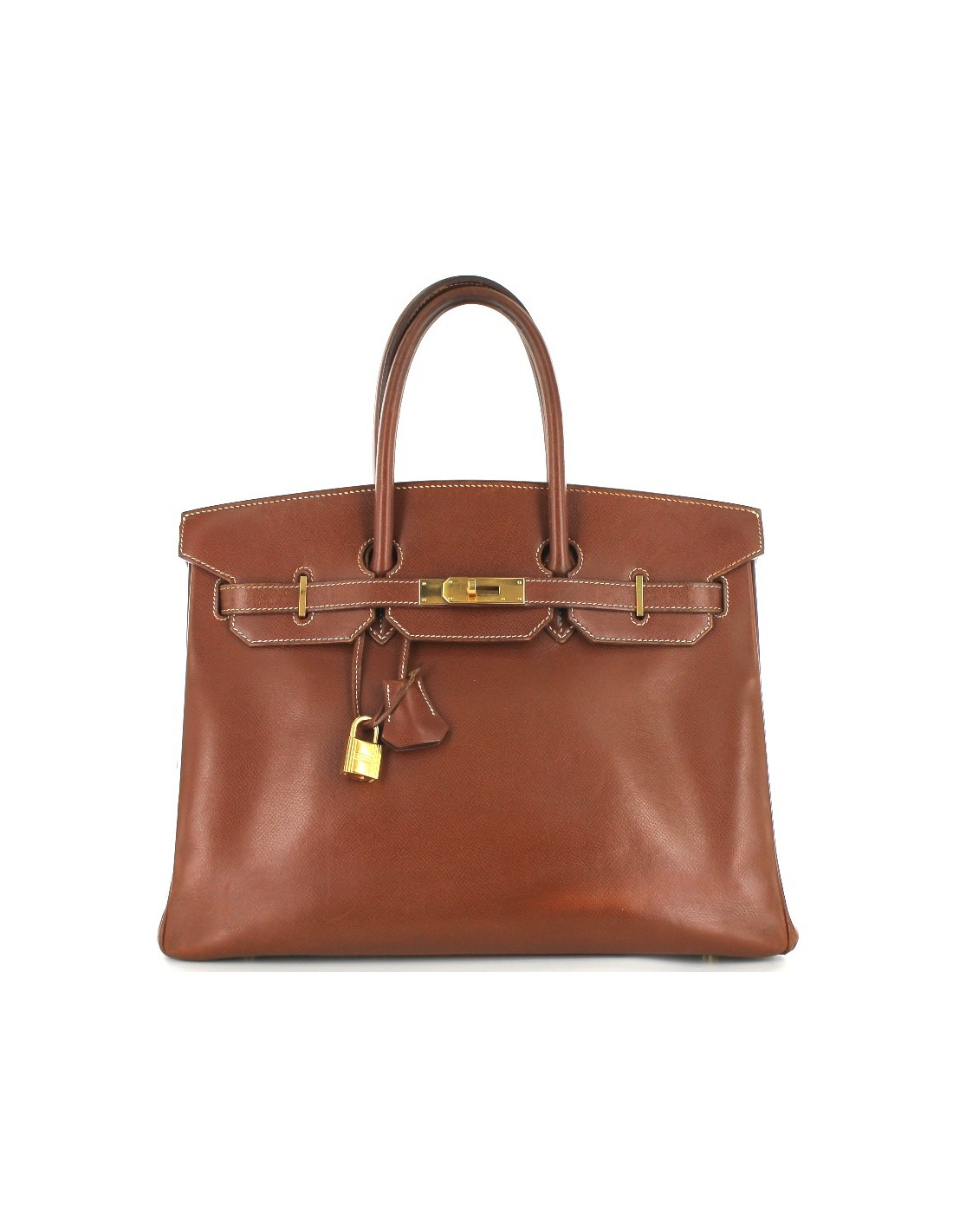 BIRKIN 35 en cuir Epsom, couleur tabac, bijouterie dorée. Surpiqûres écrues. Lettre G, année 2003. Sur le fond du sac, quatre picots dorés. Angles légèrement abîmés par l'usure, dont deux déchirés sur quelques millimètres. Marques et griffures d'usure. A l'intérieur, une grande poche plate et une grande poche zippée. Vendu avec son cadenas, ses clés, sa clochette et son dustbag. Made in France.