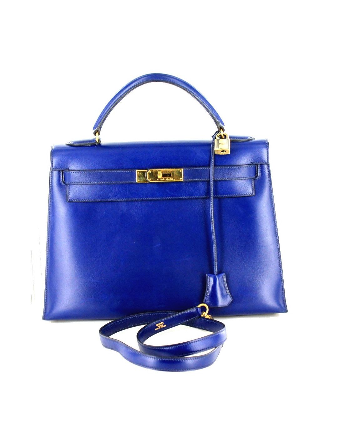 Kelly Hermès taille 32 cm, en box bleu encre, lettre U dans un cercle., vintage, piqûres sellier.