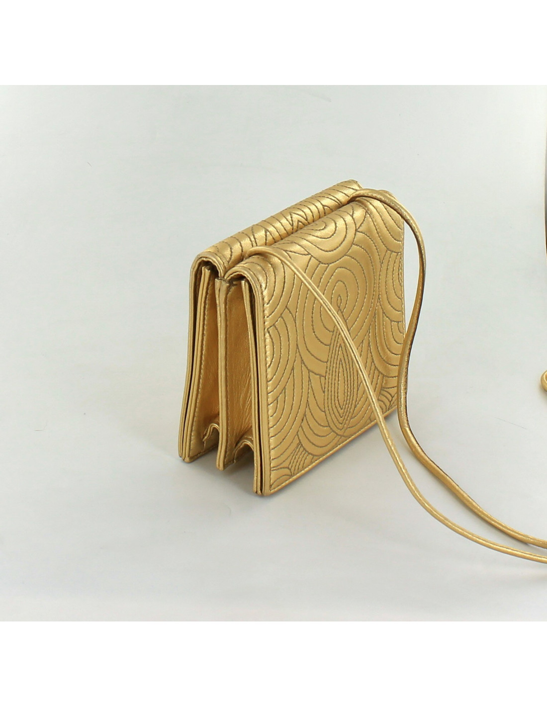 Mini sac YVES SAINT LAURENT, en cuir brodé, doré. Il se comporte de 2 compartiments séparés et se referment par des rabats aimantés.