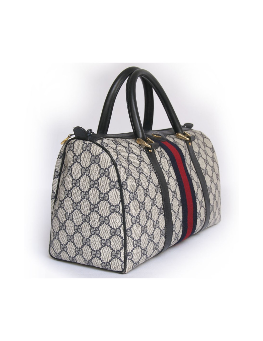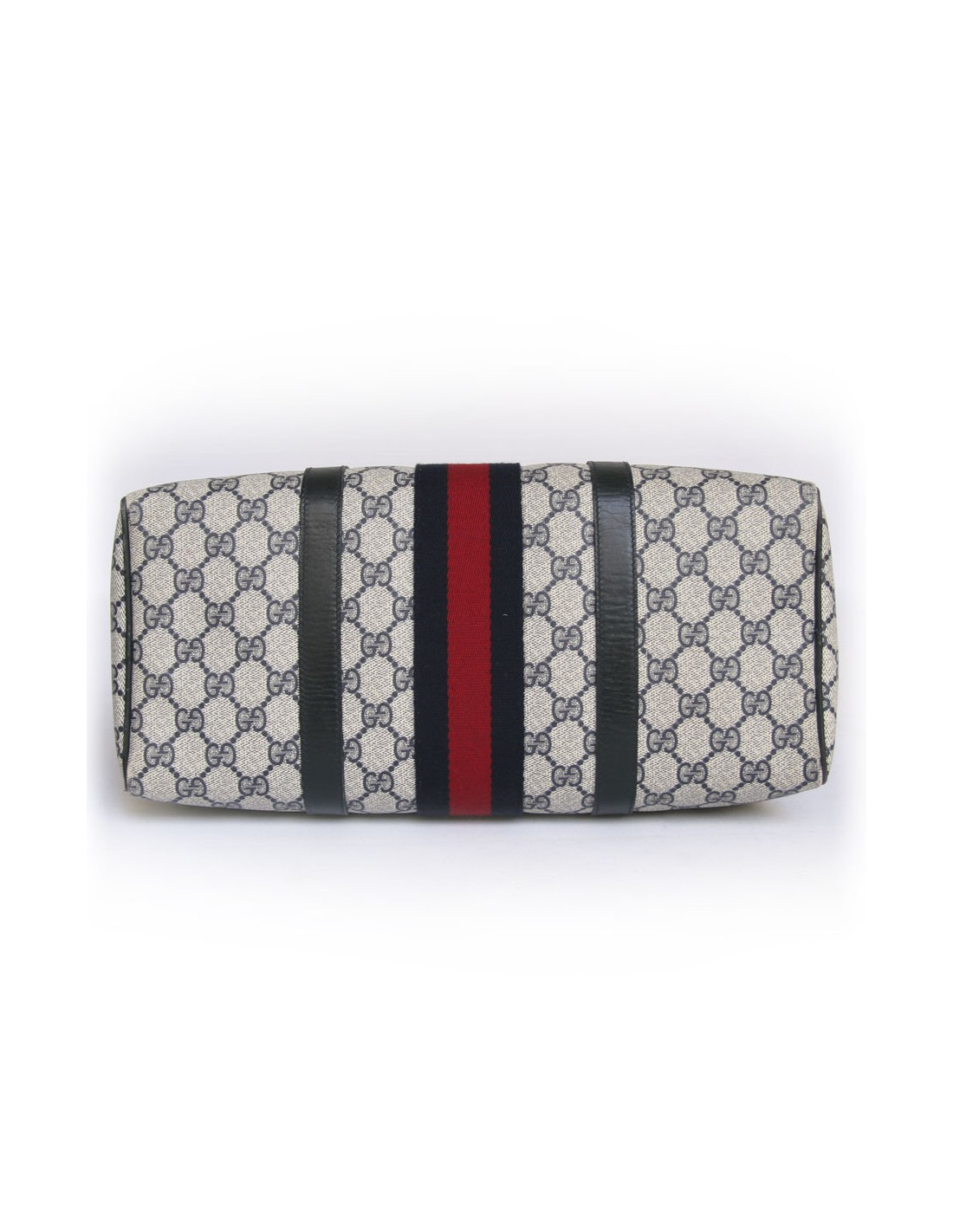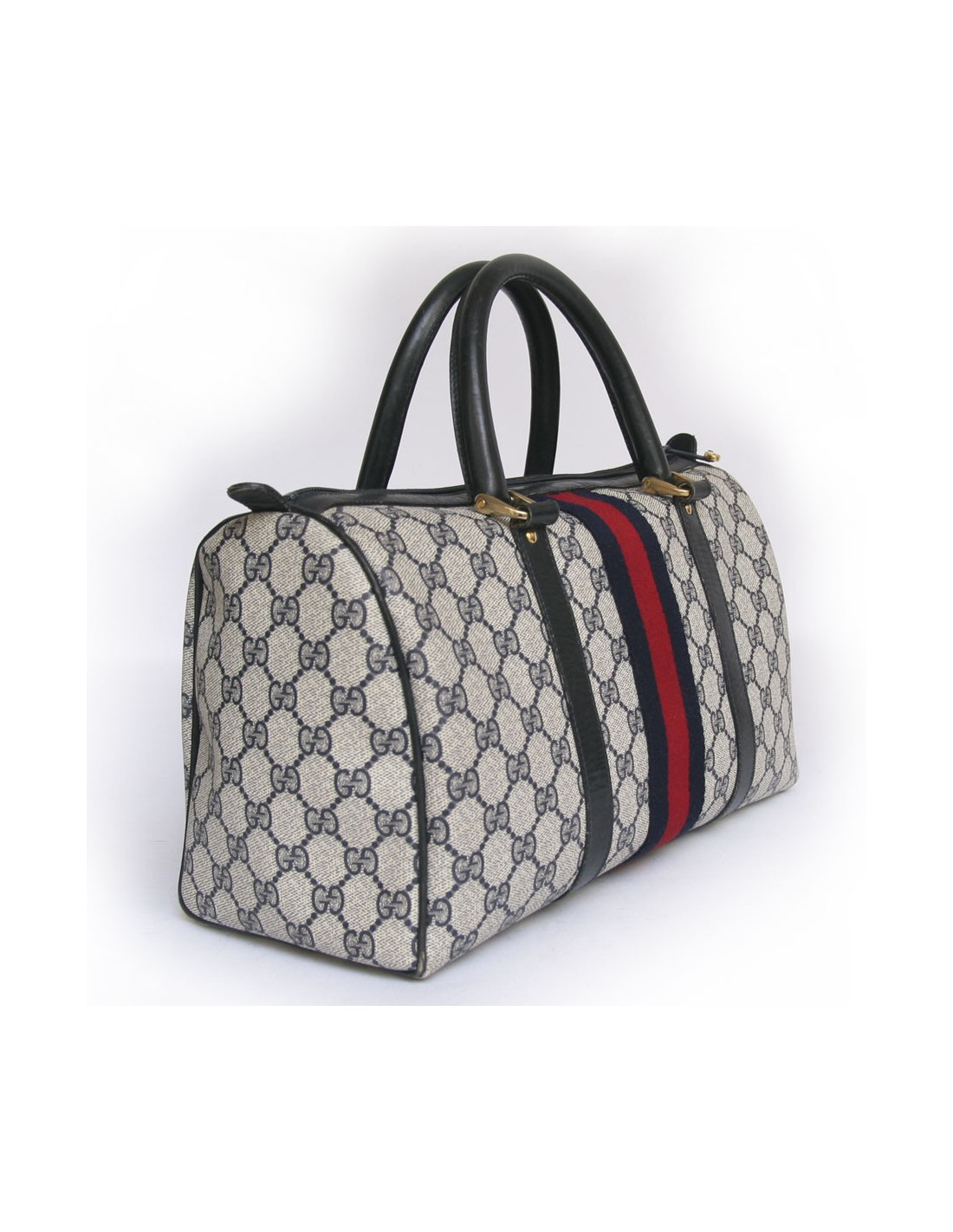 Sac 'speedy' Gucci en toile ciré monogrammé. La bijouterie est en laiton doré. Fermeture zippée. Double anse en cuir bleu marine. Deux grandes bandes de chaque coté du sac en tissu de couleurs bleu marine et bordeaux. Une poche intérieure zippée. En très bon état.