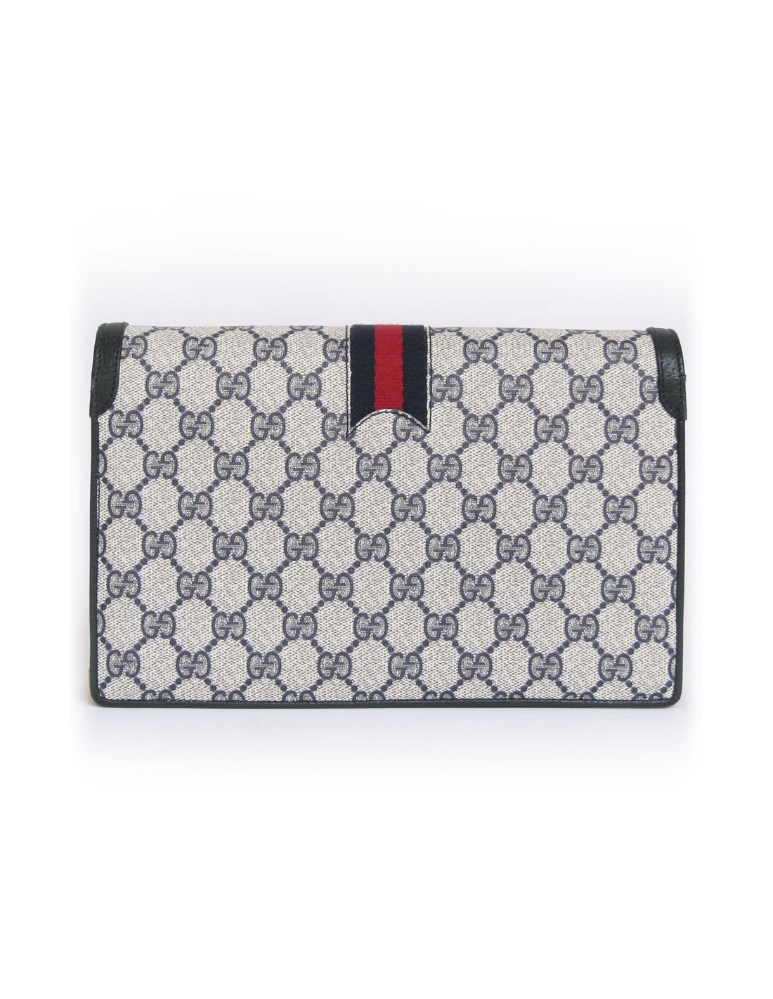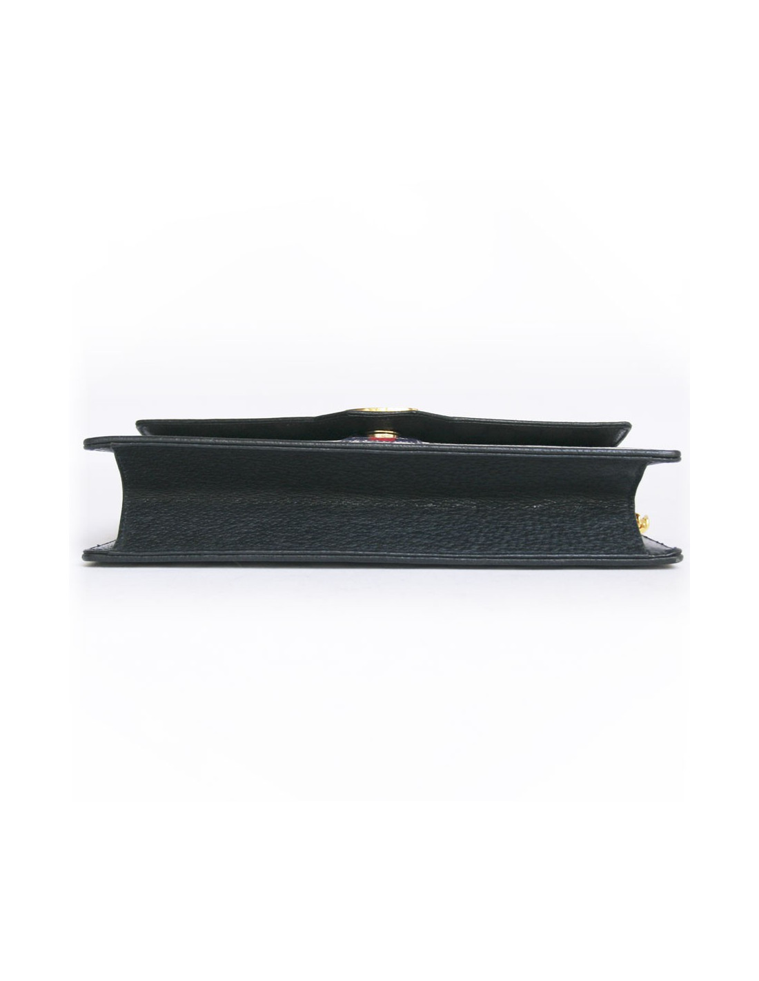 Sac Gucci en toile ciré monogrammé avec deux grandes bandes en tissu de couleurs bleu marine et bordeaux de chaque coté. La bandoulière est en métal doré. Fermoir pression. L'intérieur est en cuir bleu marine avec une grande poche zippée. En très bon état. il est légèrement décousu au niveau du côté.
