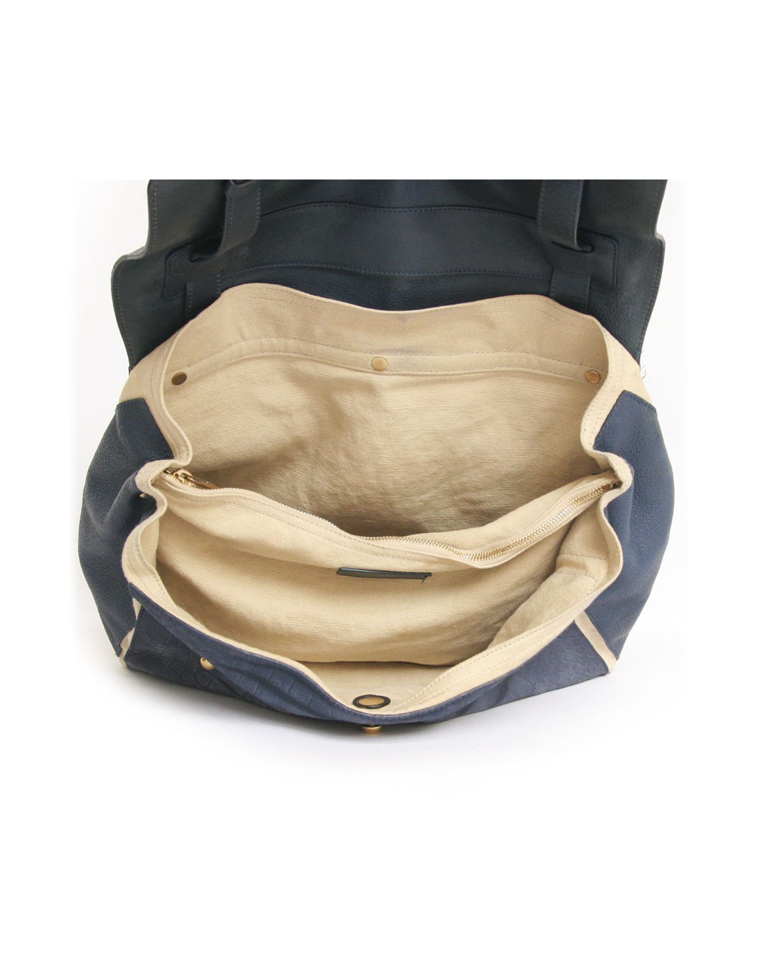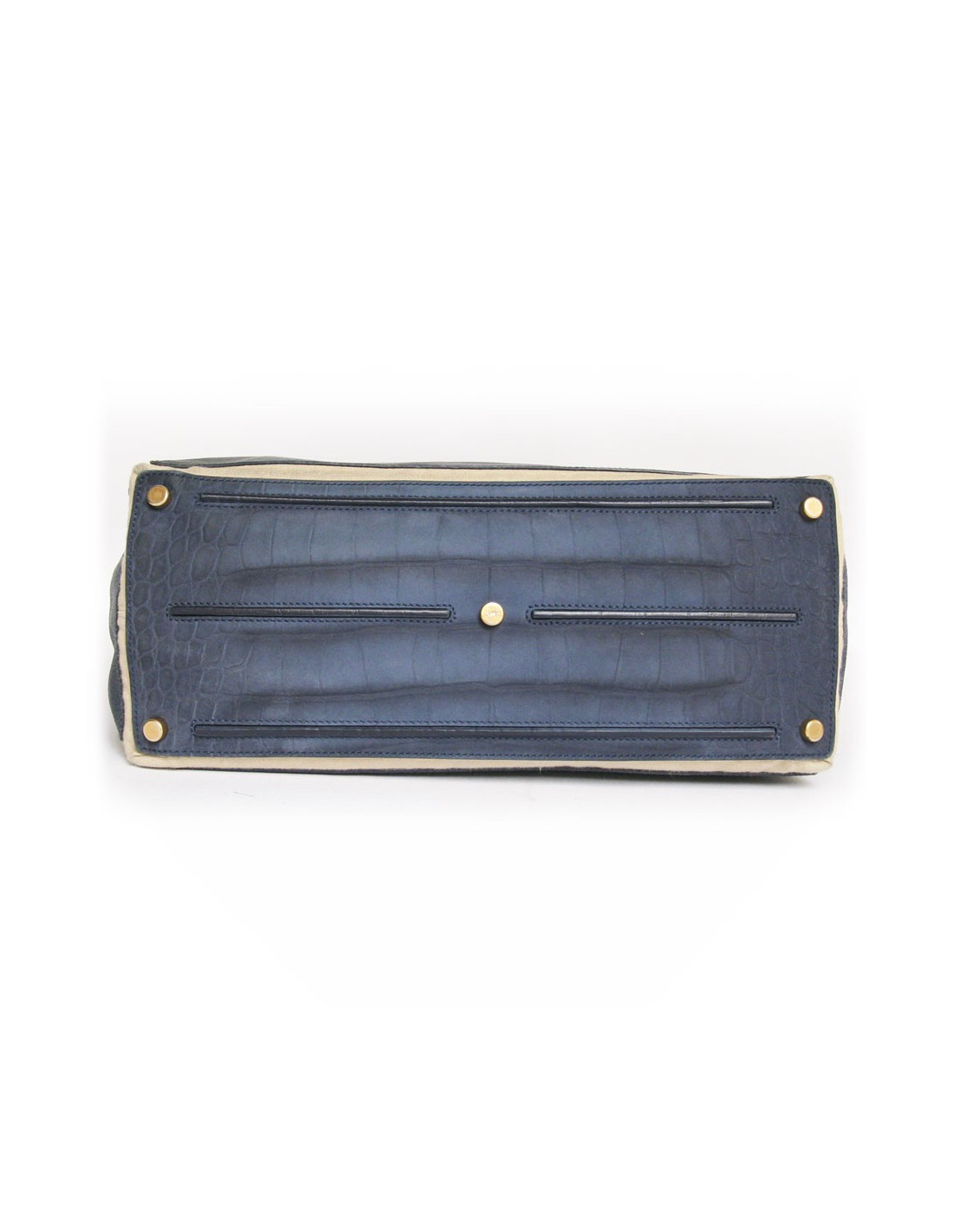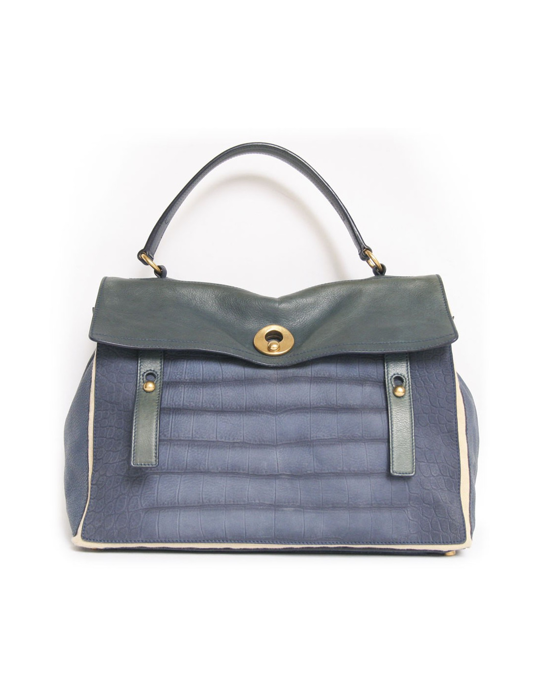 Indémodable sac Muse two de la Maison Yves Saint Laurent en cuir tricolore, dégradé de bleu. La garniture est en métal doré. Fermeture 3 clous sur rabat. Poche plaquée au dos du sac. Poignée en cuir imitation crocodile permettant de le porter à la main ou à l'épaule. Doublure intérieure en tissu beige, deux poches ouvertes et une poche centrale zippée. Ce sac icarne à merveille le chic parisien. En très bon état.