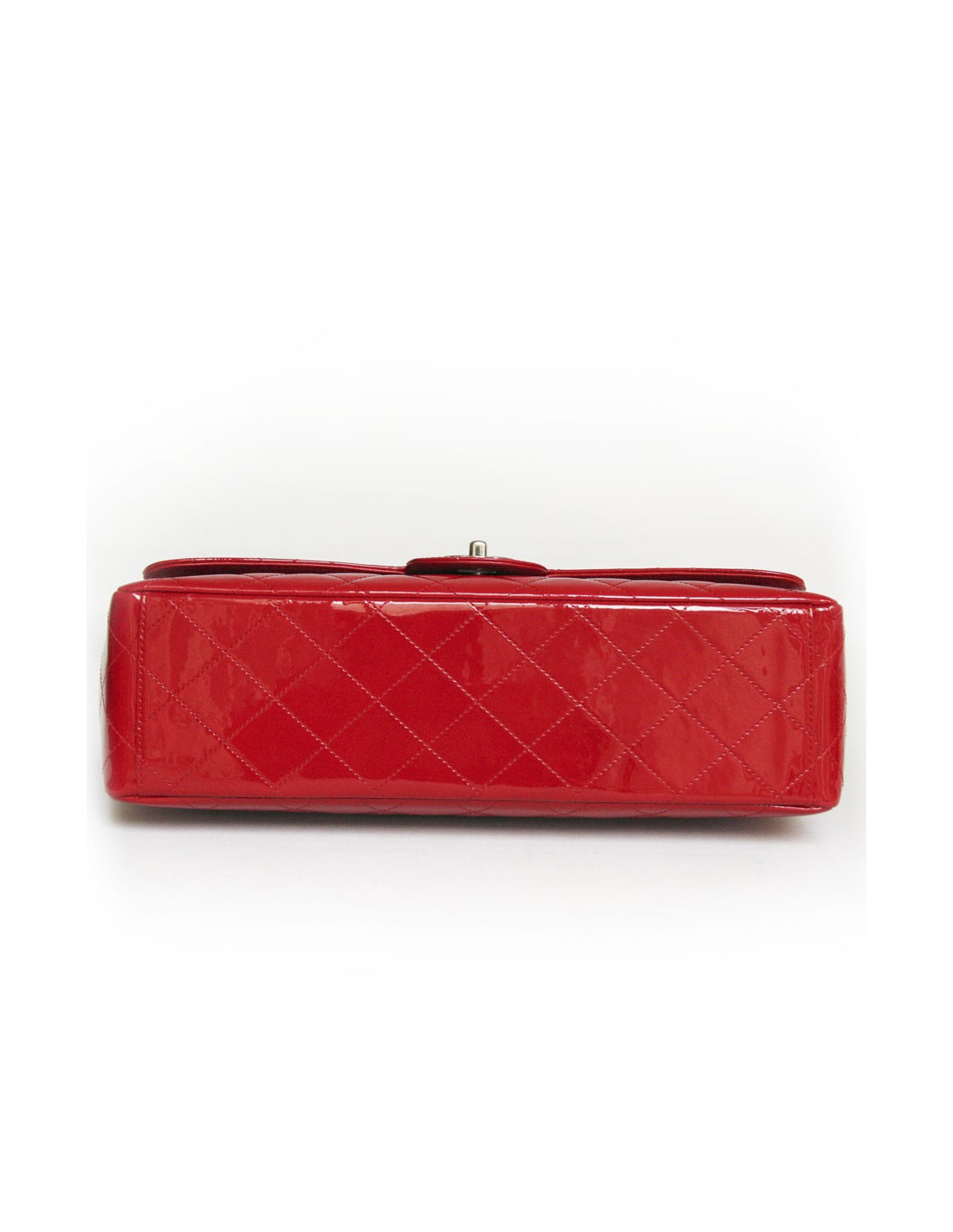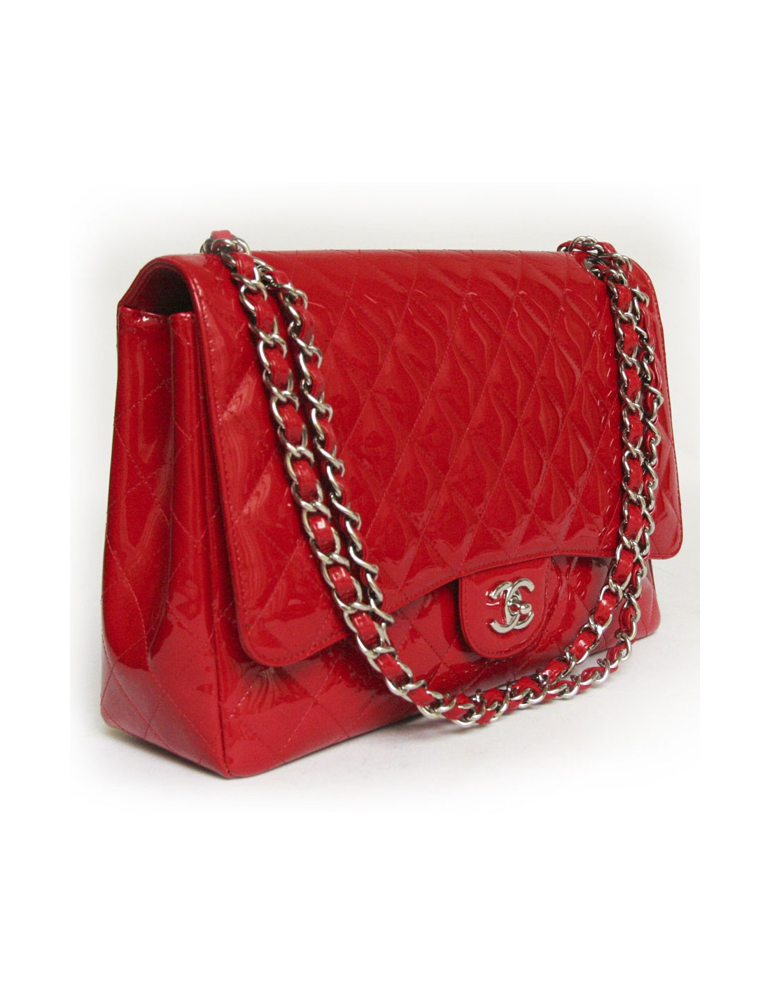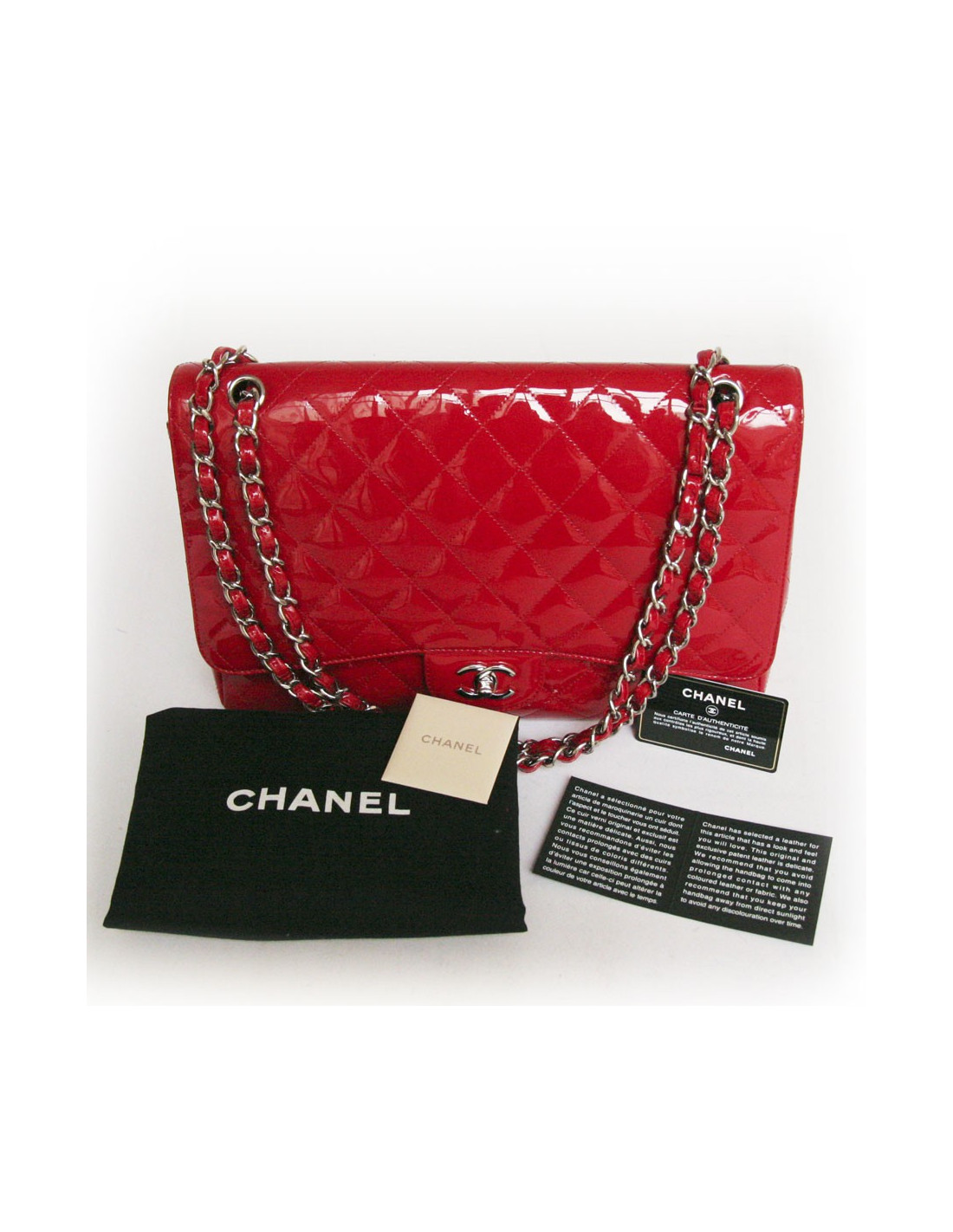 Sac Maxi Jumbo de la Maison Chanel en cuir verni rouge matelassé. L'intérieur est en cuir lisse rouge avec deux poches dont une zippée. Il se porte à l'épaule ou en crossover à l'aide de san bandoulière en chaine et cuir de la meme matière que le sac. Les ferrures sont métal argenté. Hologramme: 13 ... et sa carte d'authenticité. En très bon état. Très peu porté.