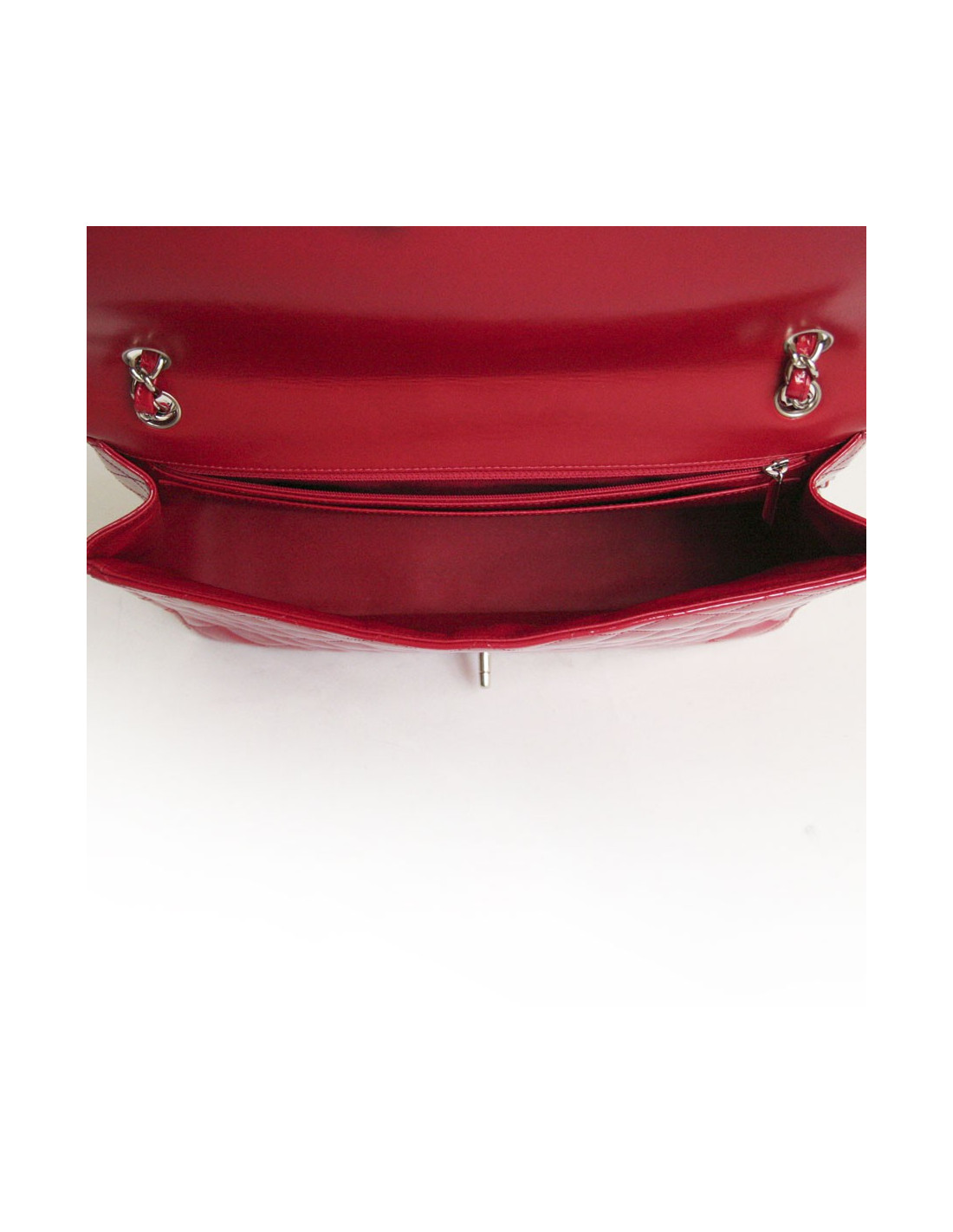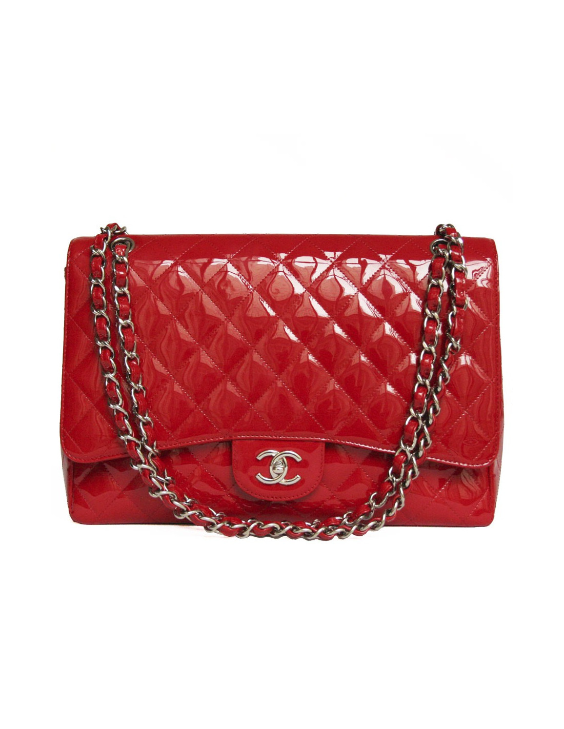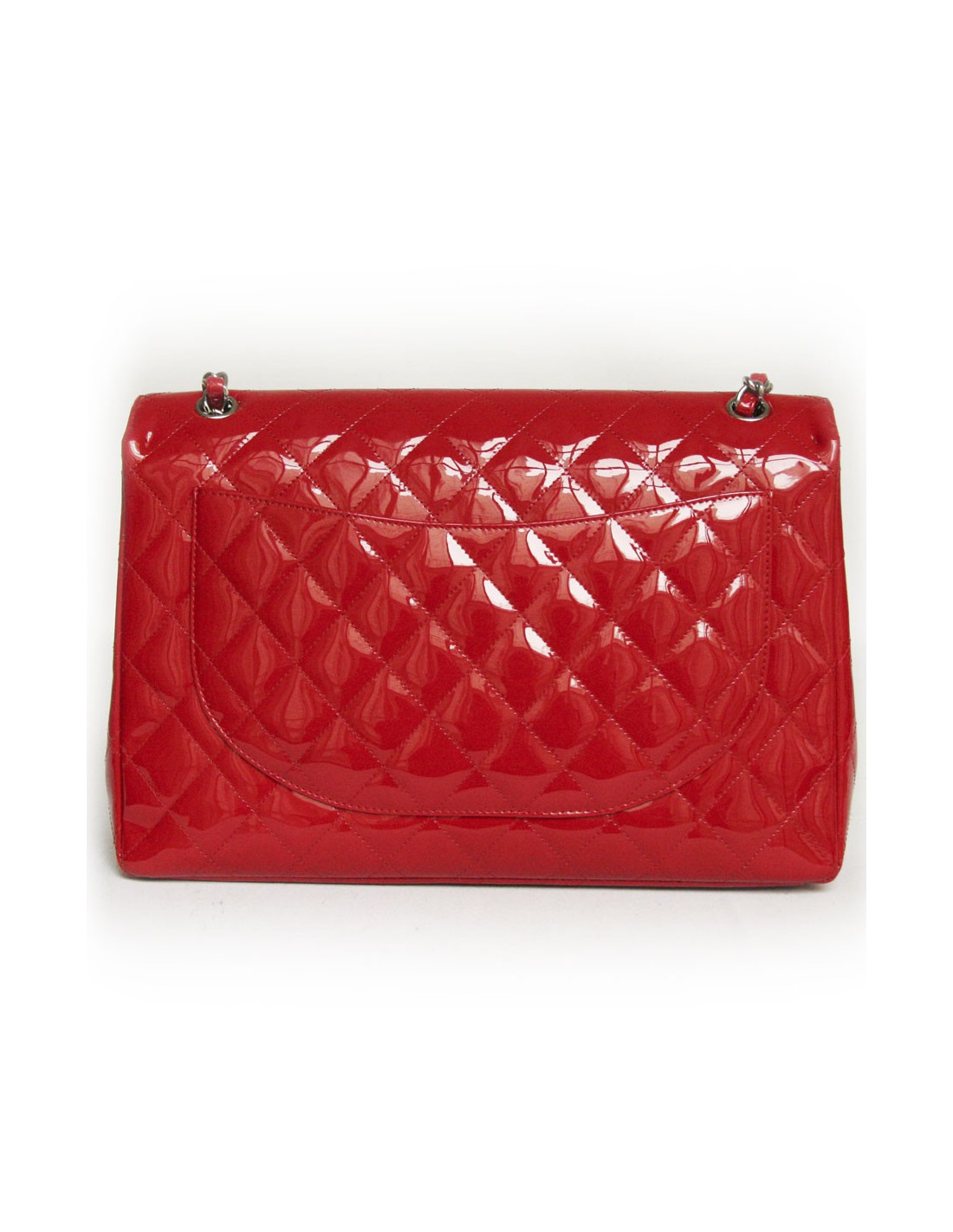 Sac Maxi Jumbo de la Maison Chanel en cuir verni rouge matelassé. L'intérieur est en cuir lisse rouge avec deux poches dont une zippée. Il se porte à l'épaule ou en crossover à l'aide de san bandoulière en chaine et cuir de la meme matière que le sac. Les ferrures sont métal argenté. Hologramme: 13 ... et sa carte d'authenticité. En très bon état. Très peu porté.