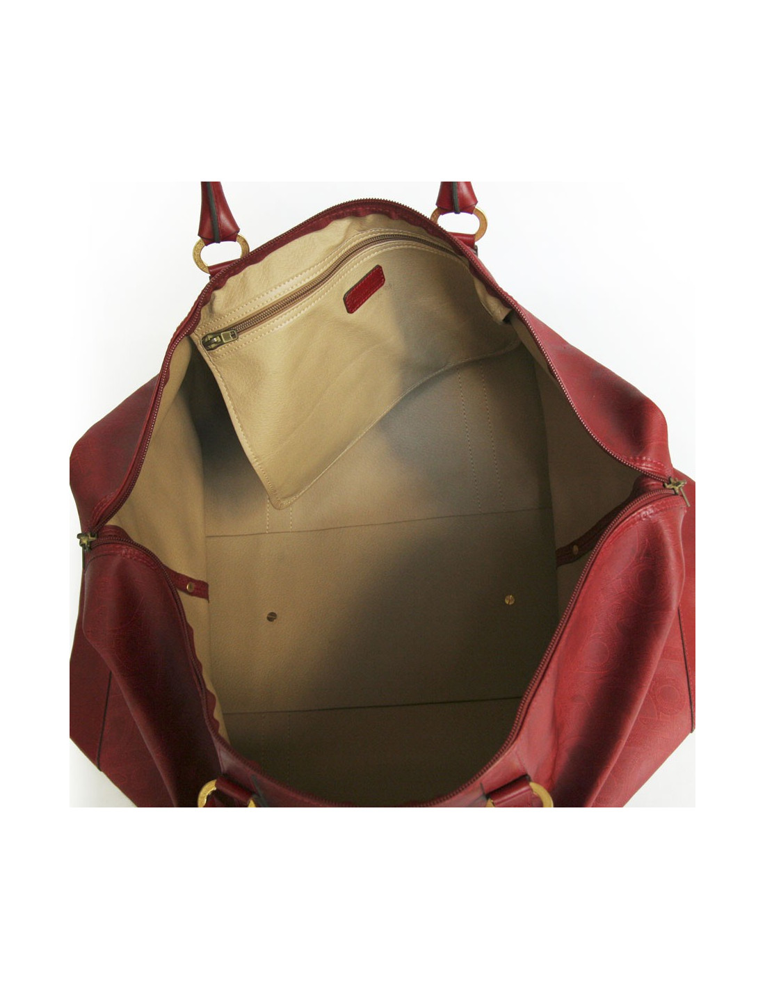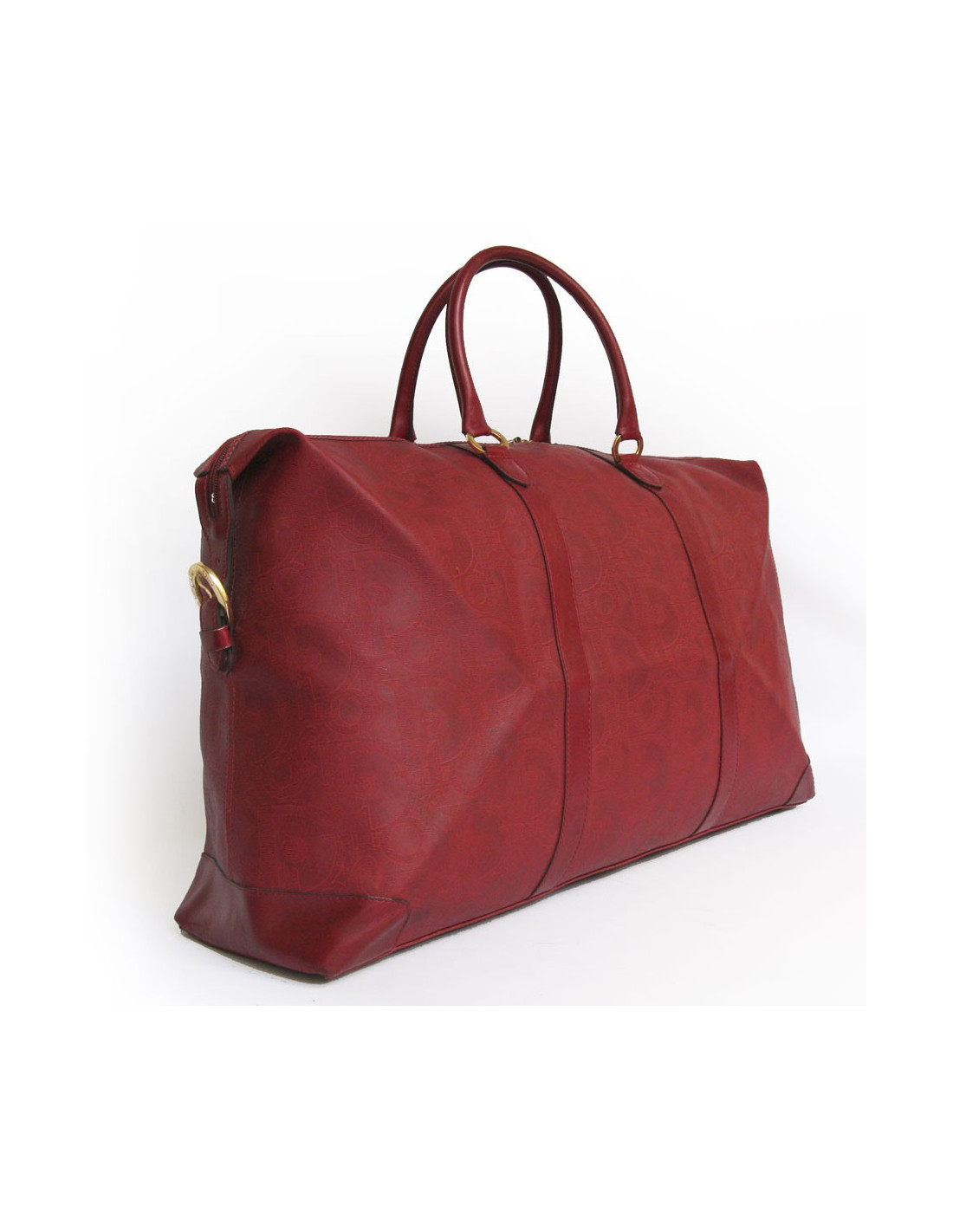 Très pratique !! Sac de voyage de la Maison Christian Dior en toile embossée rouge monogrammé. L'accastillage est en métal doré. Fermeture zippée. L'intérieur est en cuir beige avec une grande poche zippée. Double anses en cuir. En bon état. (une petite tache noire à l'avant ainsi que la patine du cuir sur les anses.)