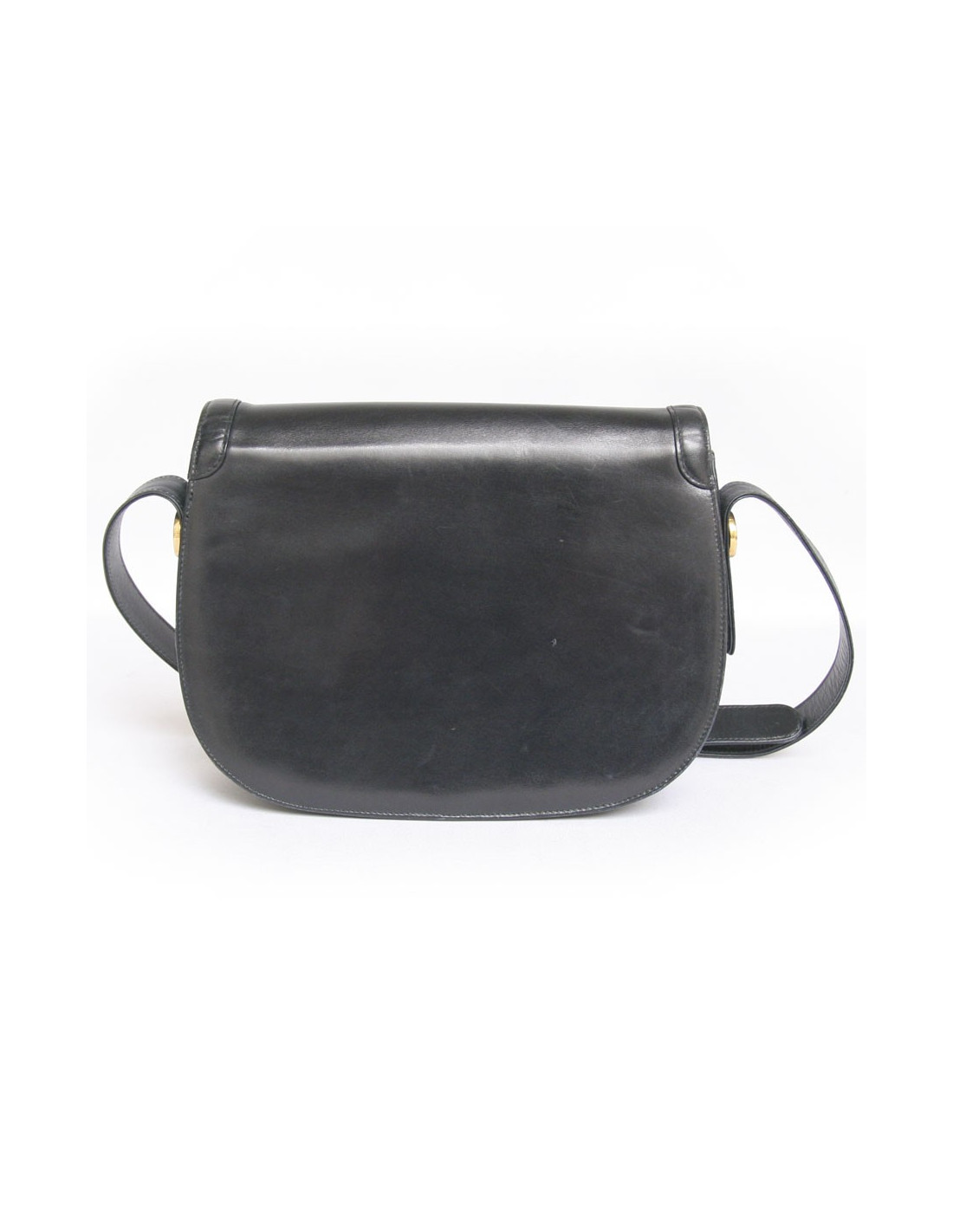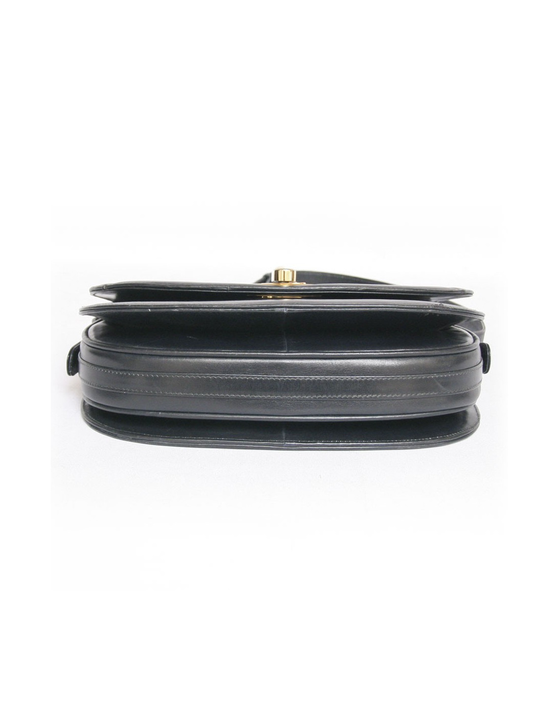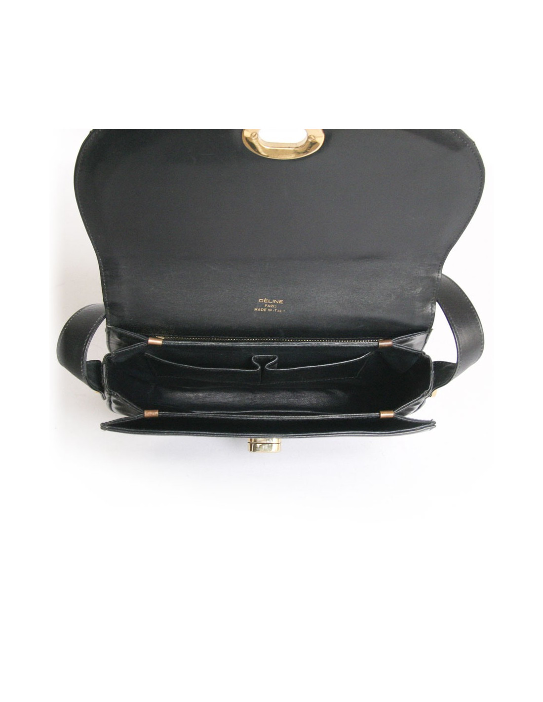 Sac Céline en cuir lisse bleu marine vintage. La bijouterie est en métal doré. Il se porte à l'épaule à l'aide d'une bandoulière ajustable. A l'intérieur, deux petites poches ainsi qu'une poche plaquée. Etat vintage. Légères rayures à l'avant du sac.
