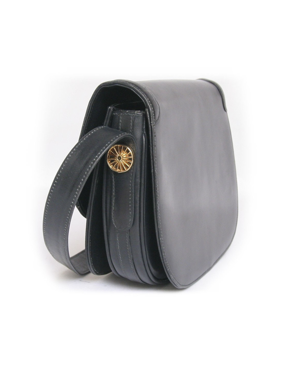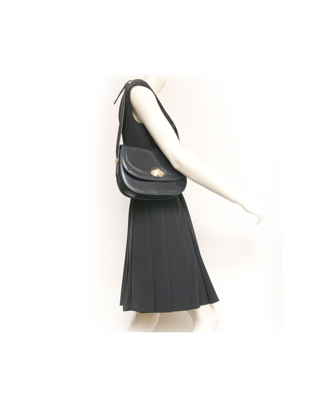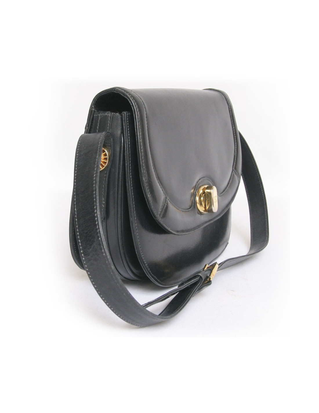 Sac Céline en cuir lisse bleu marine vintage. La bijouterie est en métal doré. Il se porte à l'épaule à l'aide d'une bandoulière ajustable. A l'intérieur, deux petites poches ainsi qu'une poche plaquée. Etat vintage. Légères rayures à l'avant du sac.