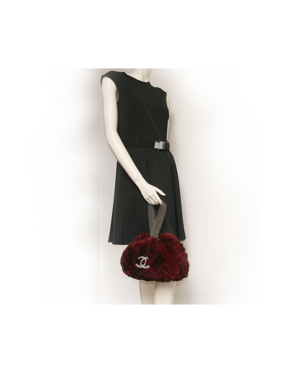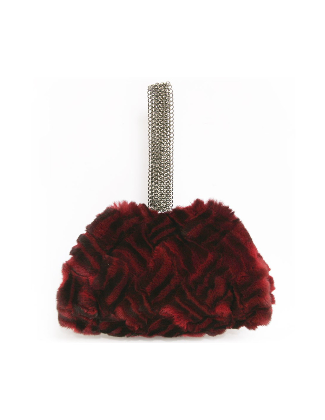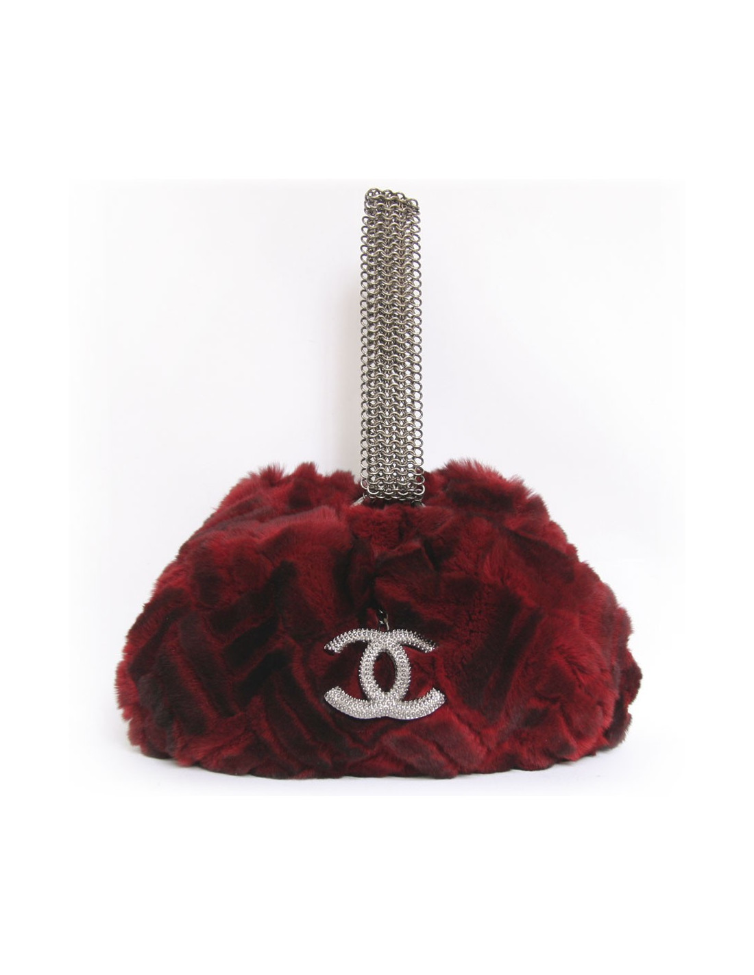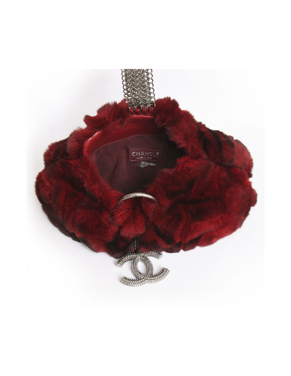 Sublime sac-manchon Chanel en orylag de couleur rouge-bordeaux, on peut y apercevoir de jolis reflets noirs. Le manchon comporte une anse épaisse en métal argenté, au milieu du manchon on retrouve le sublime double C de la maison Chanel. Une ouverture pour les mains de chaque coté du manchon. Il peut être porté trés facilement de deux manières. Pièce superbe et rare. Parfait état.