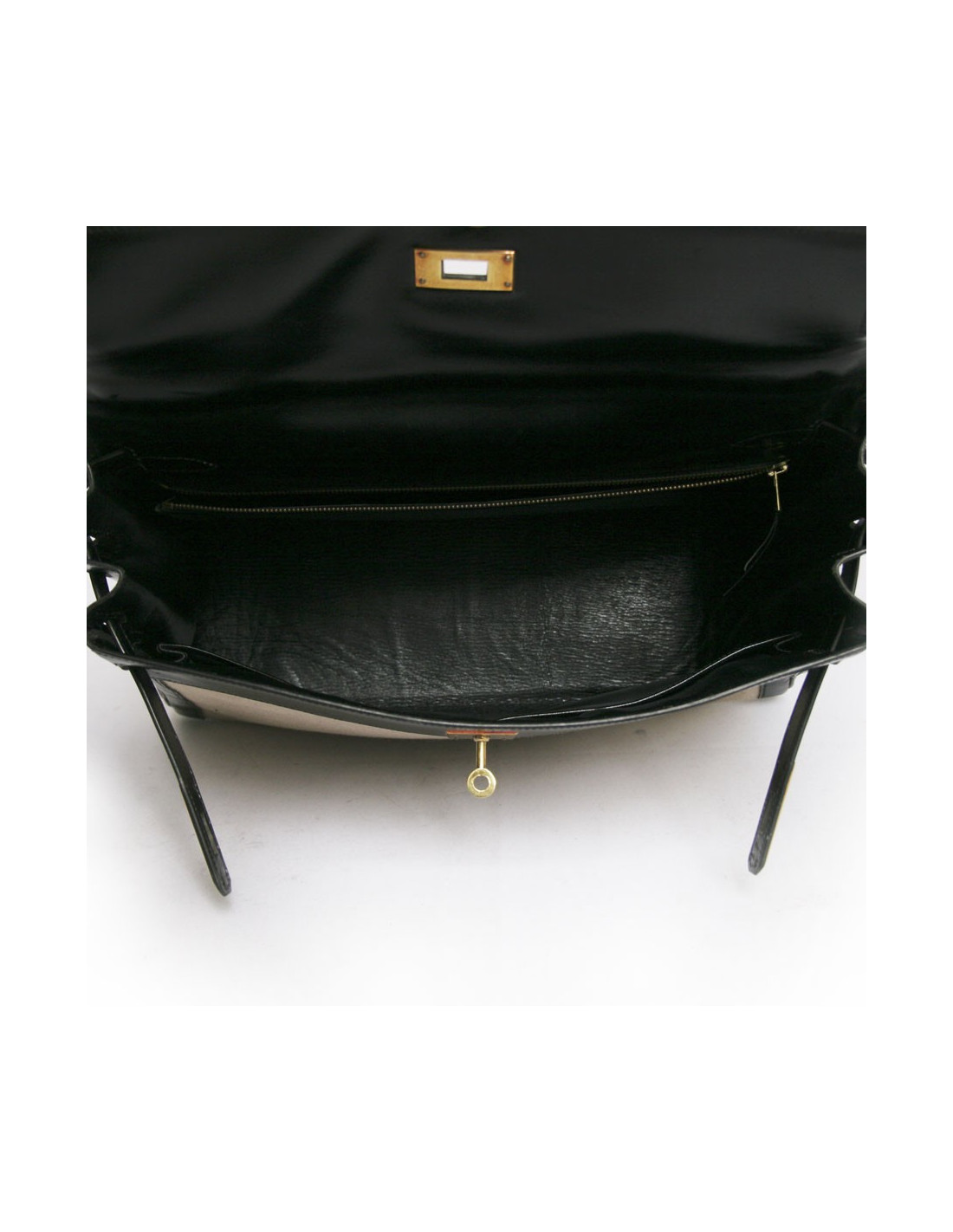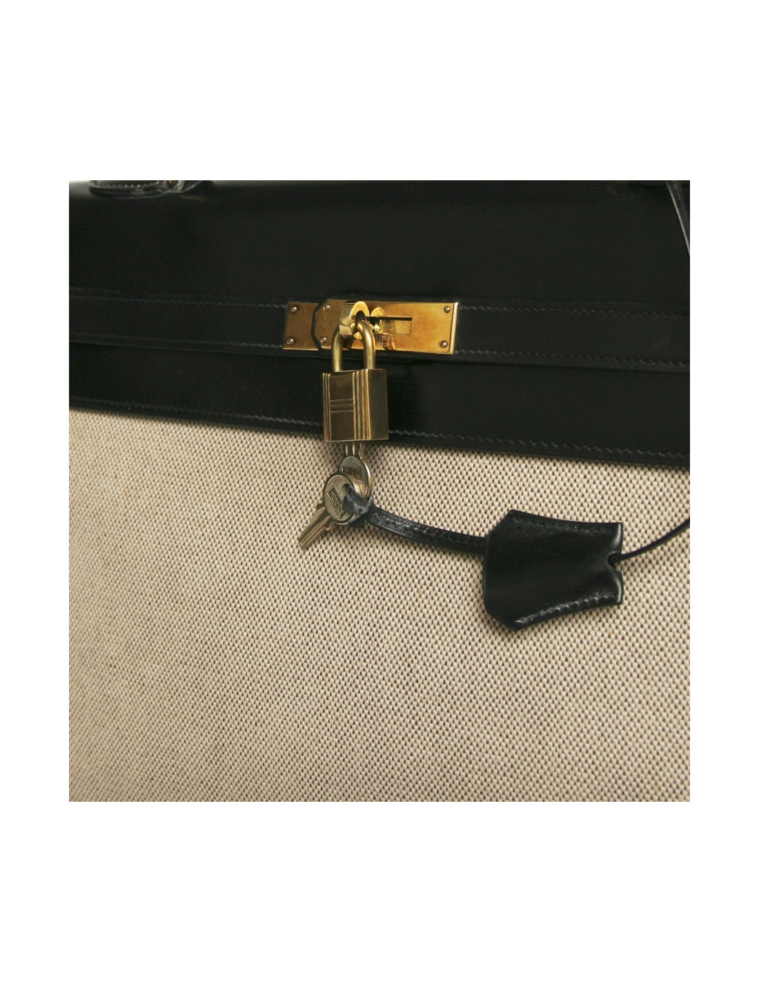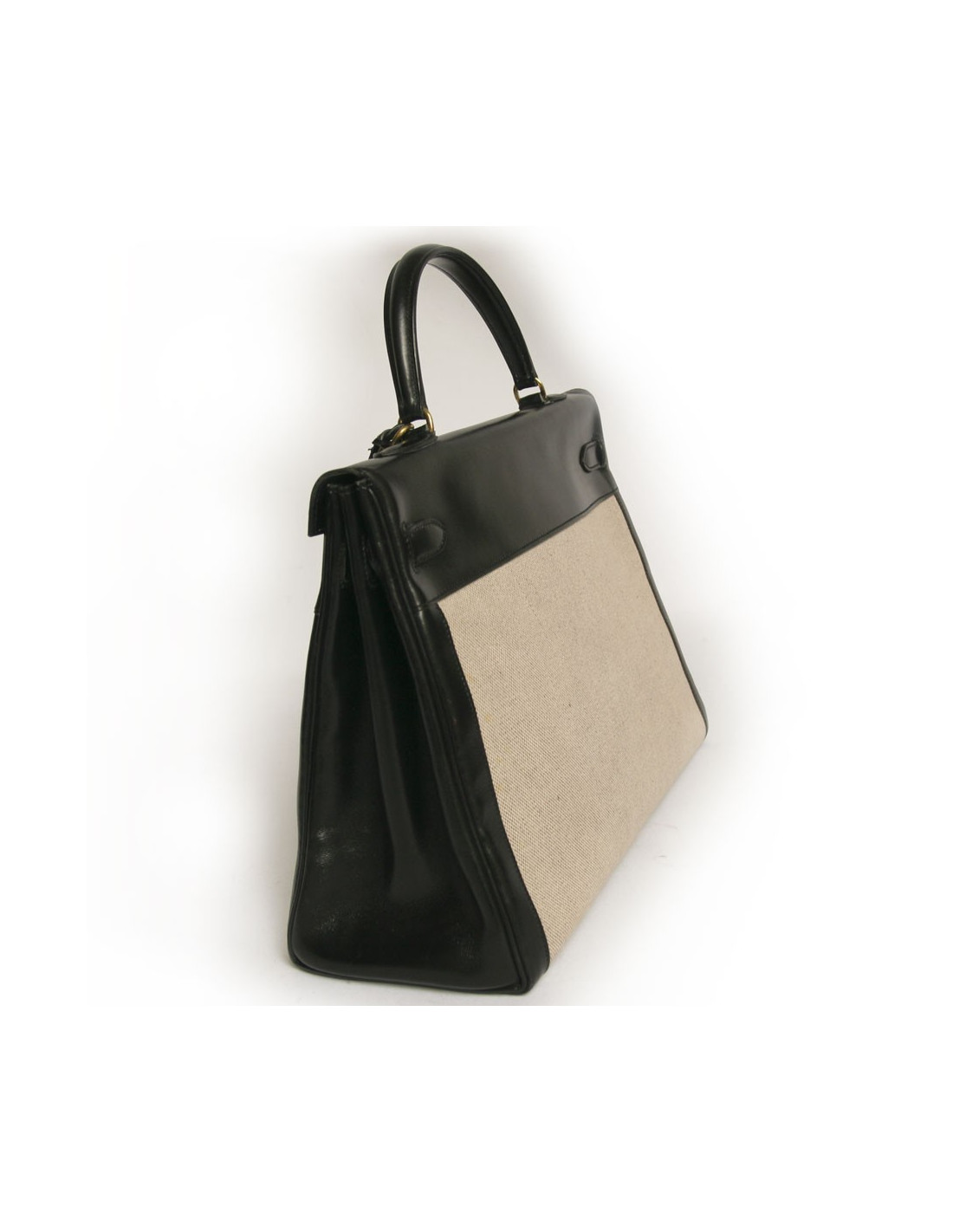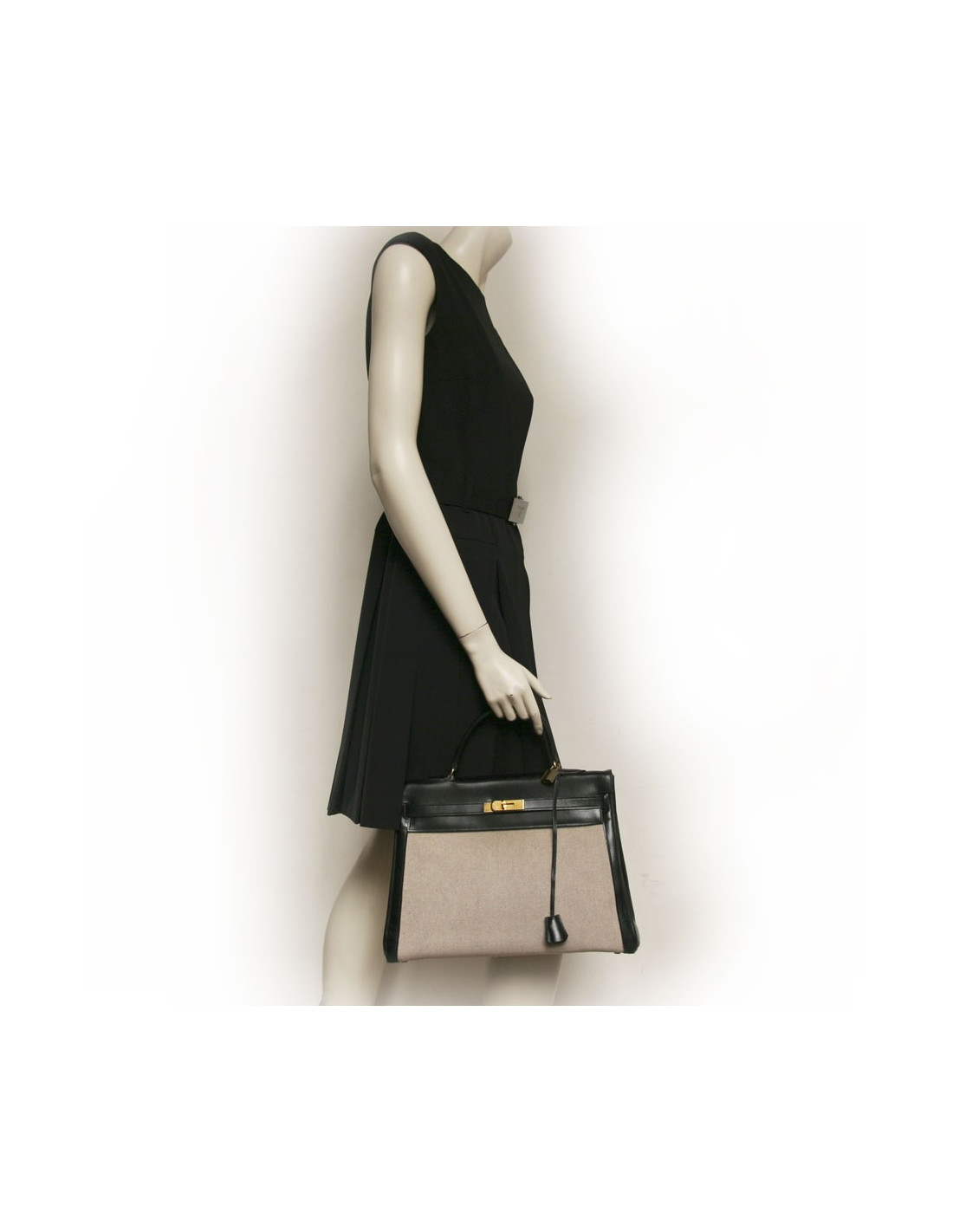 L'indétronable sac Kelly 35 de la Maison Hermès en cuir noir et toile. L'accastillage est en laiton doré. Cadenas, clochette et deux clefs. A l'intérieur, il dispose de 3 grandes poches dont une zippée. En très bon état. Petite patine du cuir sur l'anse et sur la languette qui aide à fermer le sac ainsi que des petites taches jaunes très légères sur la toile à l'arrière du sac.