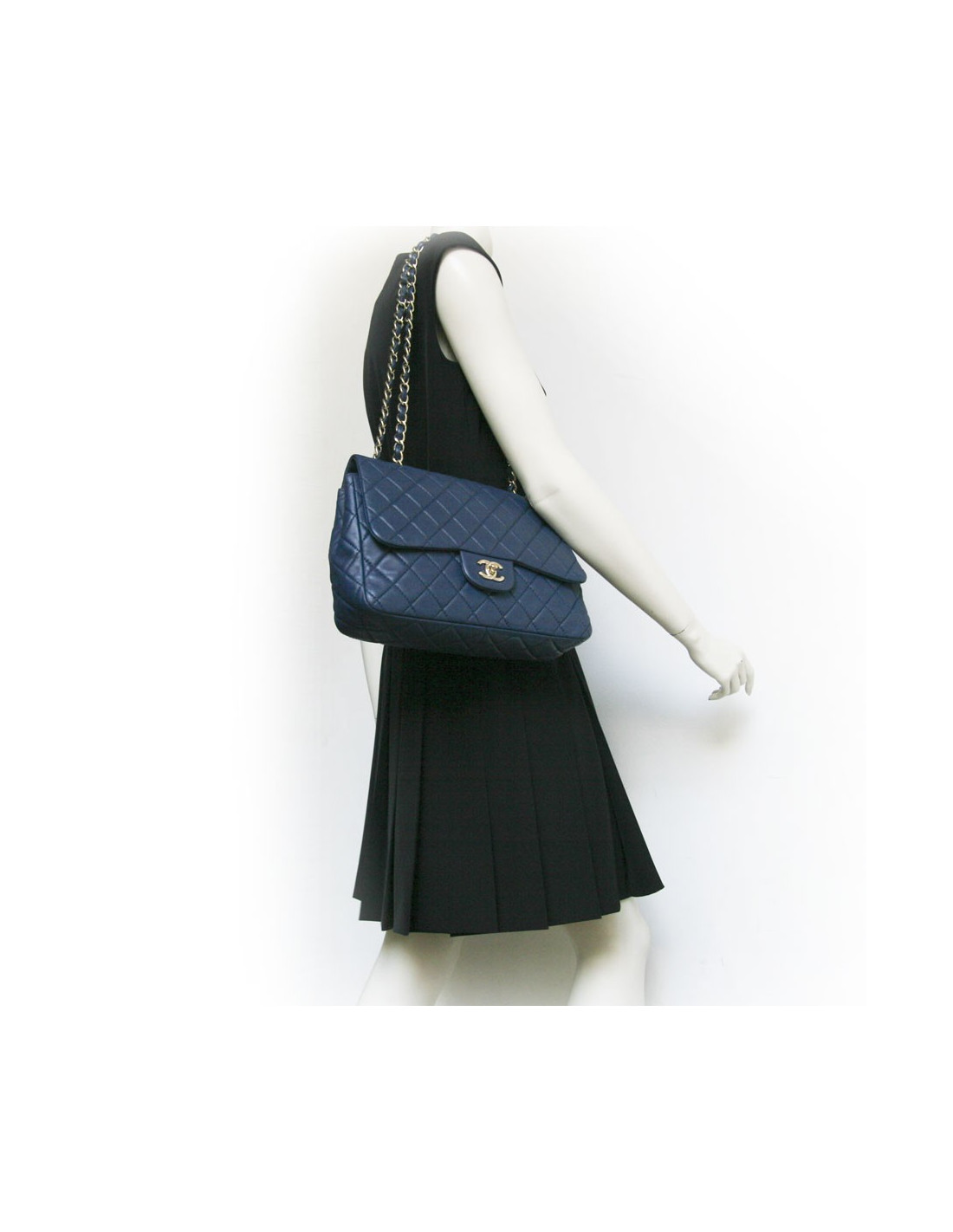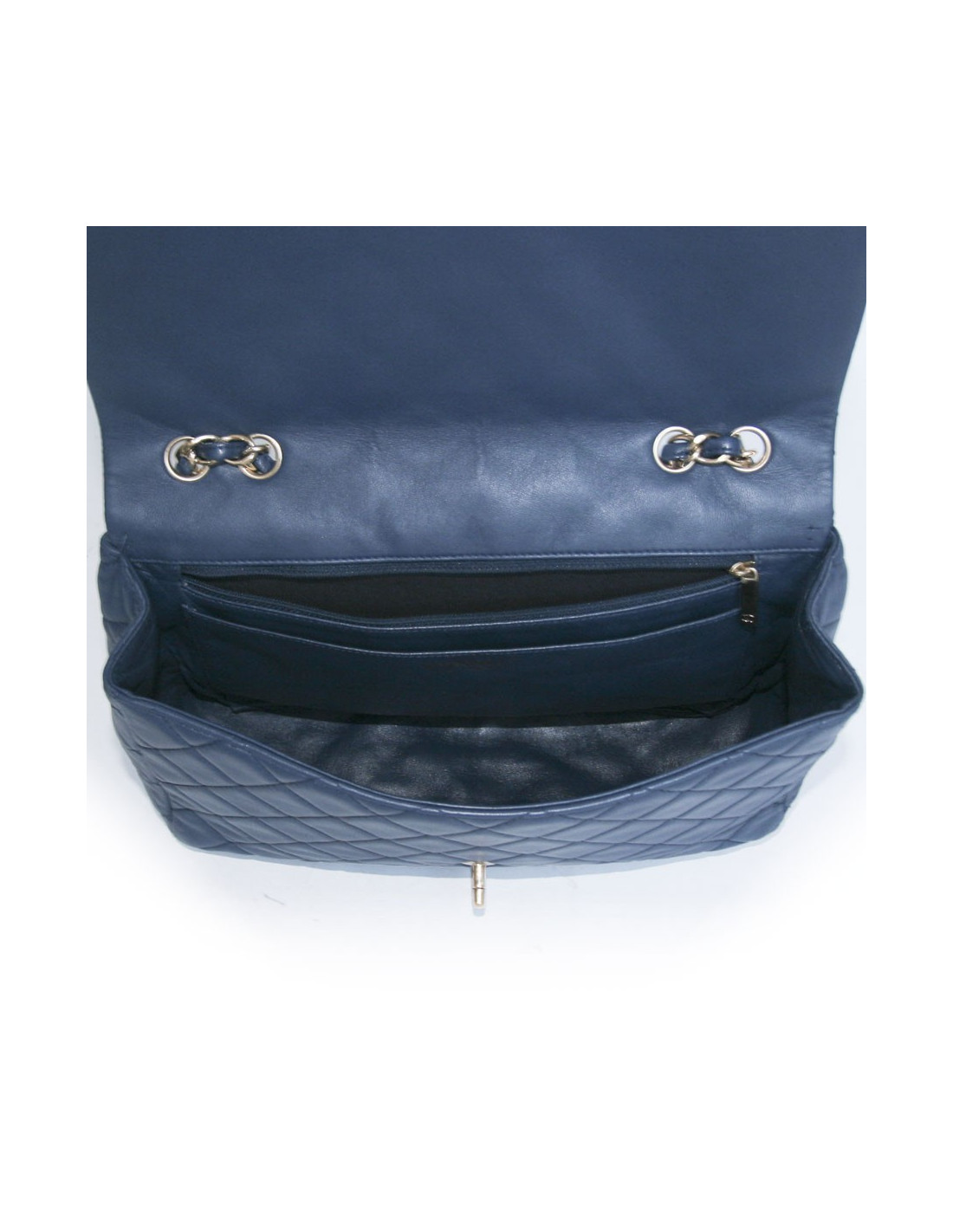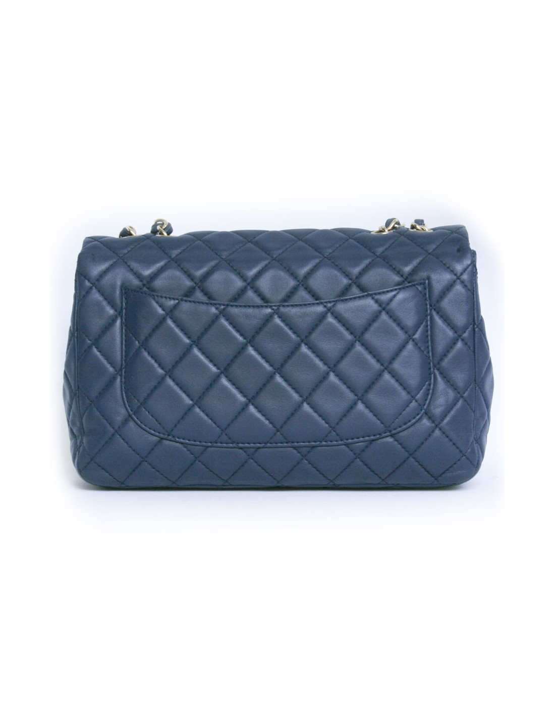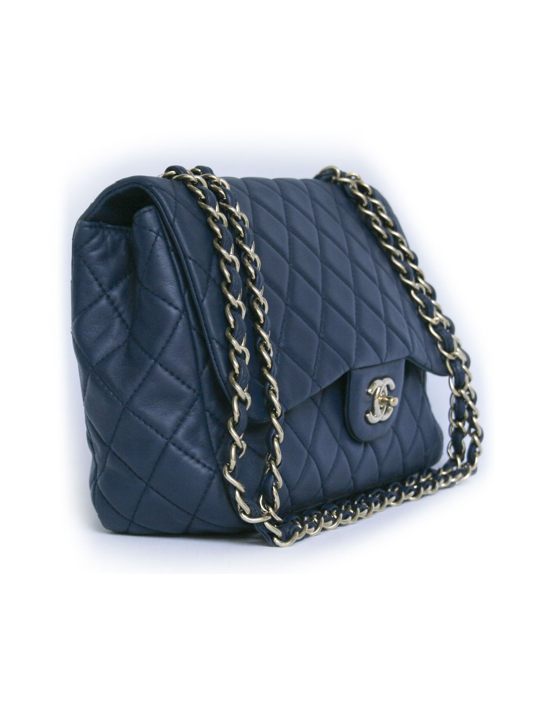 L'intemporelle sac Jumbo Chanel en cuir de veau matelassé et de couleur bleu jean. Fermoir CC. La bijouterie est en laiton doré. A l'intérieur, deux poches plaquées dont une zippée. Une poche plaquée à l'arrière également. La bandoulière est en chaine et cuir de la meme couleur que le sac. Hologramme: 12... En très bon état.