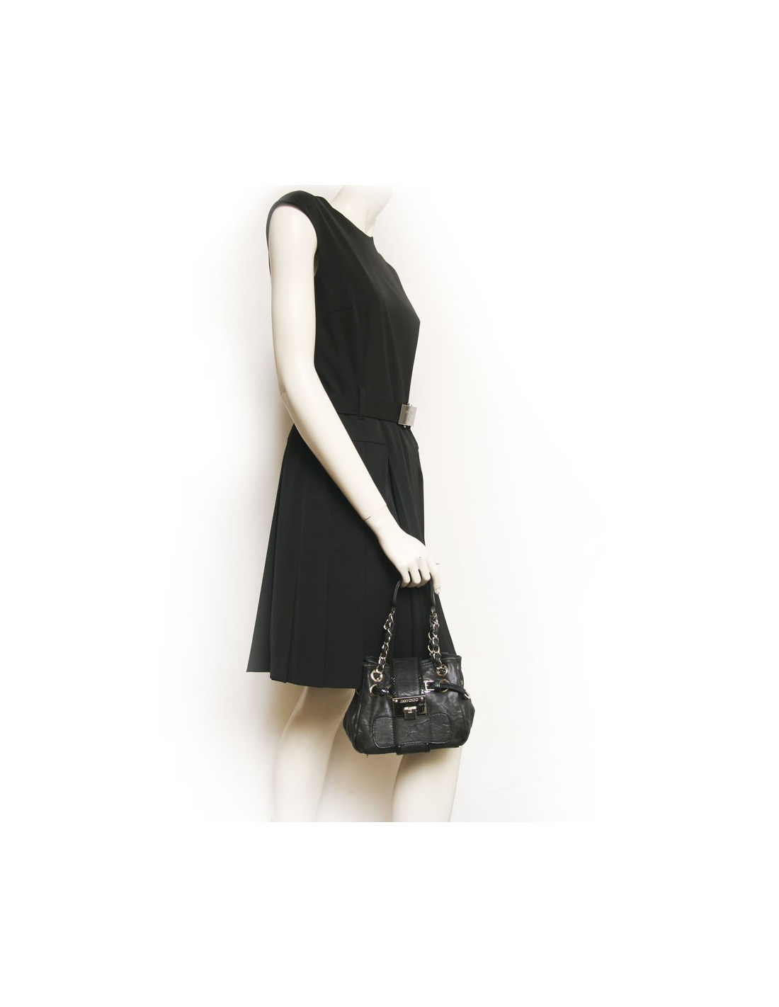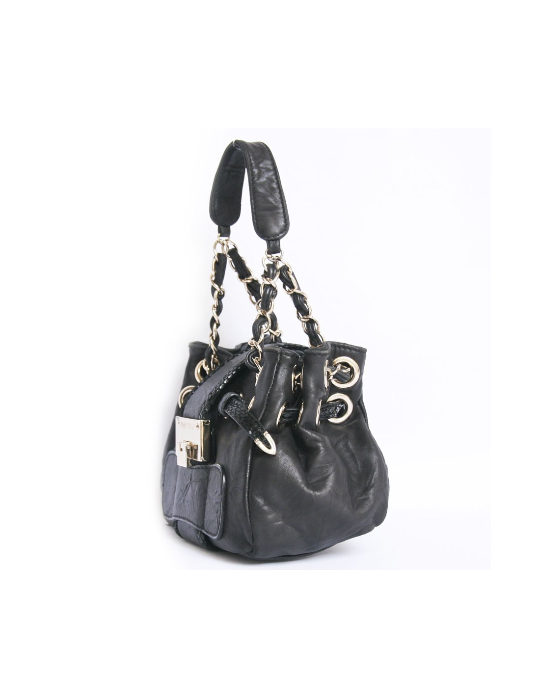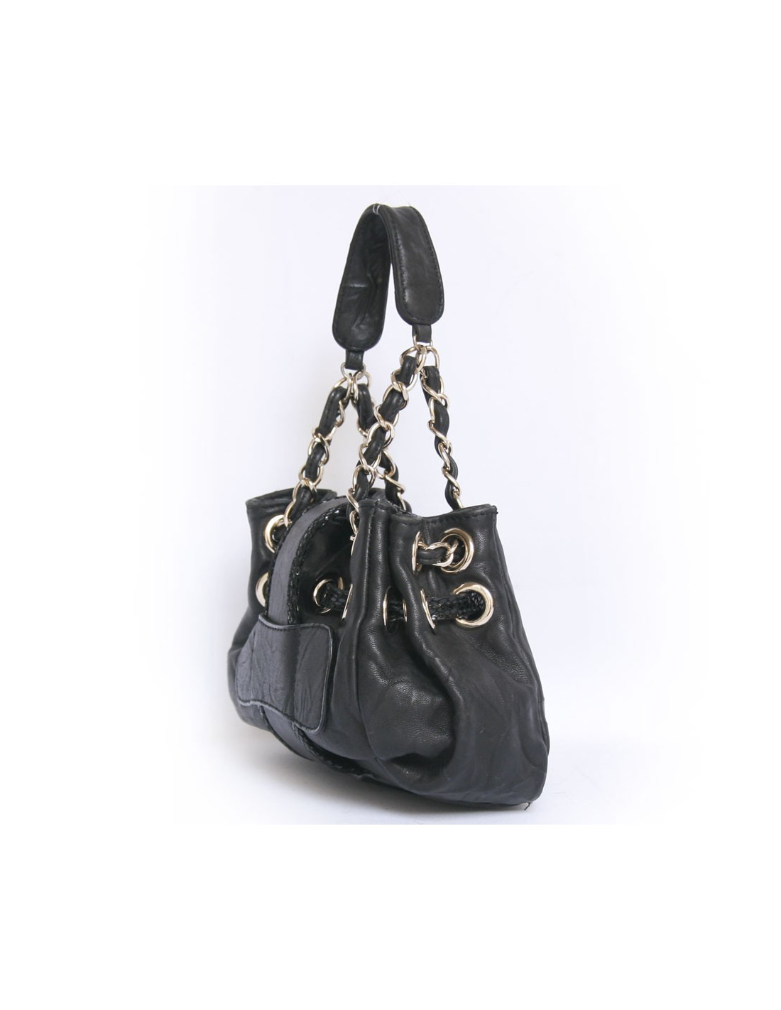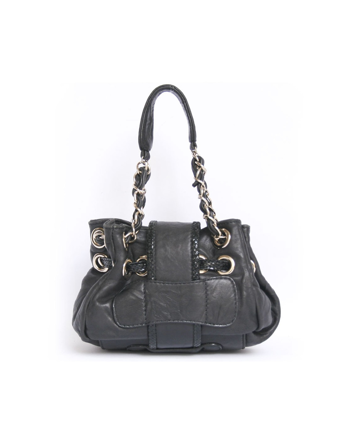 Mini sac Jimmy Choo en cuir noir et serpent. Il se porte à la main à l'aide d'une anse en chaine doré et cuir de la même couleur que le sac. L'accastillage est en métal doré. L'intérieur est en tissu noir avec une petite poche. En très bon état. Légère patine du cuir sur les coutures à l'avant du sac.