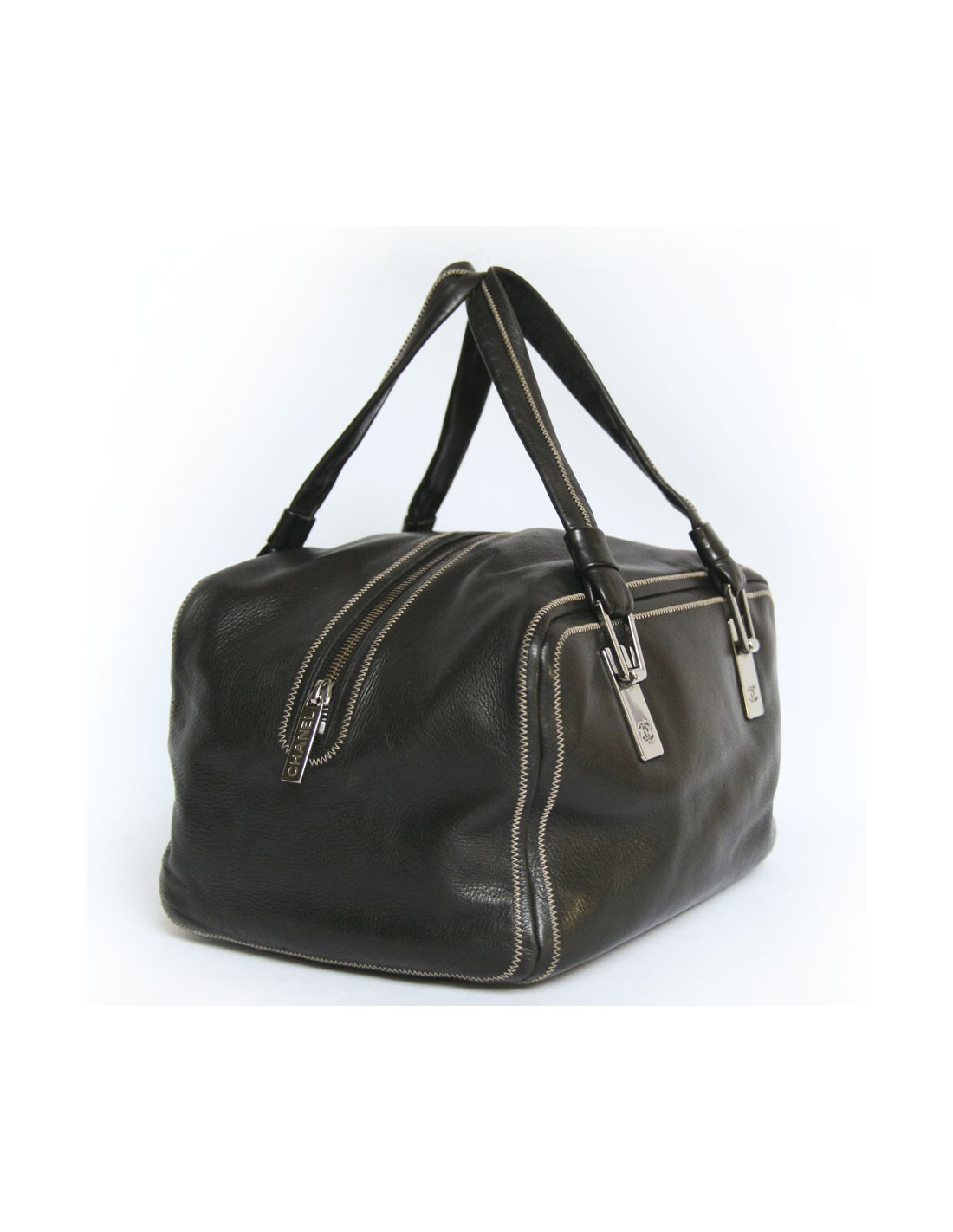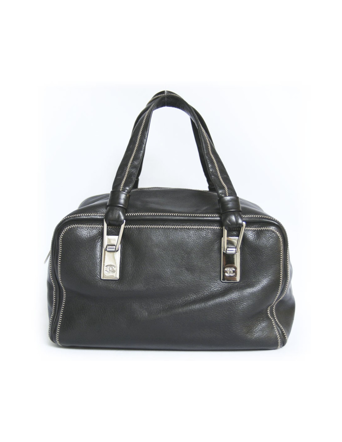 Sac bowling Chanel en cuir d'agneau noir. Fermeture zippée. L'accastillage est en métal doré. Les surpiqûres sont grises. L'intérieur est en tissu monogram beige avec une poche zippée. Double poignée. En très bon état. Très légères rayures sous le sac. Carte d'authenticité 8525...(l'hologramme s'est détaché)