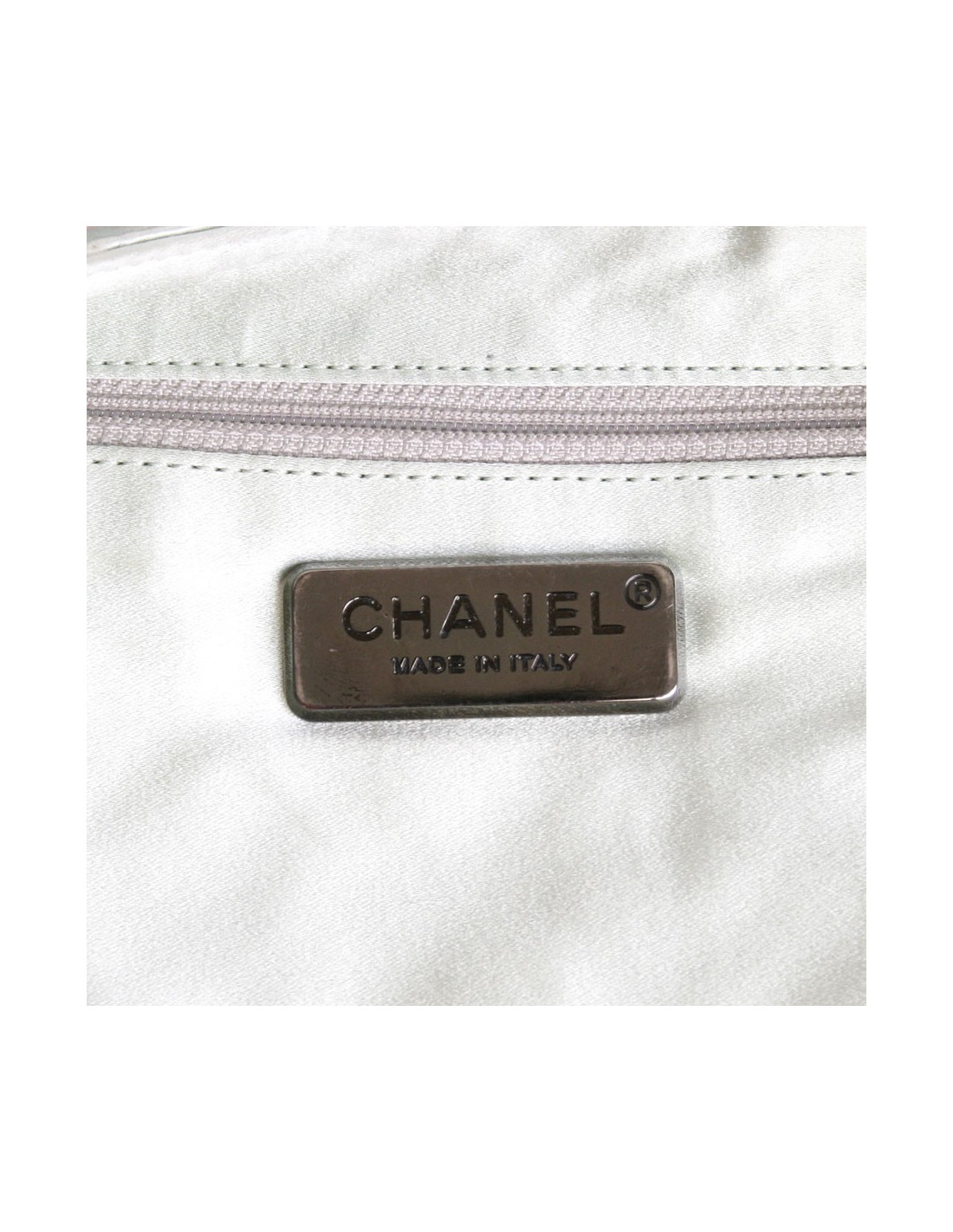 Se porte au bras, à l'épaule ou en crossover grâce à une chaîne de 119 cm. L'intérieur en satin comporte une poche ornée d'une plaque argentée "Chanel". Le sac se ferme grâce à un bouton aimanté à l'intérieur, le fond du sac est rigide, de manière à conserver sa forme. bijouterie argent.