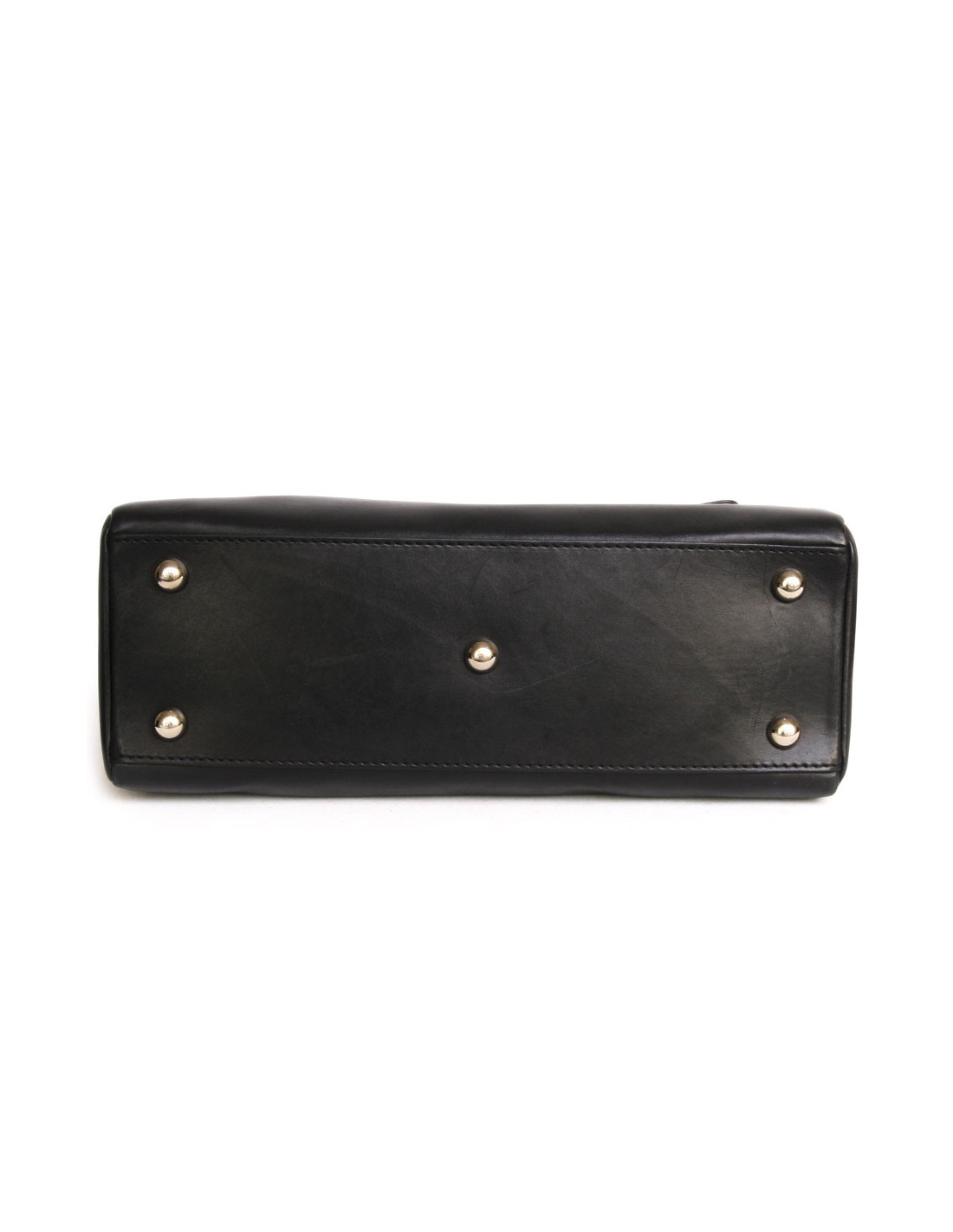 Sac en cuir lisse, orné de clous sur la fermeture, l'anse et la bandoulière (détachable). Celle-ci mesure 86 cm, ainsi le sac peut se porter au bras, à l'épaule ou en crossover. L'intérieur en toile soyeuse dispose de 5 poches dont une zippée. Le cuir comporte quelques infimes traces d'usage notamment sur l'anse.