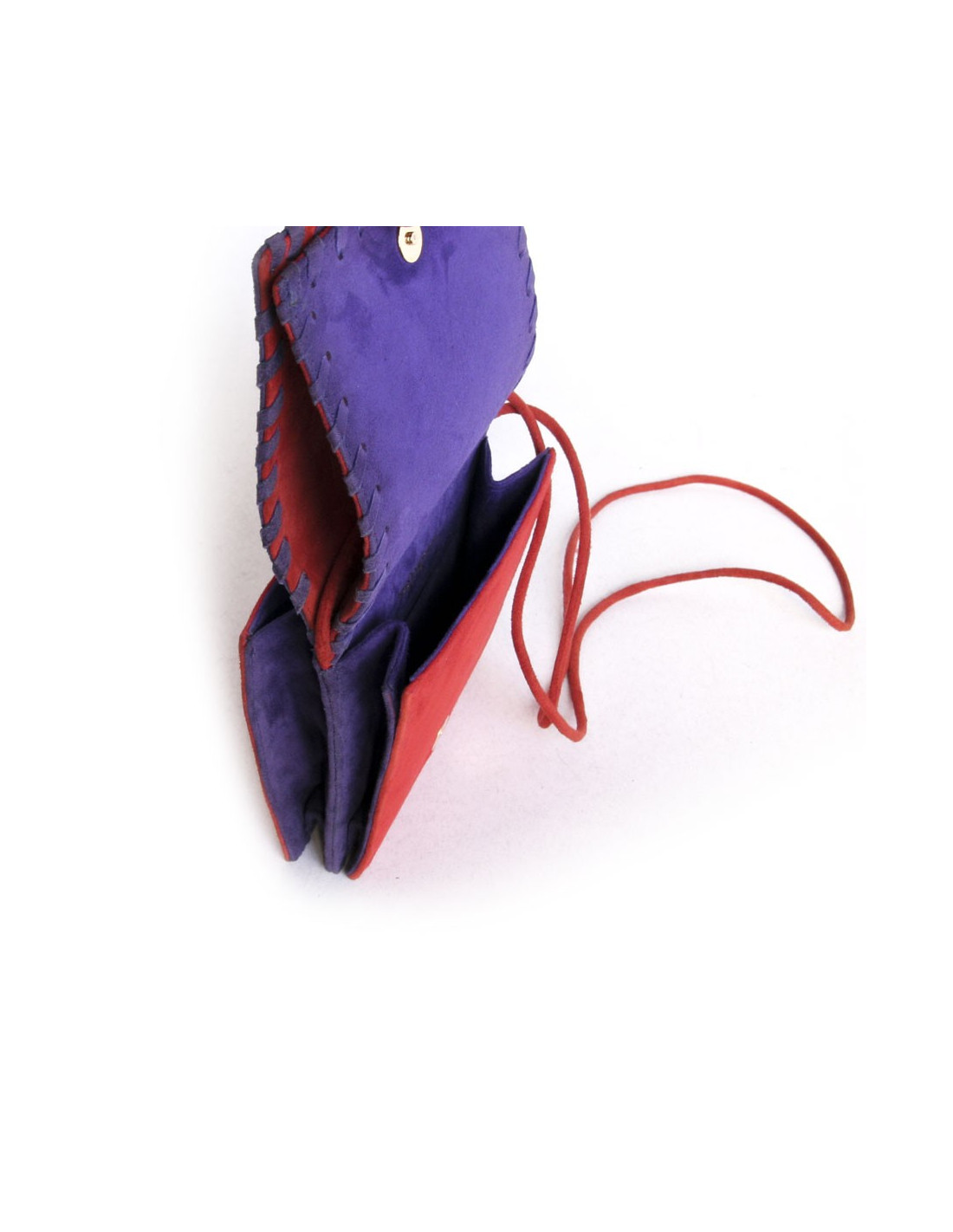 Pochette YVES SAINT LAURENT en veau velours rouge,vintage. Double ouverture. Intérieur en veau velours violet. Poche intérieur. Fermeture par bouton pression doré. Porté épaule ou crossover à l'aide d'une bandoulière rouge de 105 cm.