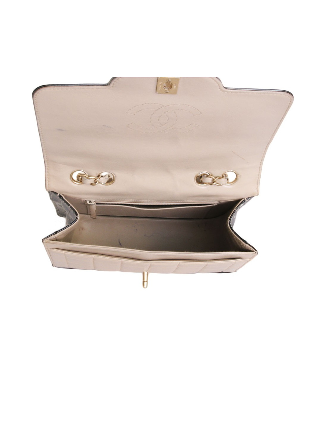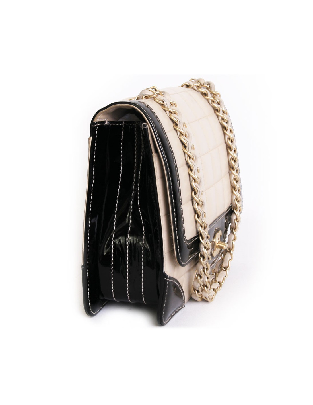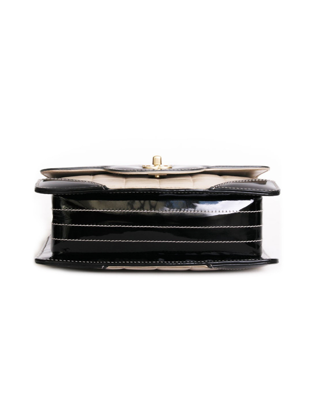 Fermeture "double C" par pivot, contours en cuir noir verni.