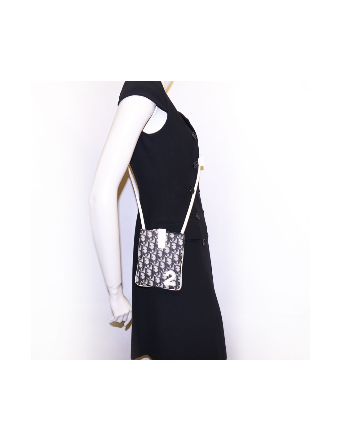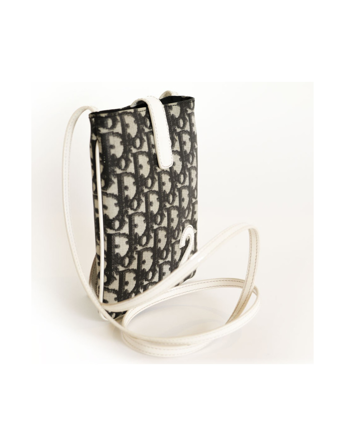 Pochette Dior en toile monogram, vintage. numéro de série BM-0012. La doublure est en tissu noir, avec une poche intérieure. L'anse et le fermoir (se ferme par un aiment) est en cuir verni blanc..