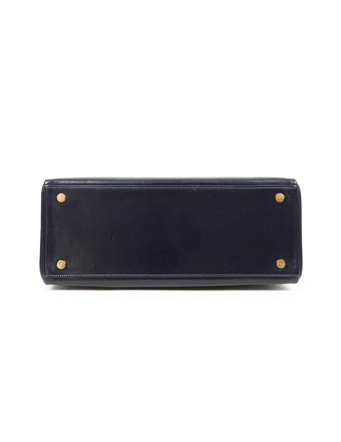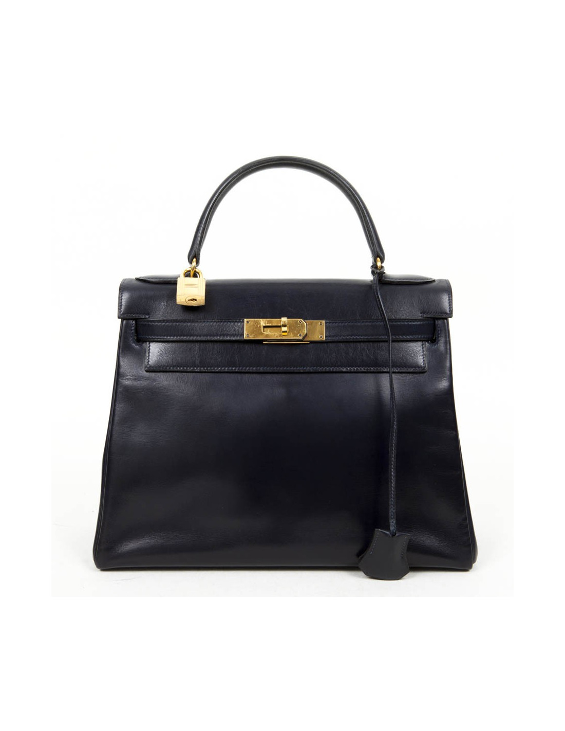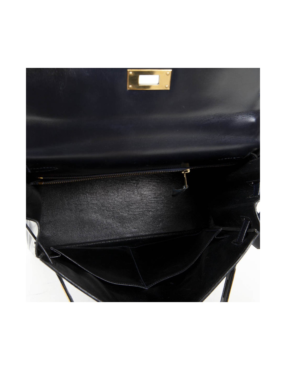 Exceptionnel! Kelly 28 de la Maison Hermès en cuir box bleu nuit. La bijouterie est en plaqué or. A l'intérieur, 3 poches plaquées dont une zippée (très bon état). Lettre A dans un rond.