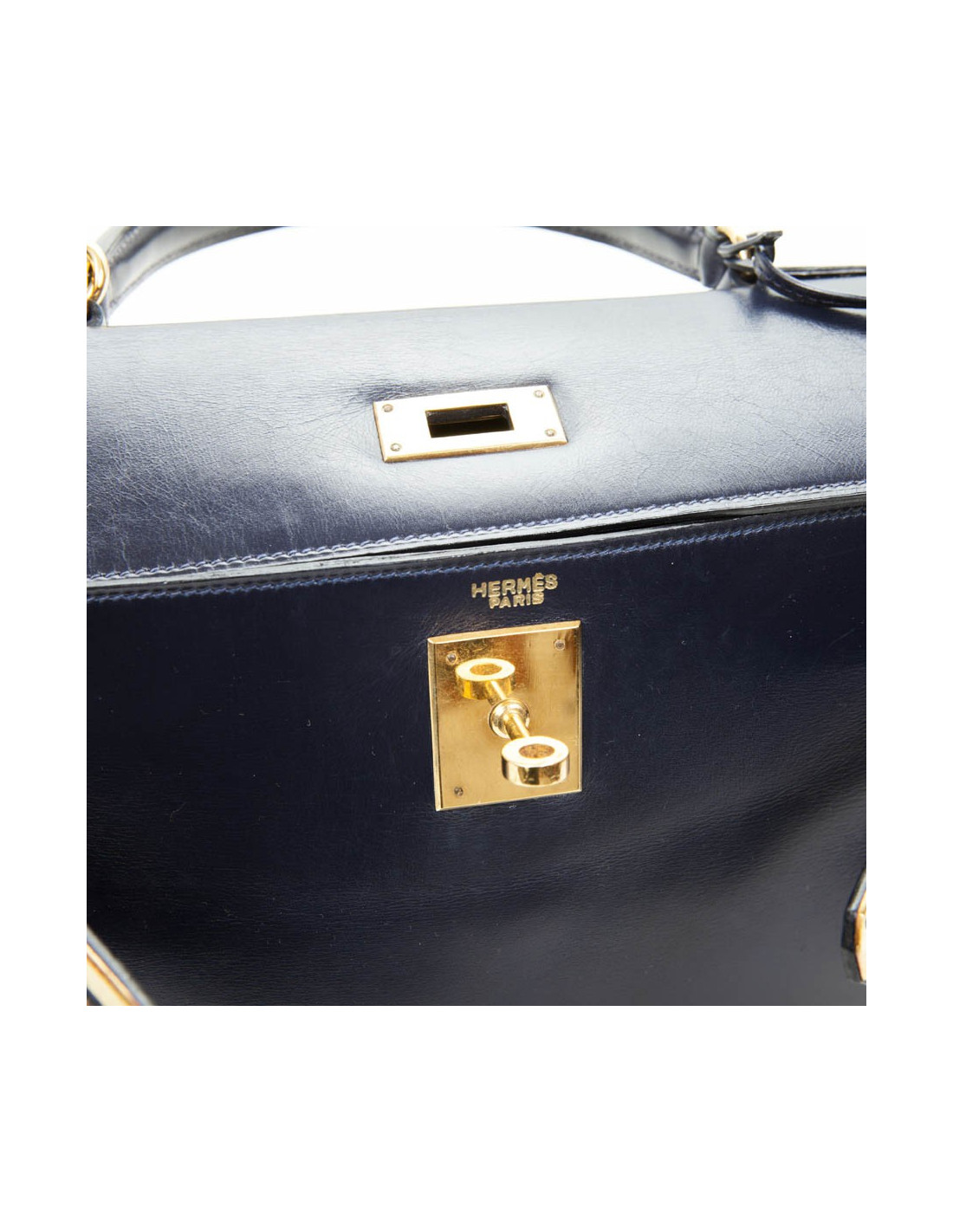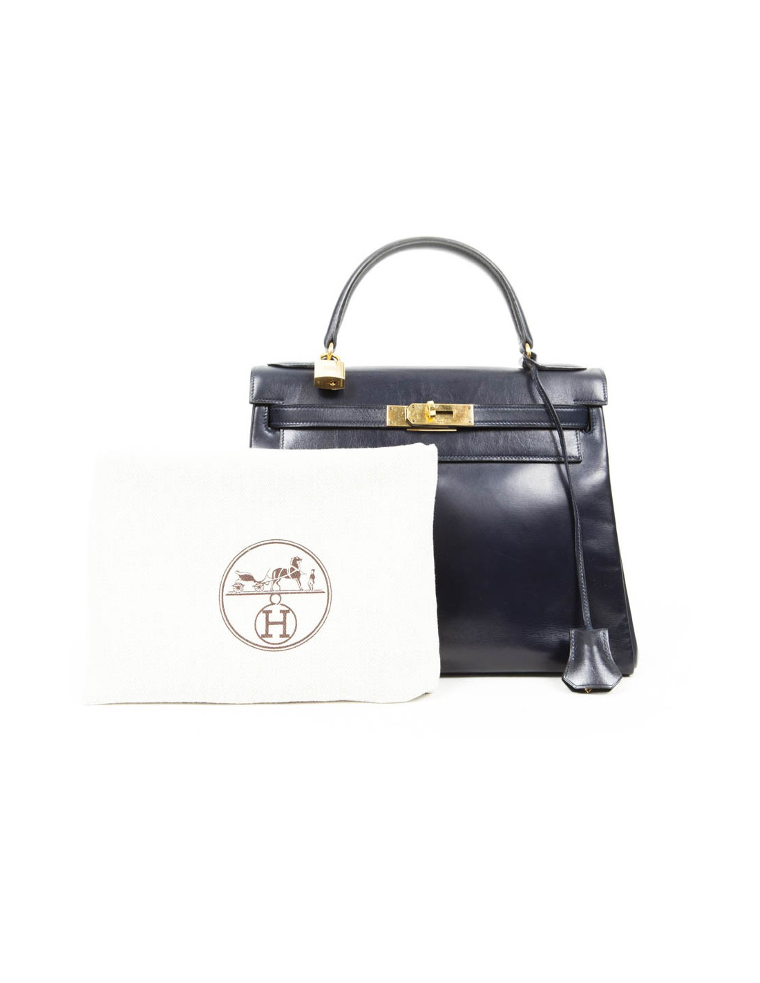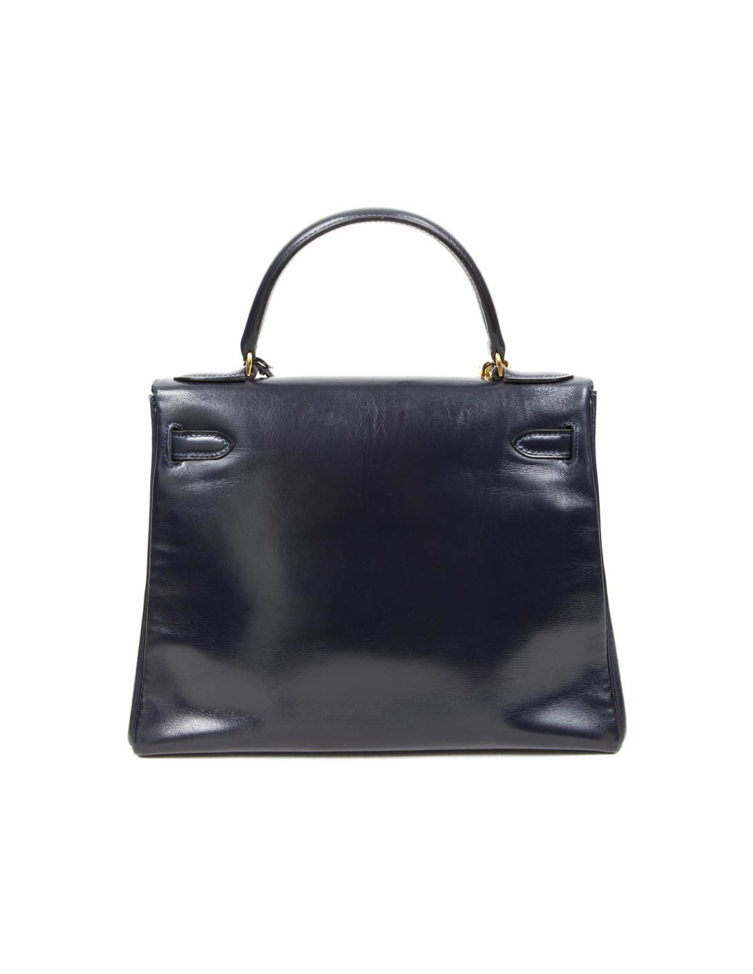 Exceptionnel! Kelly 28 de la Maison Hermès en cuir box bleu nuit. La bijouterie est en plaqué or. A l'intérieur, 3 poches plaquées dont une zippée (très bon état). Lettre A dans un rond.