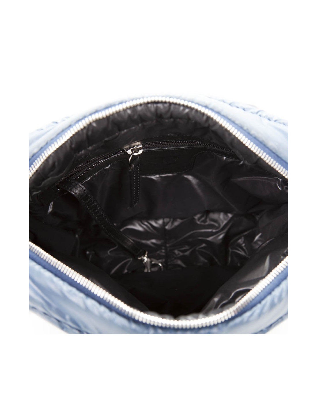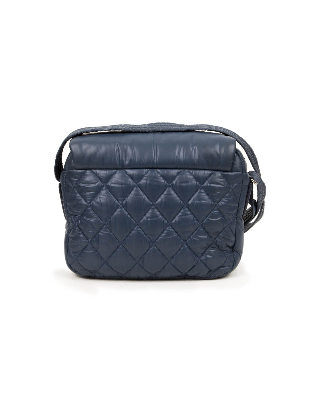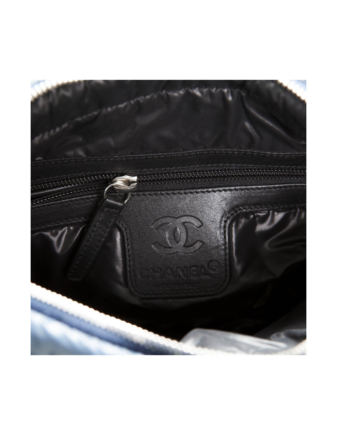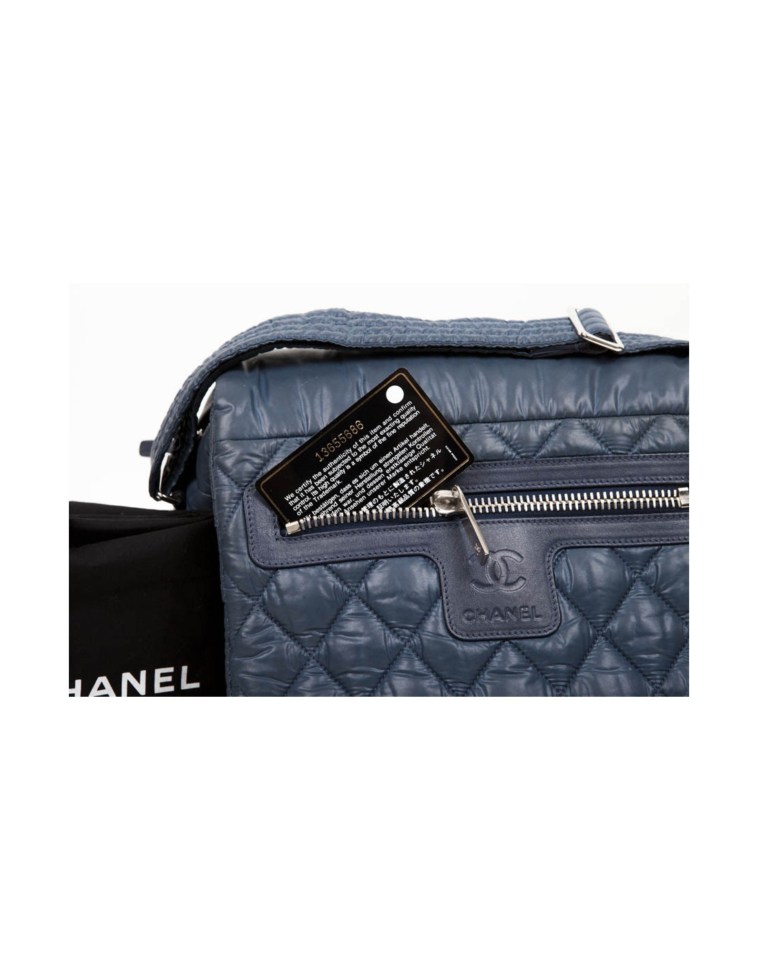 Sac 'Coco Cocoon' de la Maison Chanel en toile imperméable bleu gris (légèrement foncé par endroits, utilisation d'usage). La bijouterie est en métal argenté. Fermeture zippée. L'intérieur est noire avec une poche zippée. Il y a également une poche zippée à l'avant. Il se porte en crossover ou à l'épaule à l'aide d'une bandoulère réglable. Hologramme: 1365... et carte d'authenticité. En bon état. Toutes petites taches blanches sur le rabat à droite mais très peu visible. Voir photos.