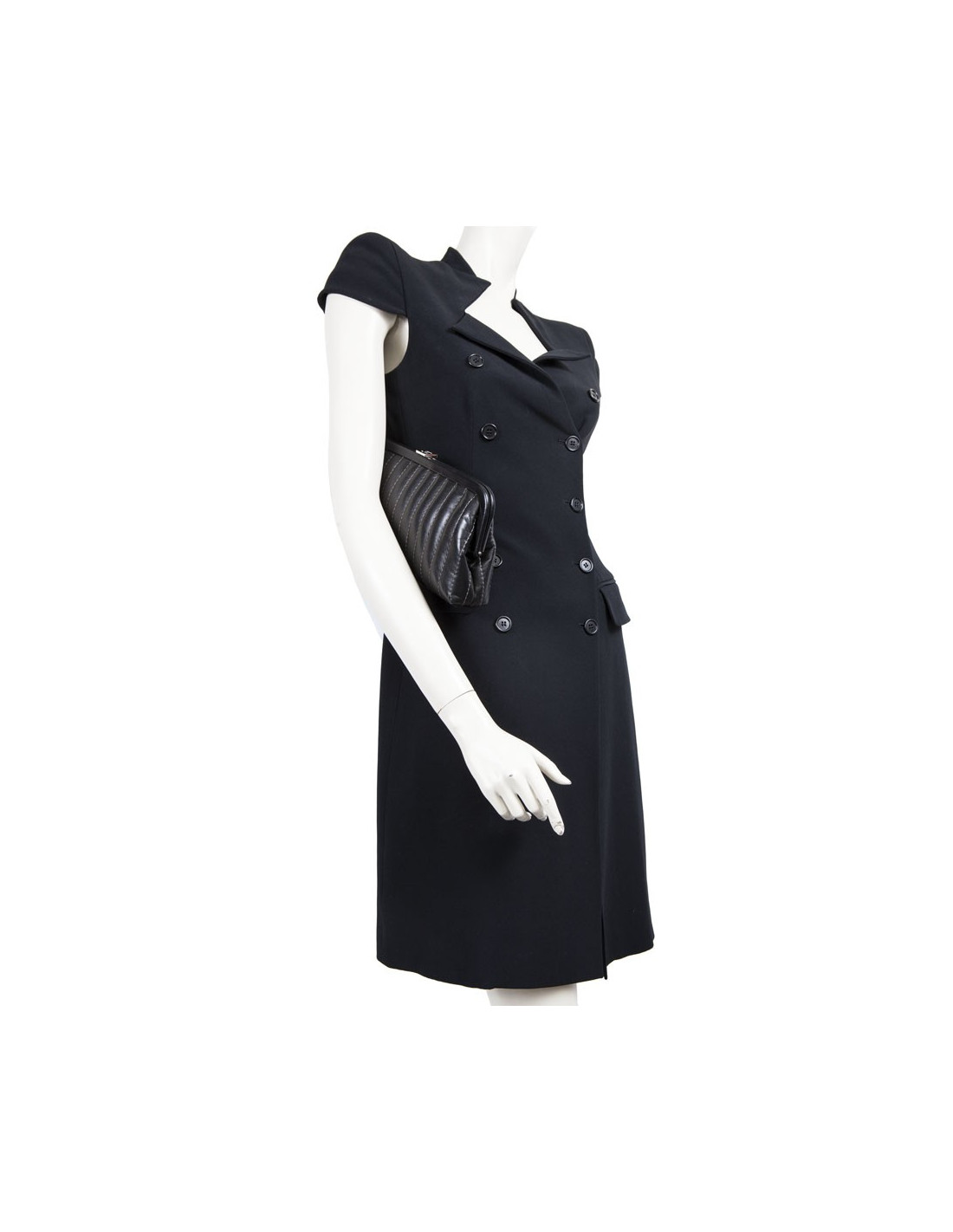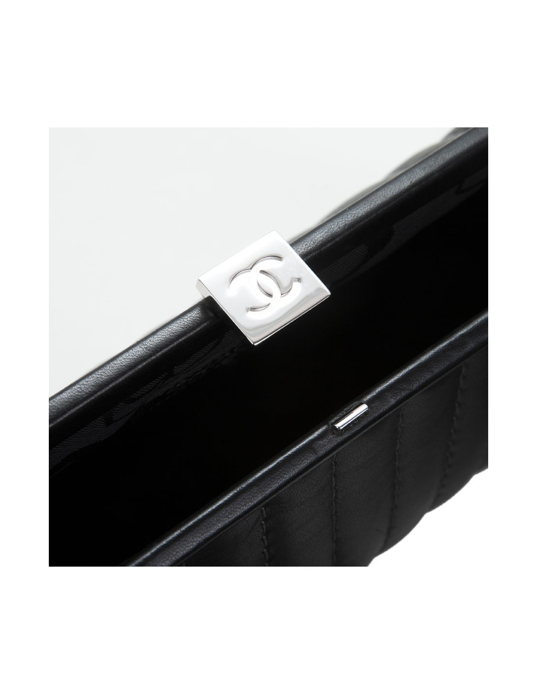 Pochette en cuir d'agneau lisse noir de la Maison Chanel. Fermoir CC en métal argenté. Surpiqûres grises. L'intérieur est en satin noir monogram. Hologramme: 1070.... En très bon état. Portée une fois.