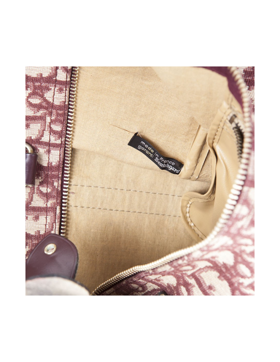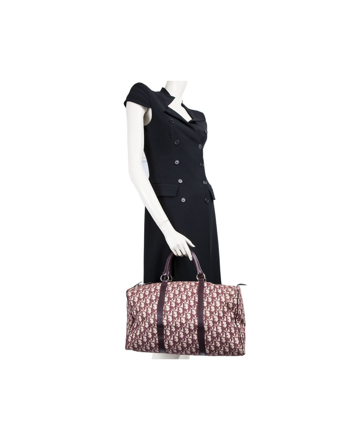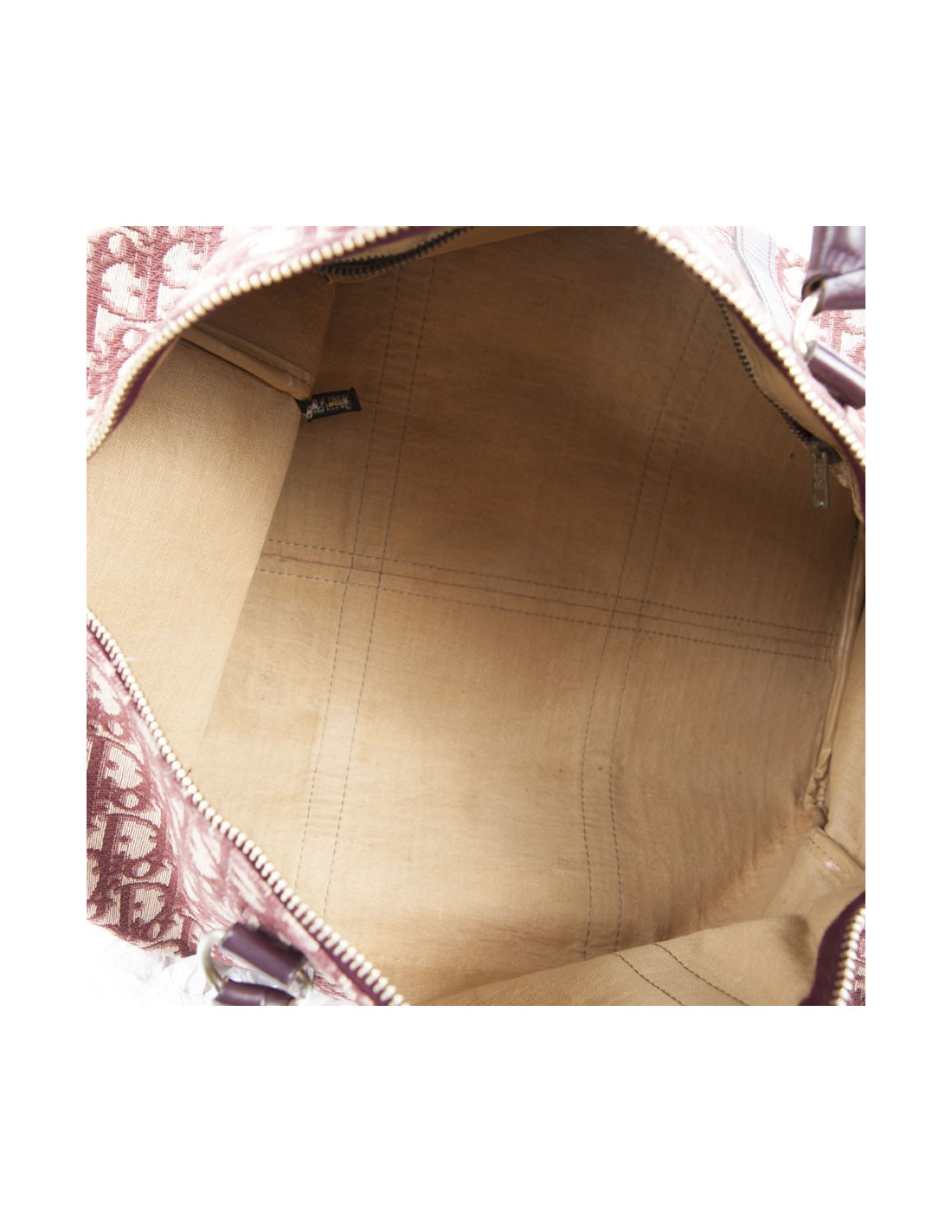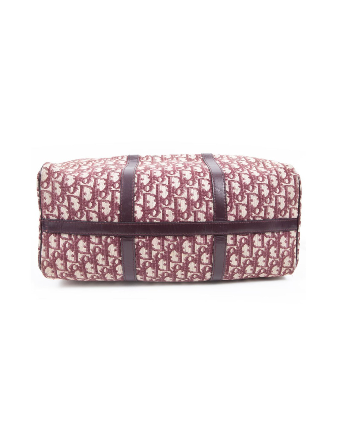 Vintage! Sac Boston de la Maison Christian Dior en toile monogram bordeaux. Fermeture zippée. La bijouterie est en métal doré vieilli. Etat vintage. Usure d'usage, en très bonne conservation.