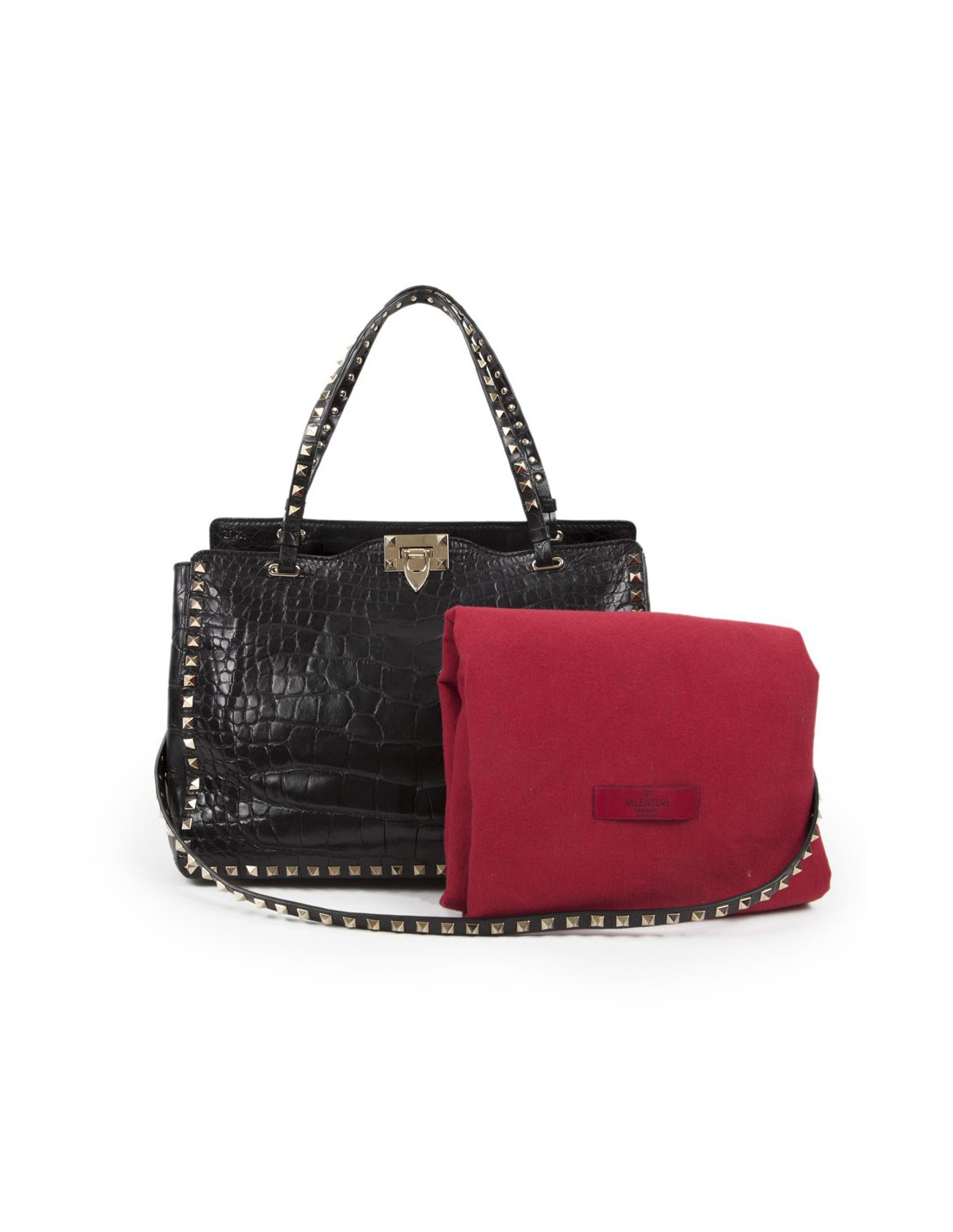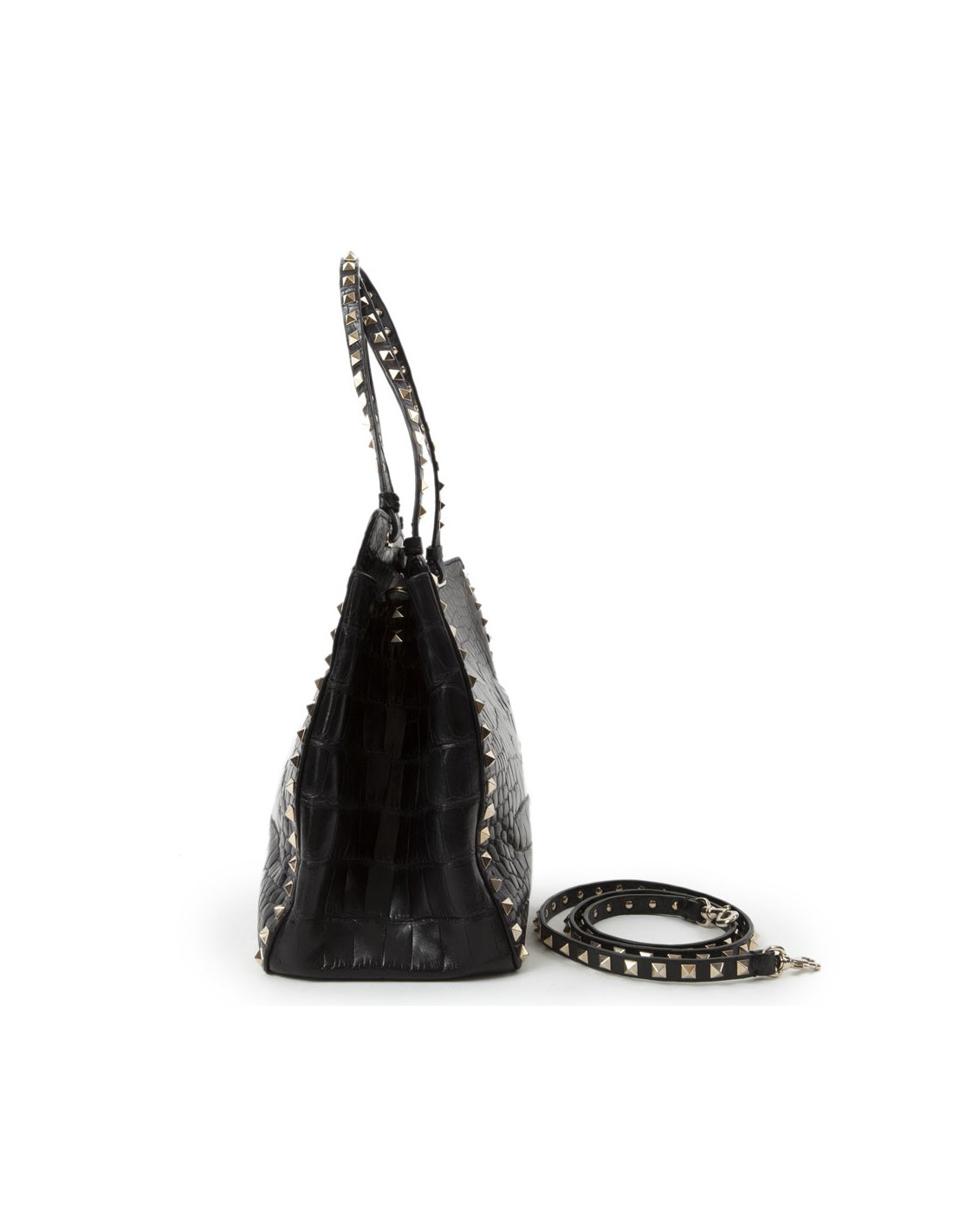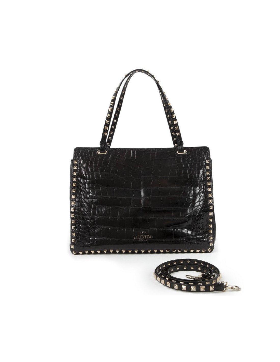 Sac à main trapèze "Rockstud" de la Maison Valentino Garavani en peau exotique crocodile noir semi- mat avec anses et bandoulière. Les finitions à clous sont dorées Rockstud, la fermeture : boucle dorée or pâle, la bandoulière : amovible, la poche intérieure : zippée et patch logo intérieur.