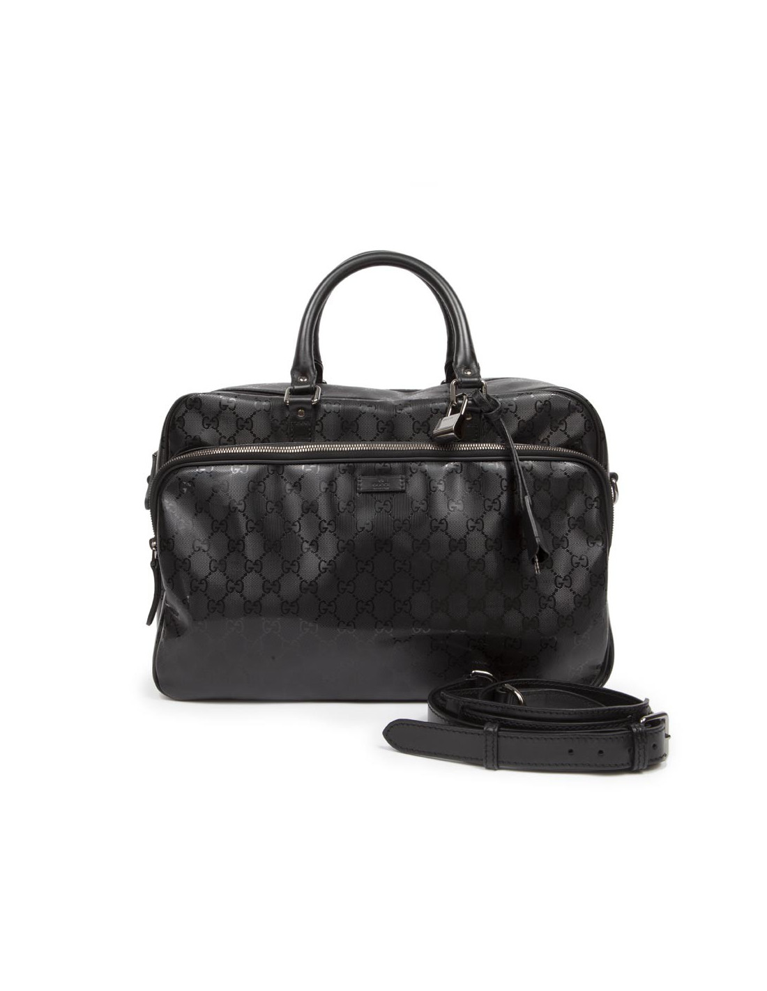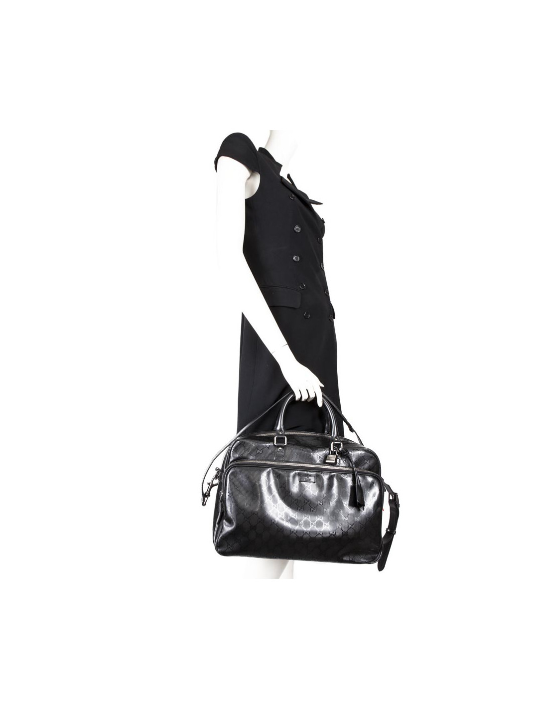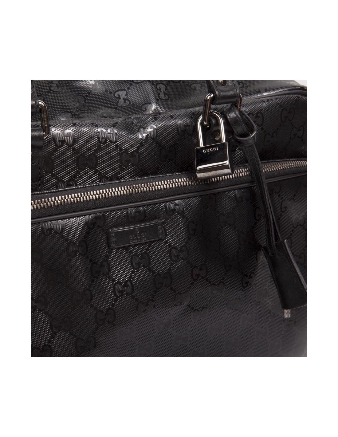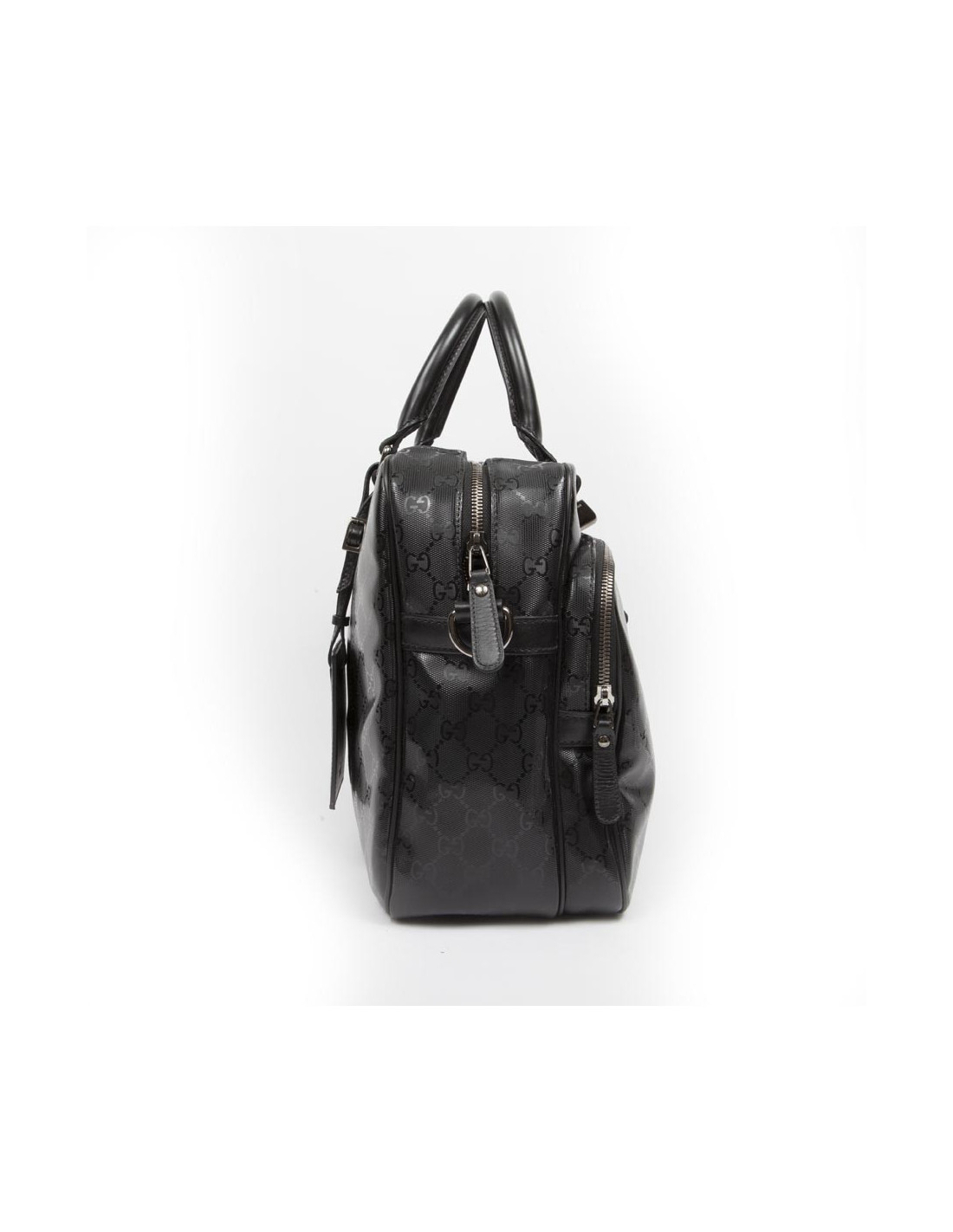 Sac cabas de la Maison Gucci en toile monogram brillante noire. La bijouterie est en métal argenté. Fermeture zippée. Il se porte à la main et à l'épaule à l'aide d'une bandoulière doublé en cuir amovible ( 1.20 cm). Les deux anses sont en cuir noir.