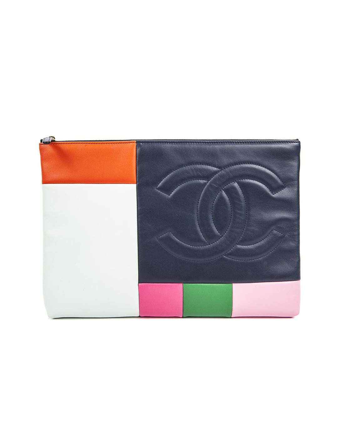 Cette pochette CHANEL est en cuir d'agneau lisse multicolore. La fermeture est zippée et dorée. L'intérieur est matelassé en toile parachute bleue.